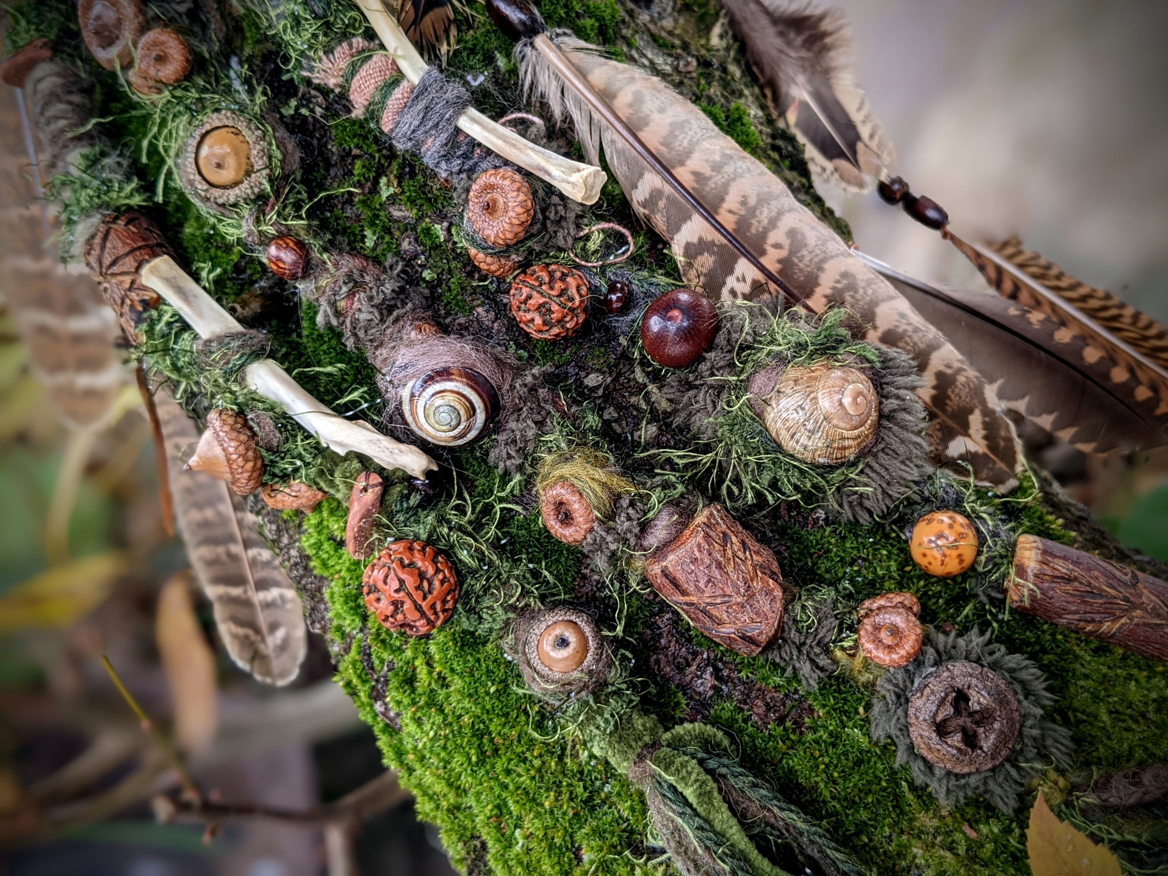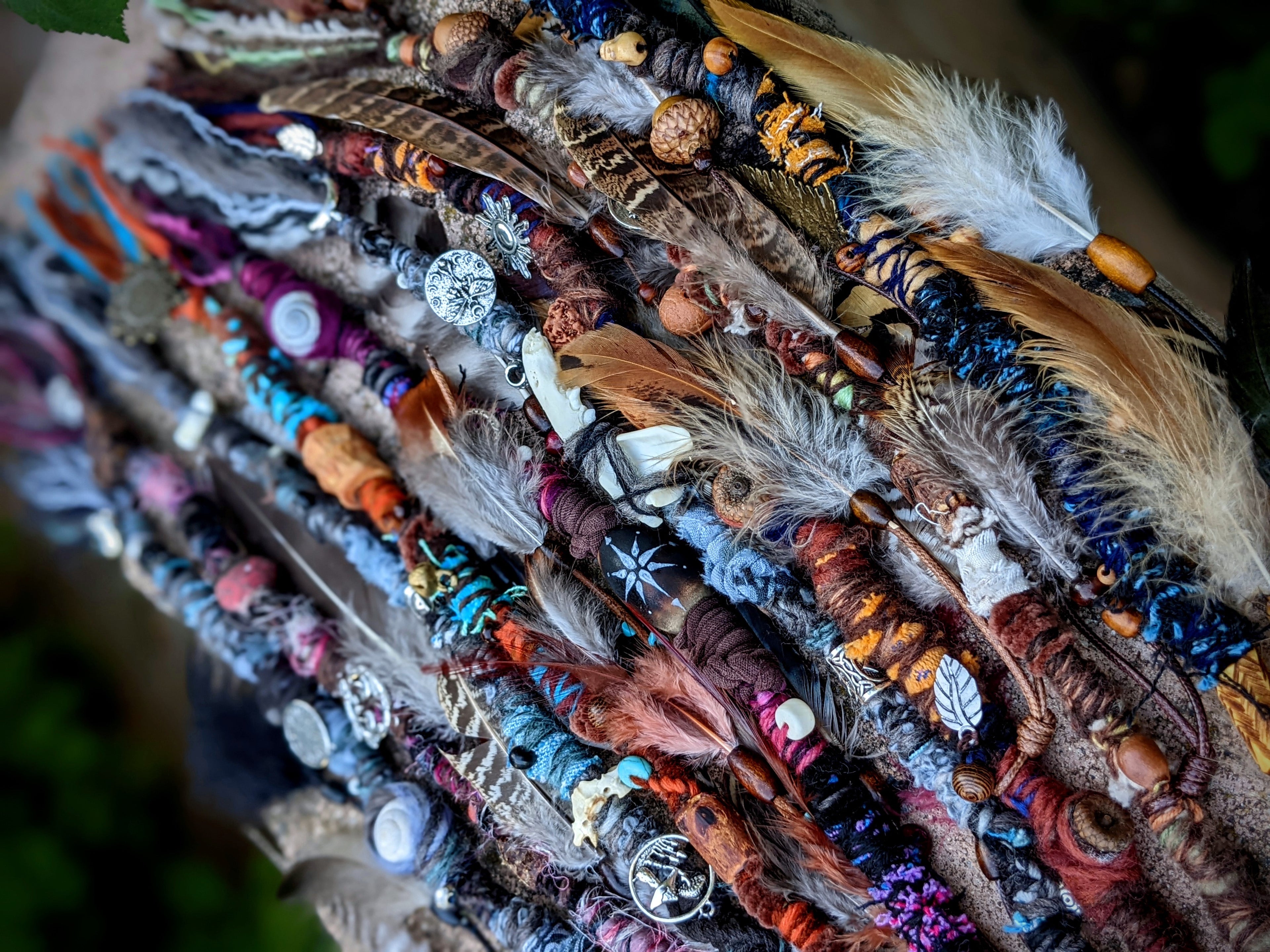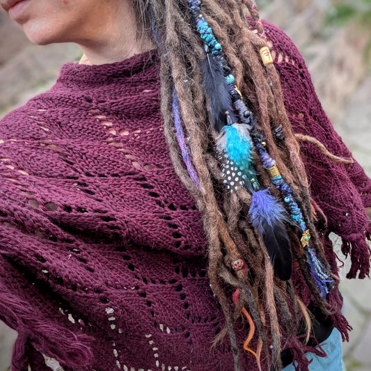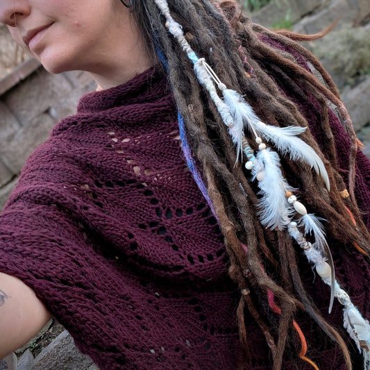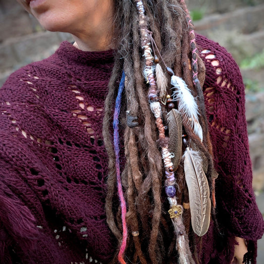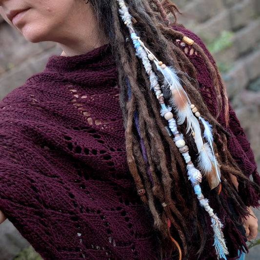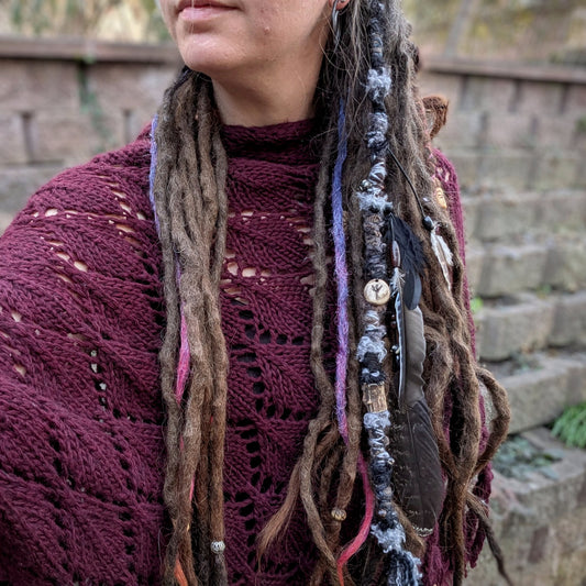 Decorative dreadlocks made from leftover yarn, sheep's wool and fabric scraps. They can be easily attached to any hairstyle using a small elastic band that is included with each wrap.