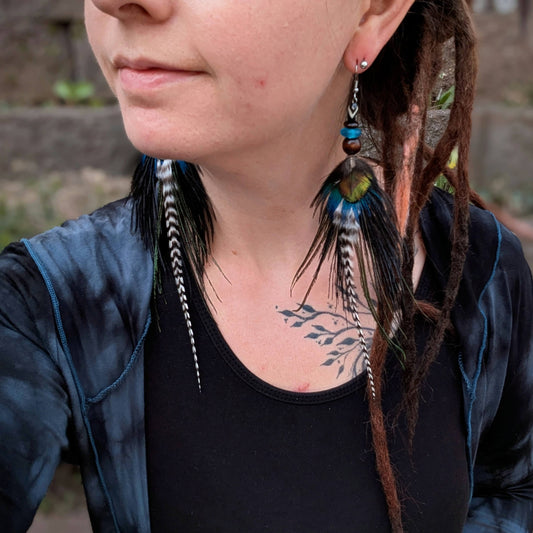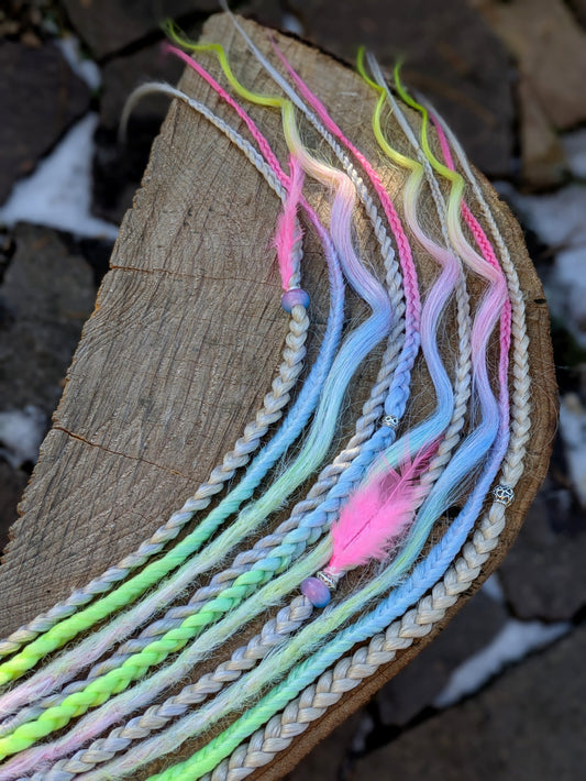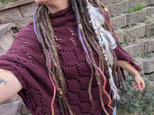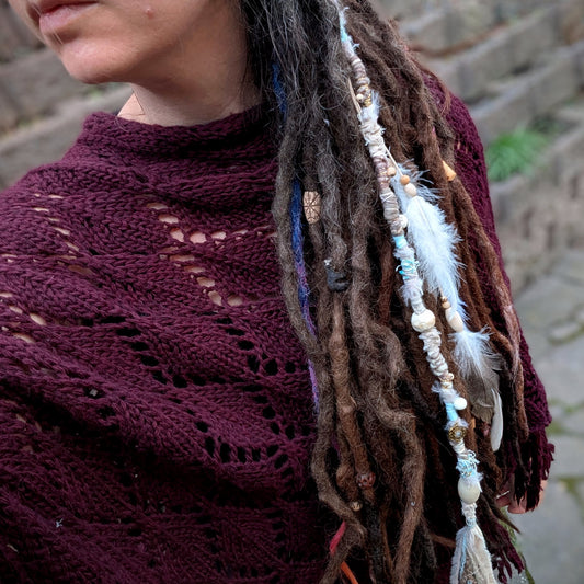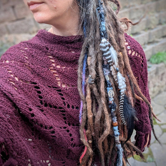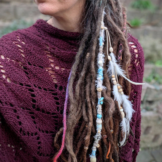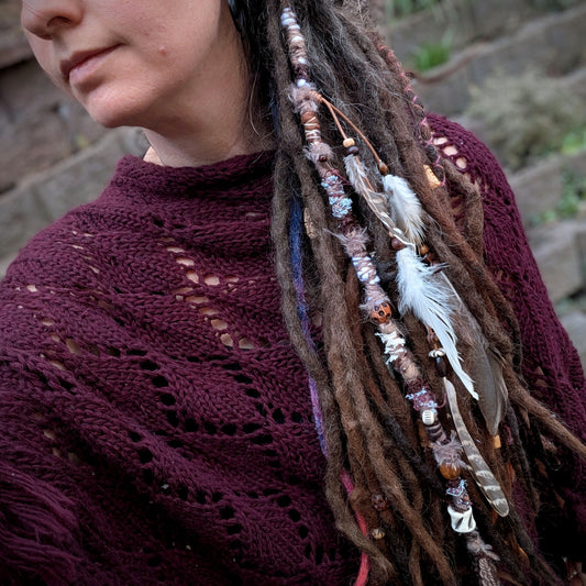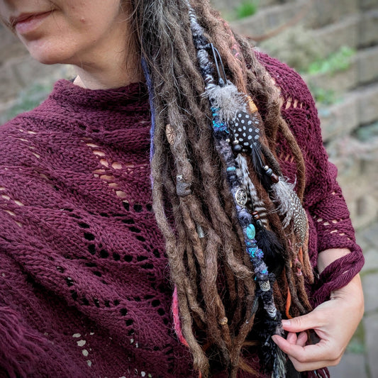 Decorative dreadlocks made from leftover yarn, sheep's wool and fabric scraps. They can be easily attached to any hairstyle using a small elastic band that is included with each wrap.