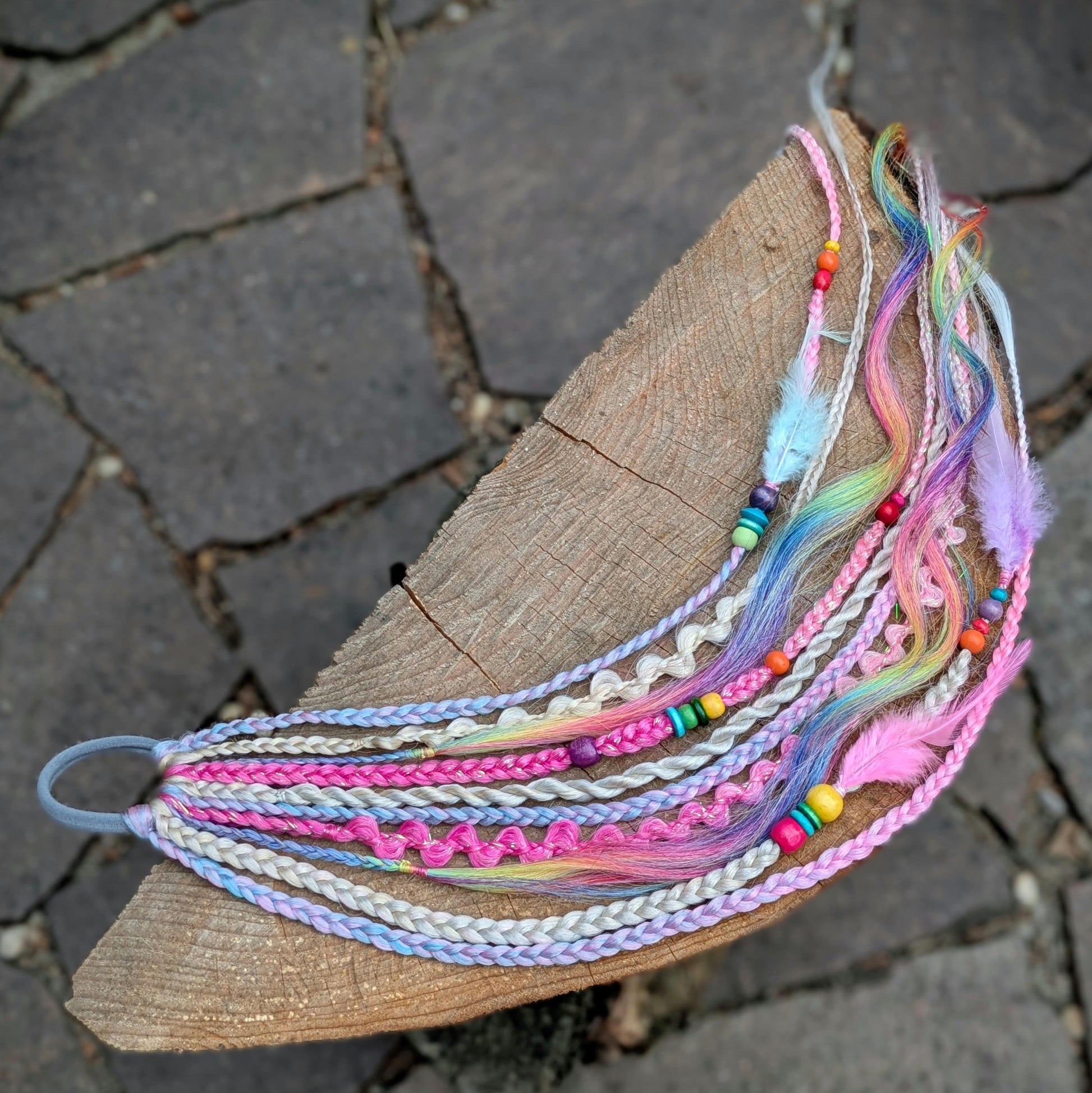 Šedá gumička s dohromady 10 copánky různých struktur ve veselé duhové kombinaci barev. Zdobeno dřevěnými korálky a pírky.
