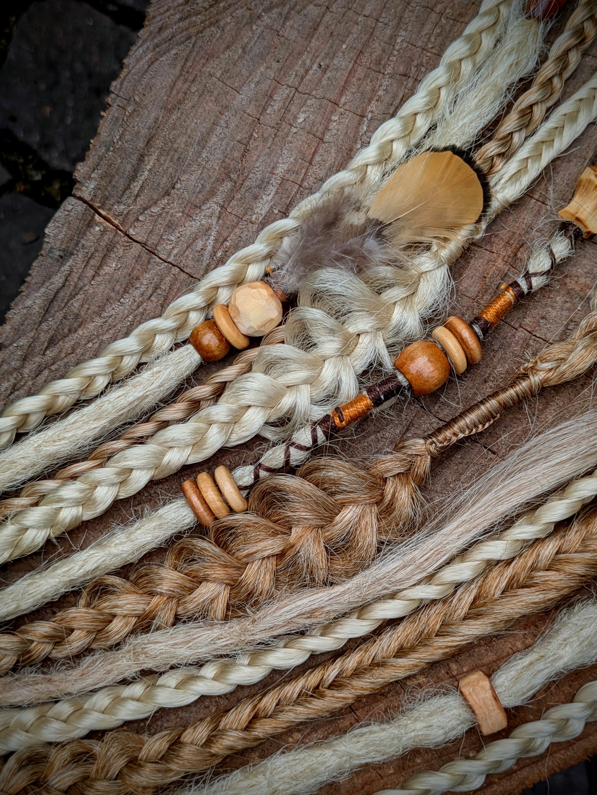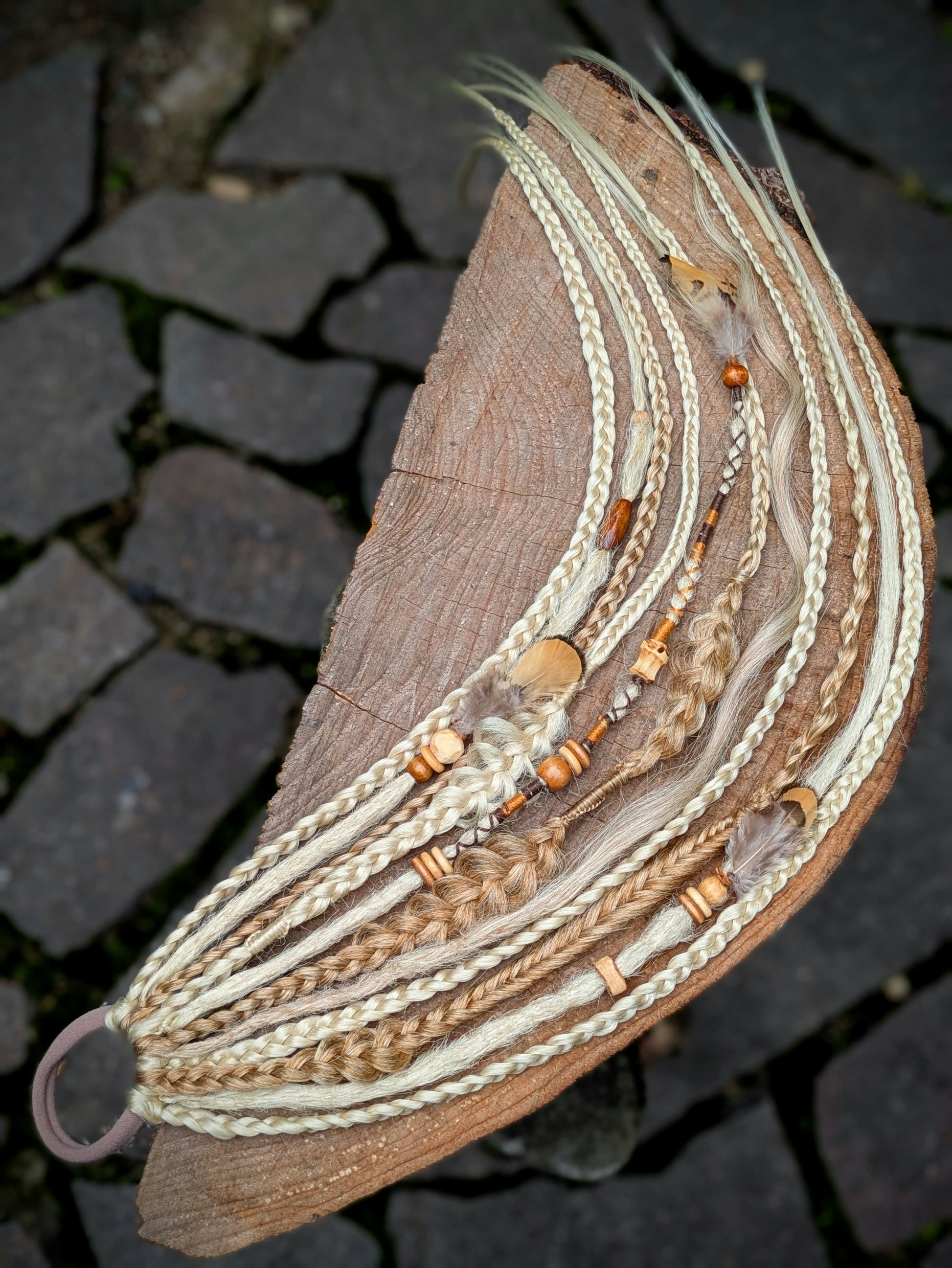 Béžová gumička s dohromady 7 copánky různých struktur a 3 dready a 1 dreadovlnkou v kombinaci plavé a medové blond. Zdobeno dřevěnými korálky, bavlnkou a pírky. délka 60 cm