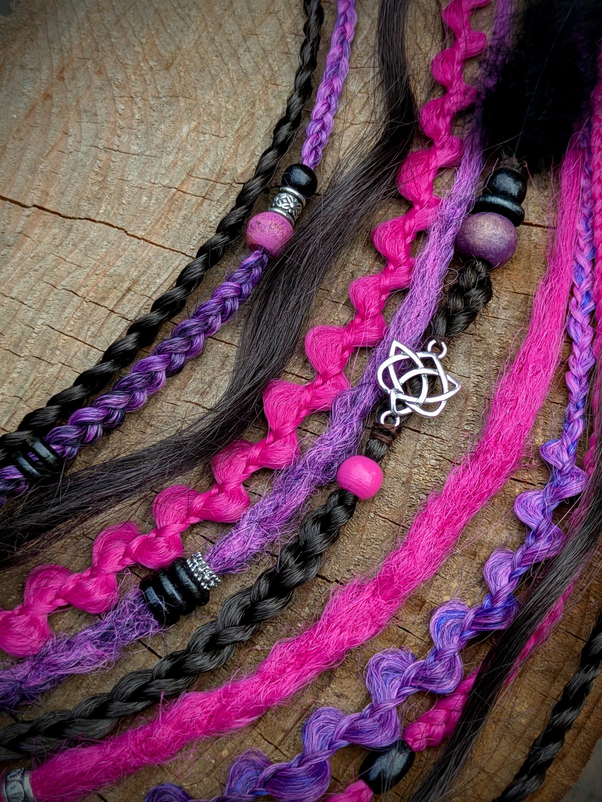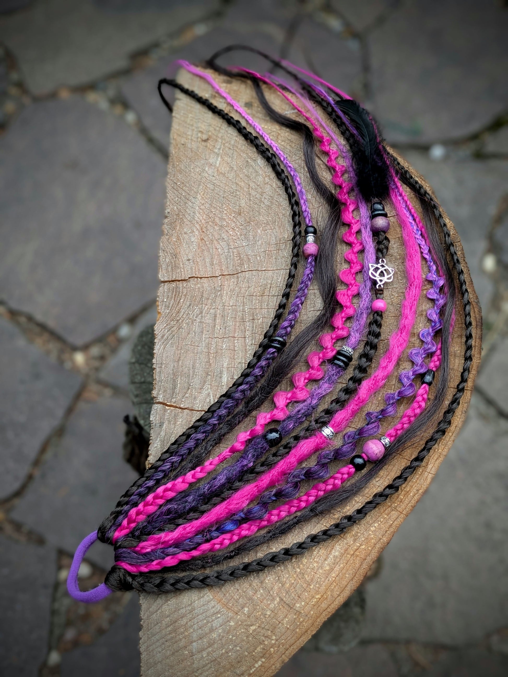 Fialová gumička s dohromady 7 copánky různých struktur a 4 dready v kombinaci černohnědé, magenty a fialové. Zdobeno dřevěnými a kovovými korálky a pírky.délka 60 cm