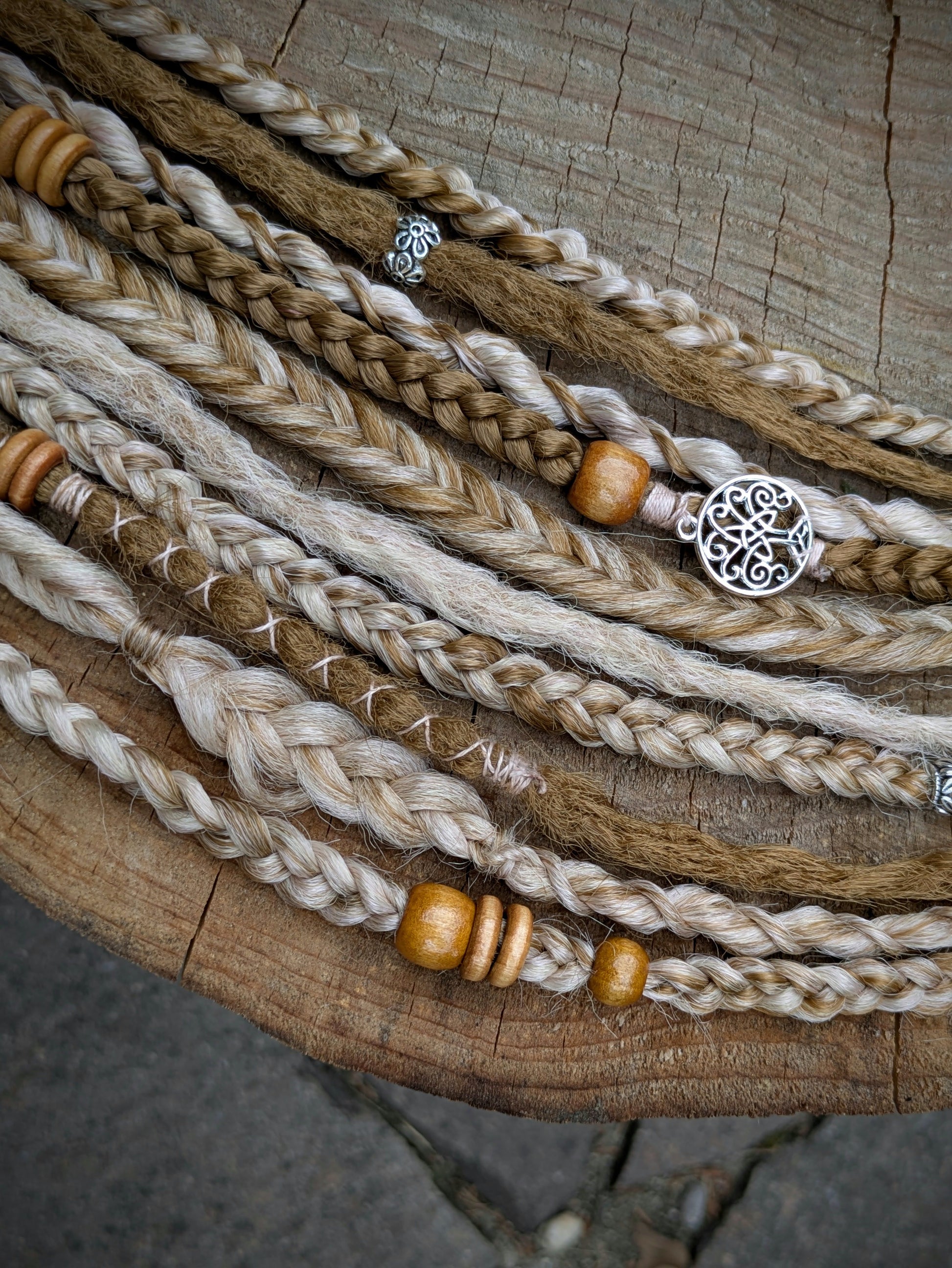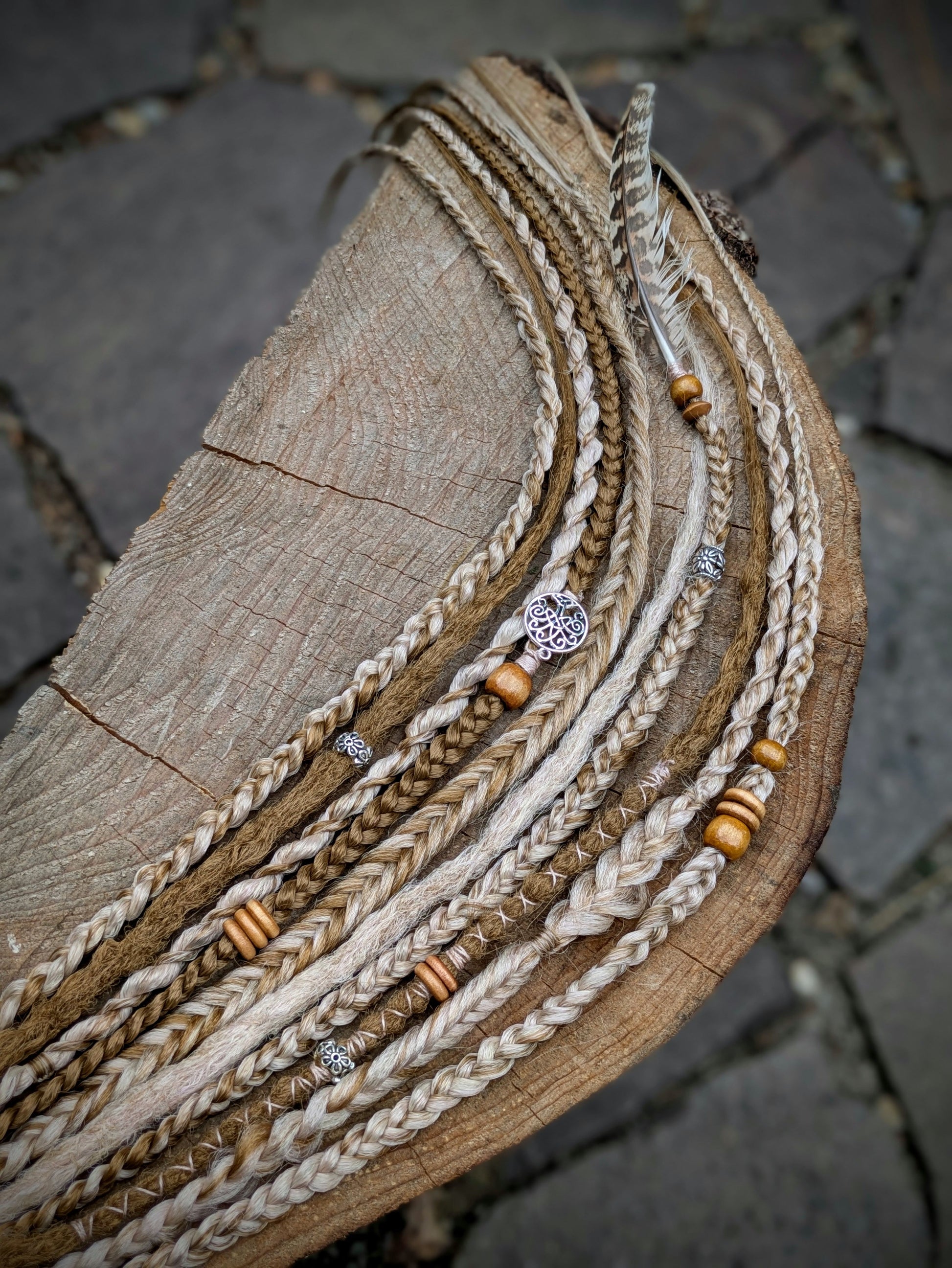 Hnědá gumička s dohromady 7 copánky různých struktur a 3 dready v kombinaci medové a blond. Zdobeno dřevěnými a kovovými korálky, bavlnkou a pírky.