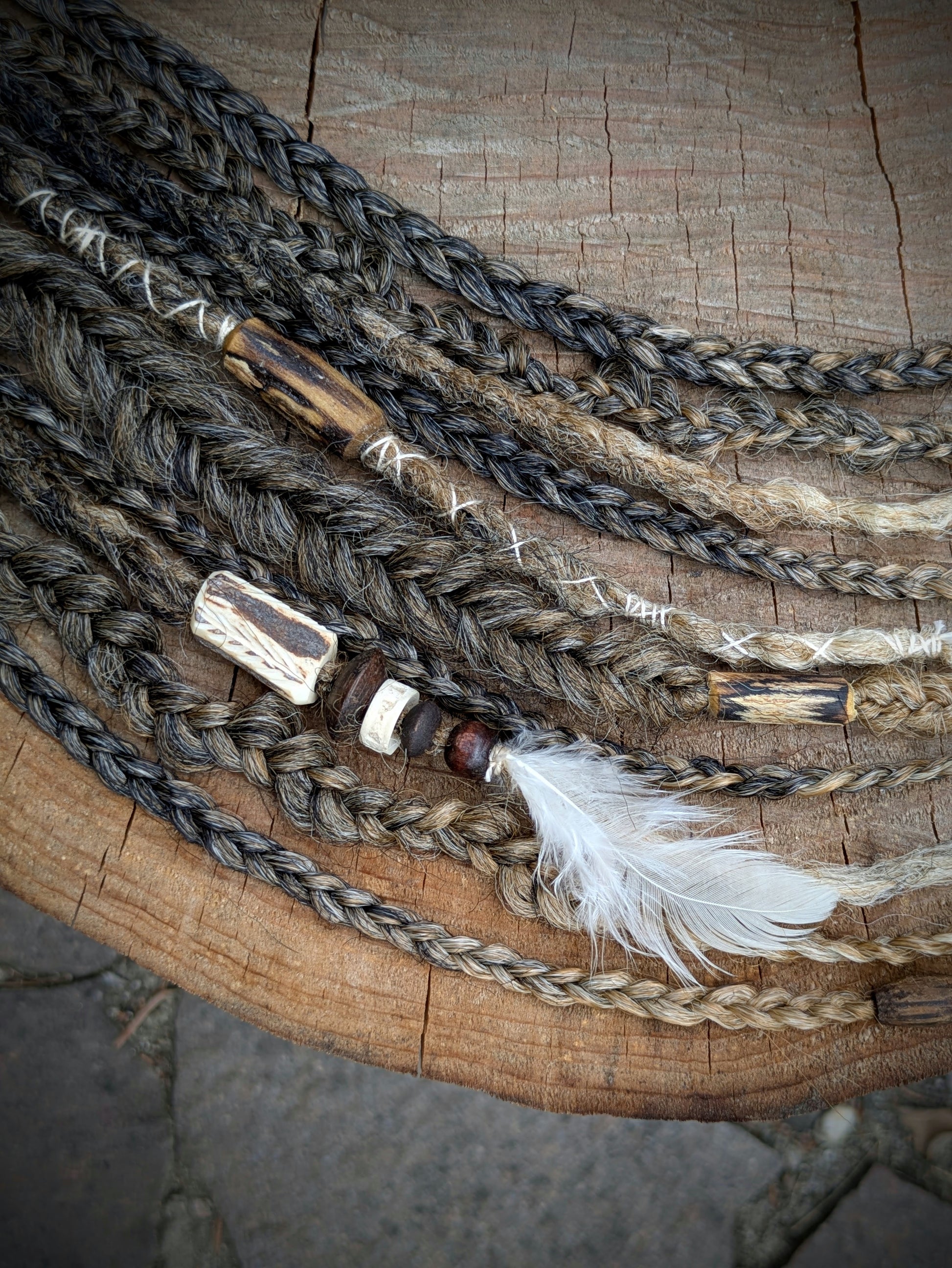 Hnědá gumička s dohromady 7 copánky různých struktur a 3 dready v kombinaci hnědé a blond. Zdobeno dřevěnými a kostěnými korálky, bavlnkou a pírky.délka 60 cm
