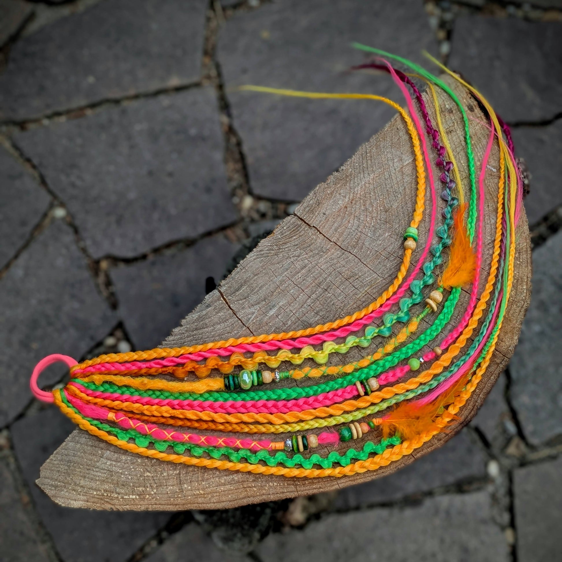 Gumička s dohromady 9 copánky různých struktur a 2 dready v kombinaci oranžové, zelené a UV aktivní růžové. Zdobeno dřevěnými, skleněnými a kovovými korálky a pírky. délka 65 cm