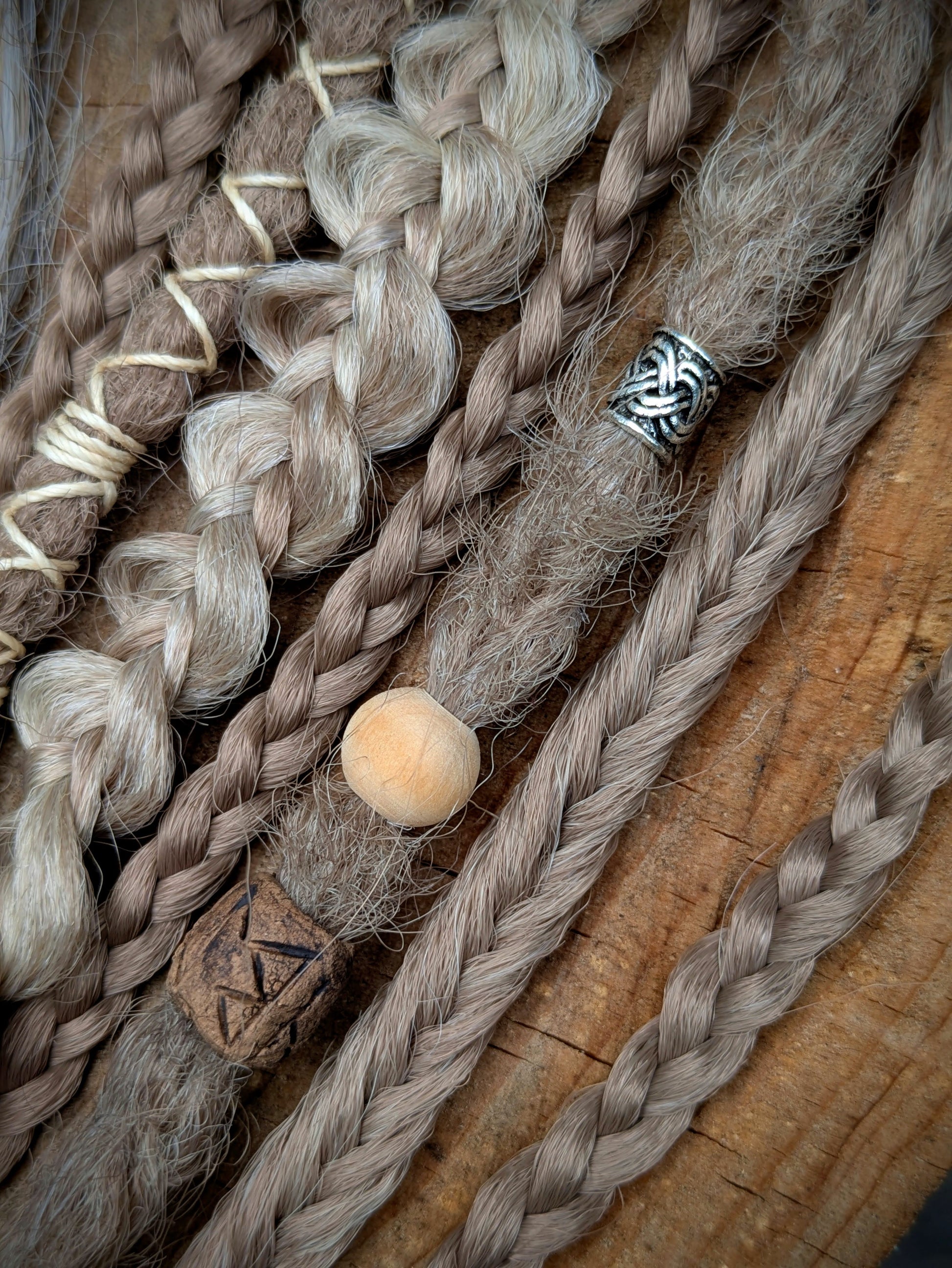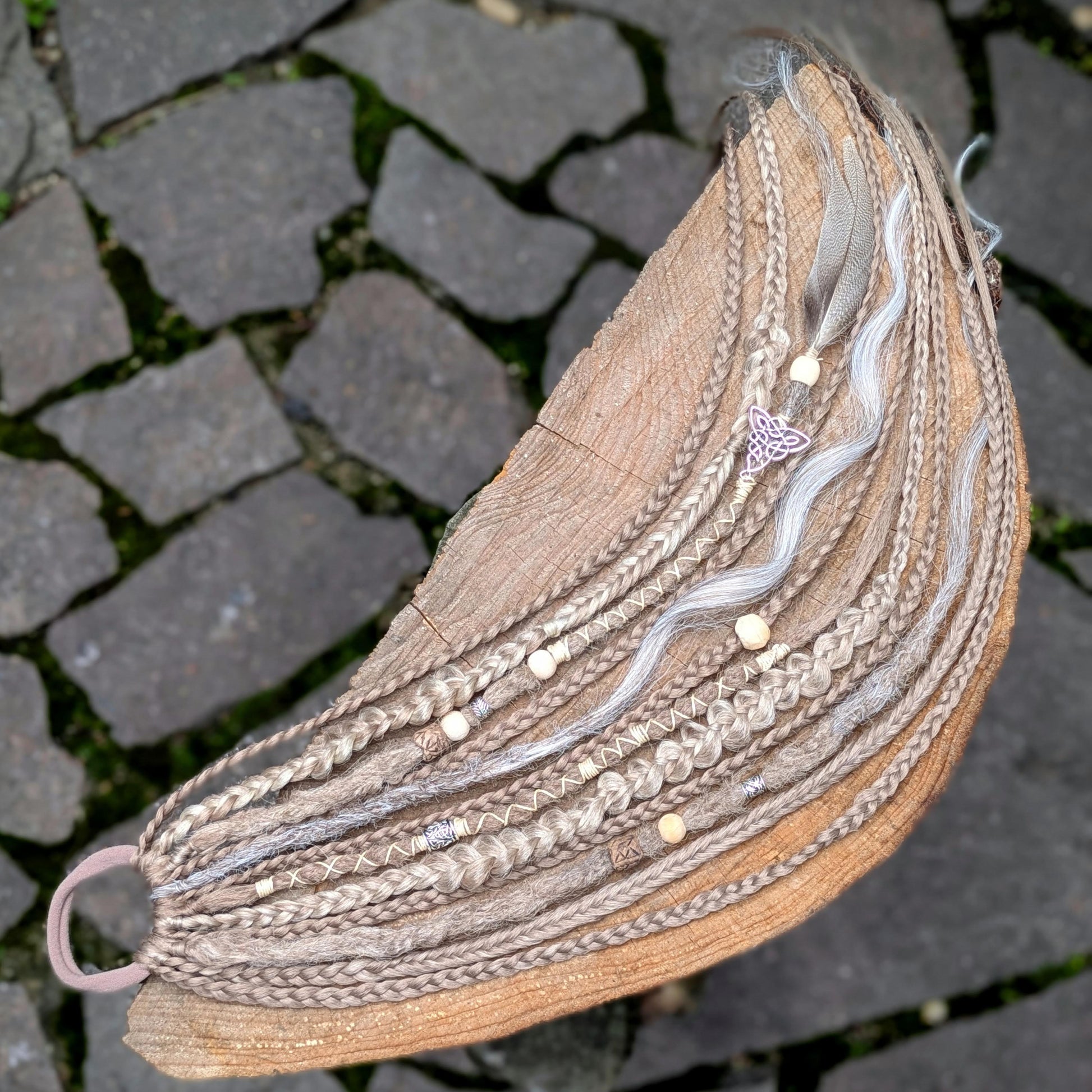 Béžová gumička s dohromady 8 copánky různých struktur a 3 dready a 1 dreadovlnkou v kombinaci platinové a špinavé blond. Zdobeno dřevěnými, keramickými a kovovými korálky, bavlnkou a pírky. délka 60 cm