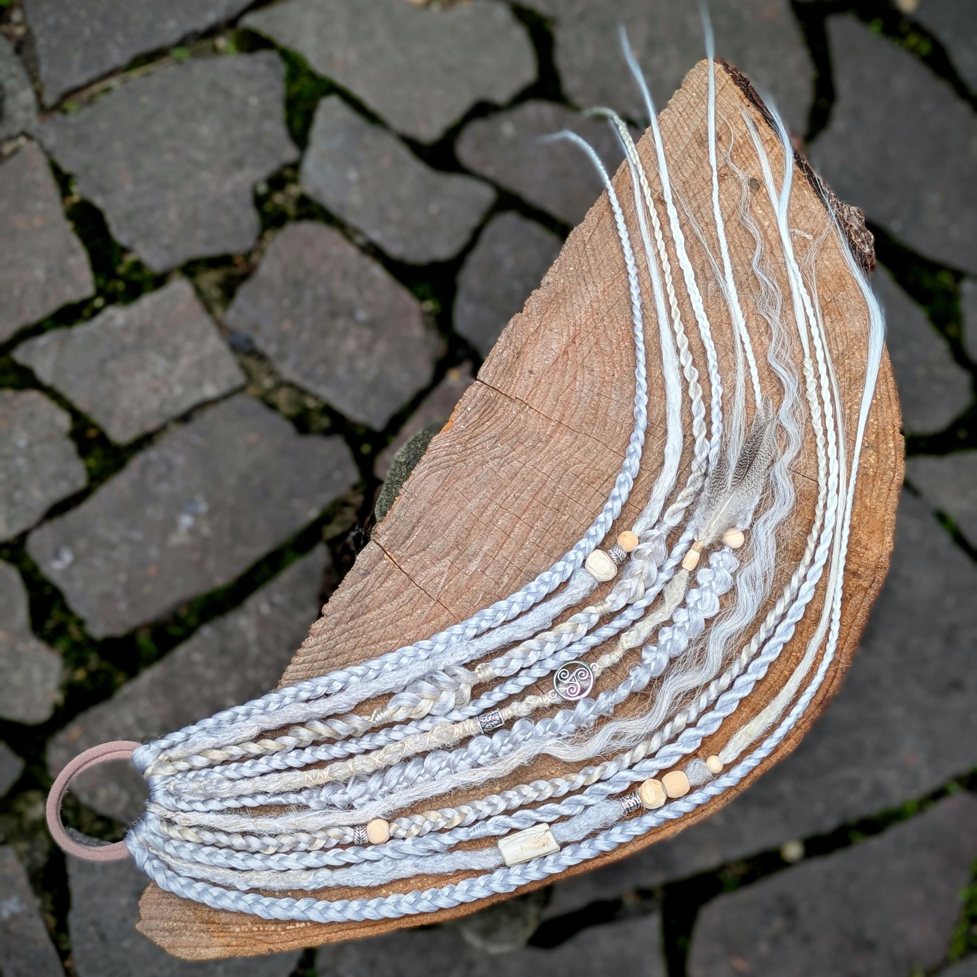 Béžová gumička s dohromady 7 copánky různých struktur a 3 dready a 1 dreadovlnkou v kombinaci ledové a platinové blond. Zdobeno dřevěnými a kovovými korálky, křišťálem, bavlnkou a pírky. délka 60 cm