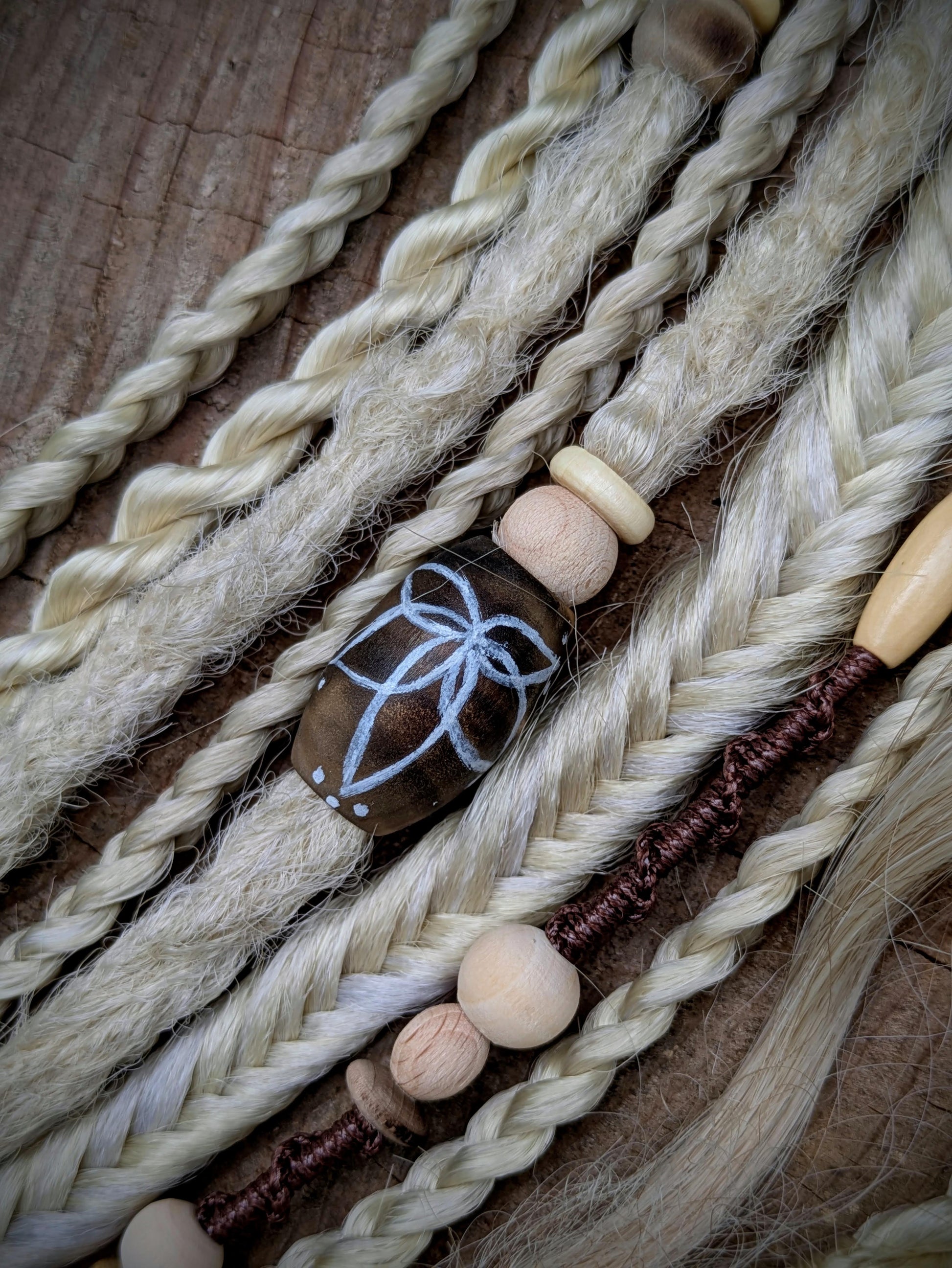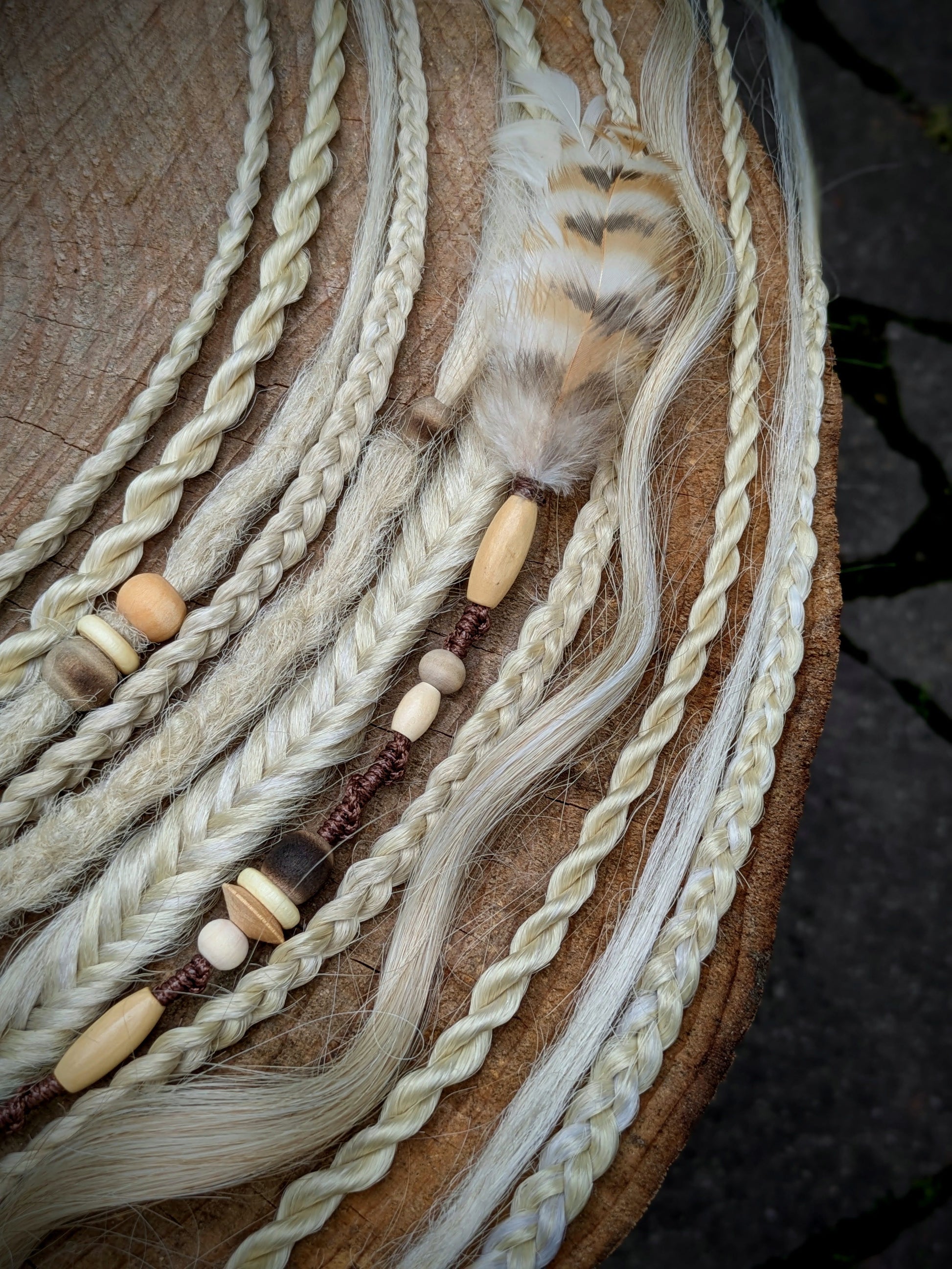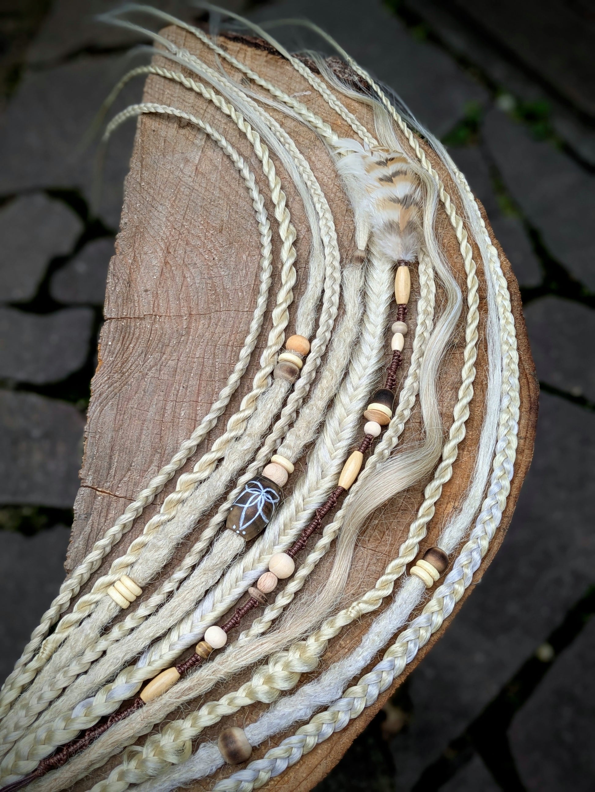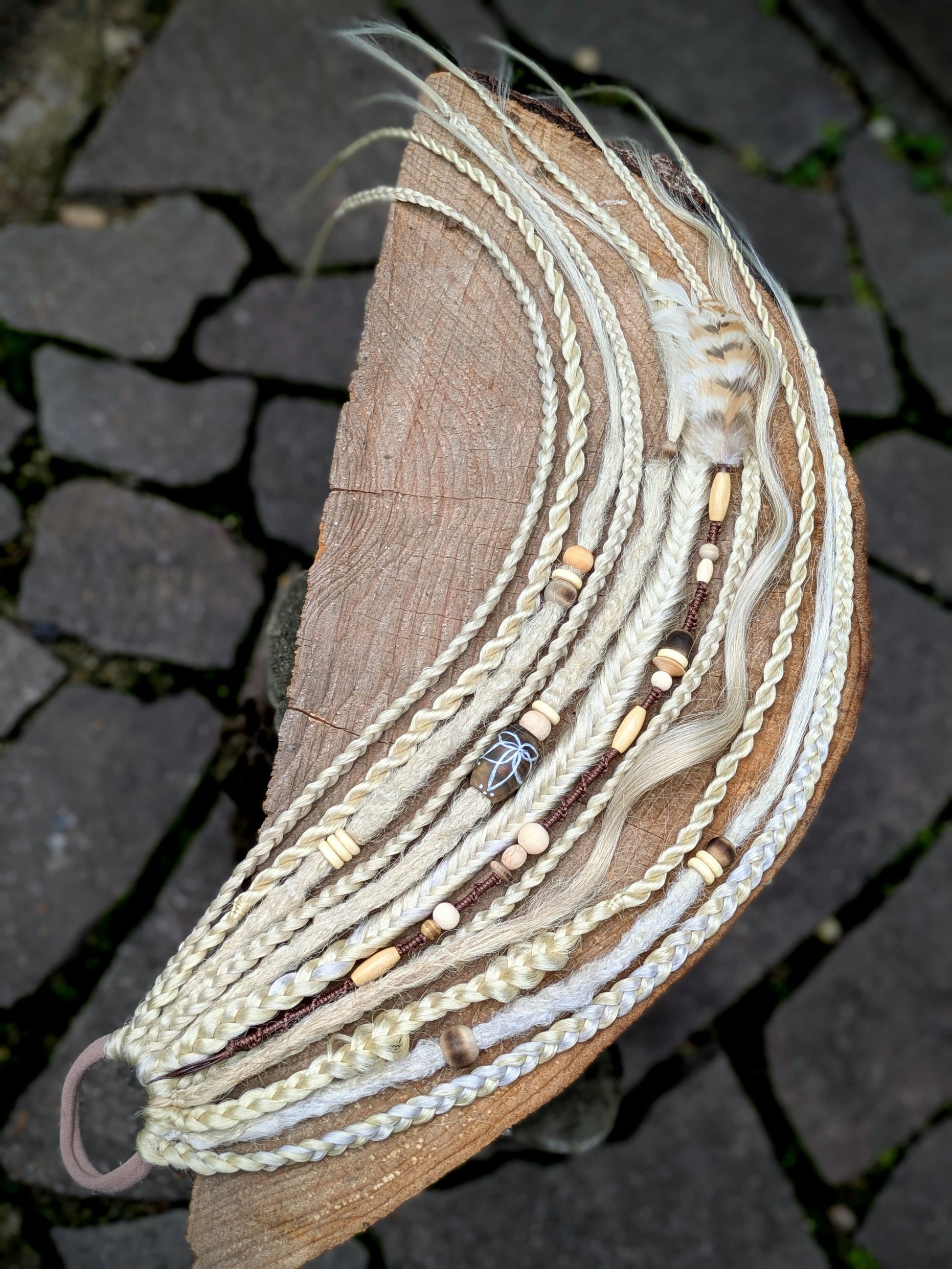 Béžová gumička s dohromady 7 copánky různých struktur a 3 dready a 1 dreadovlnkou a 1 sundávacím hairwrapem v kombinaci plavé a platinové blond. Zdobeno dřevěnými korálky, bavlnkou a pírky. délka 60 cm