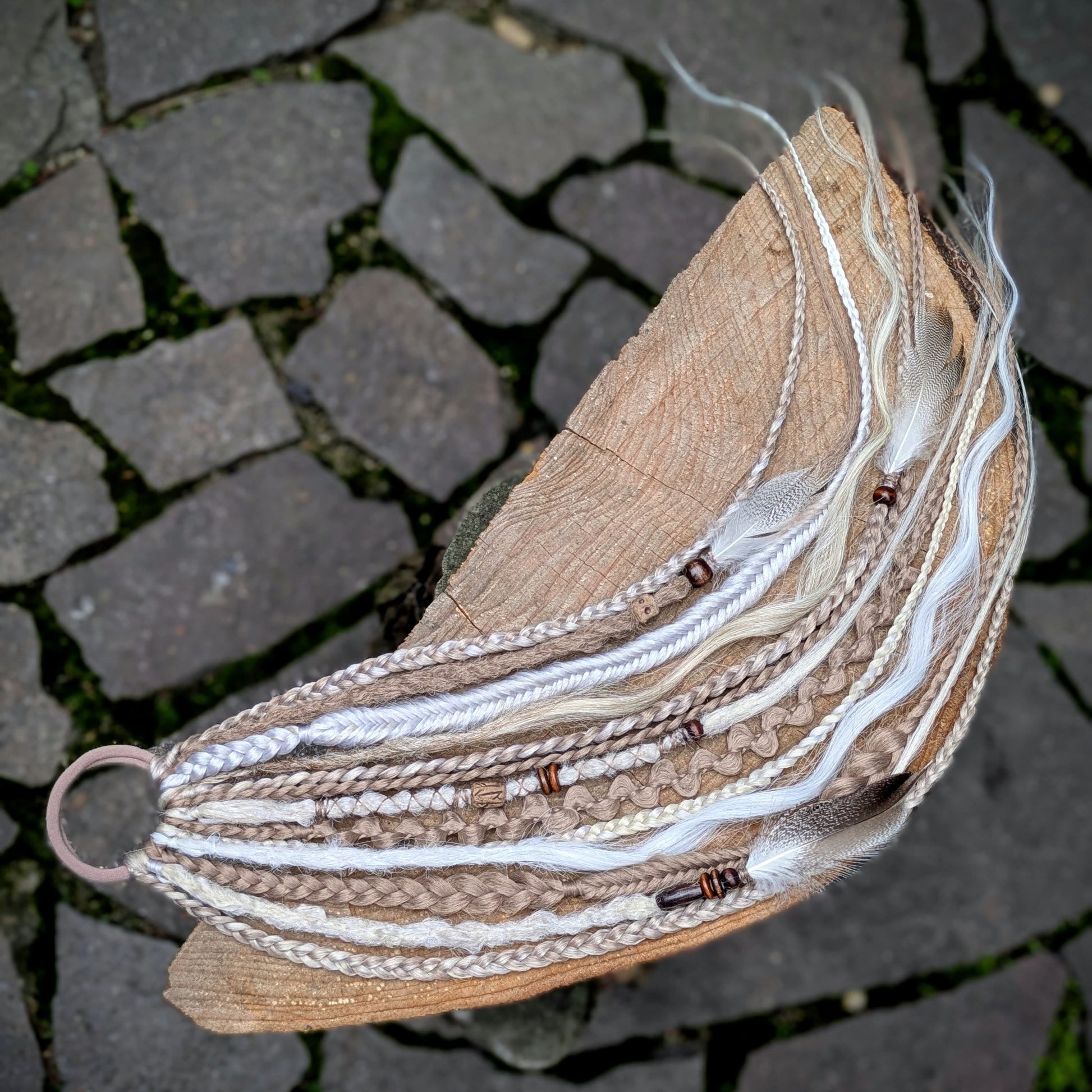 Béžová gumička s dohromady 8 copánky různých struktur a 3 dready a 2 dreadovlnkami v kombinaci špinavé, platinové a ledové blond. Zdobeno dřevěnými a keramickými korálky, bavlnkou a pírky. délka 60 cm