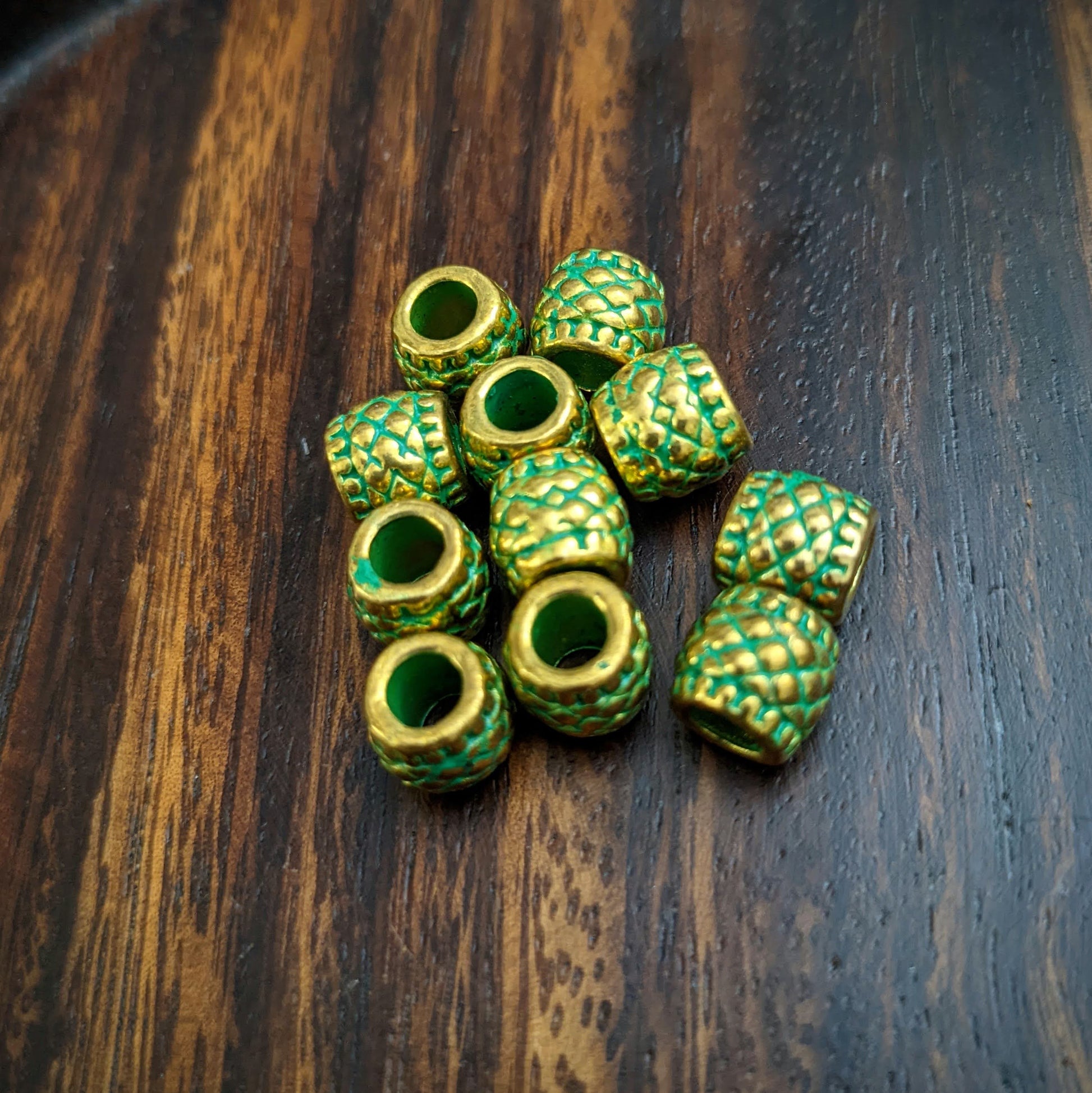 Kovové korálky zlaté barvy se zelenou patinou vhodné na tenčí dready.