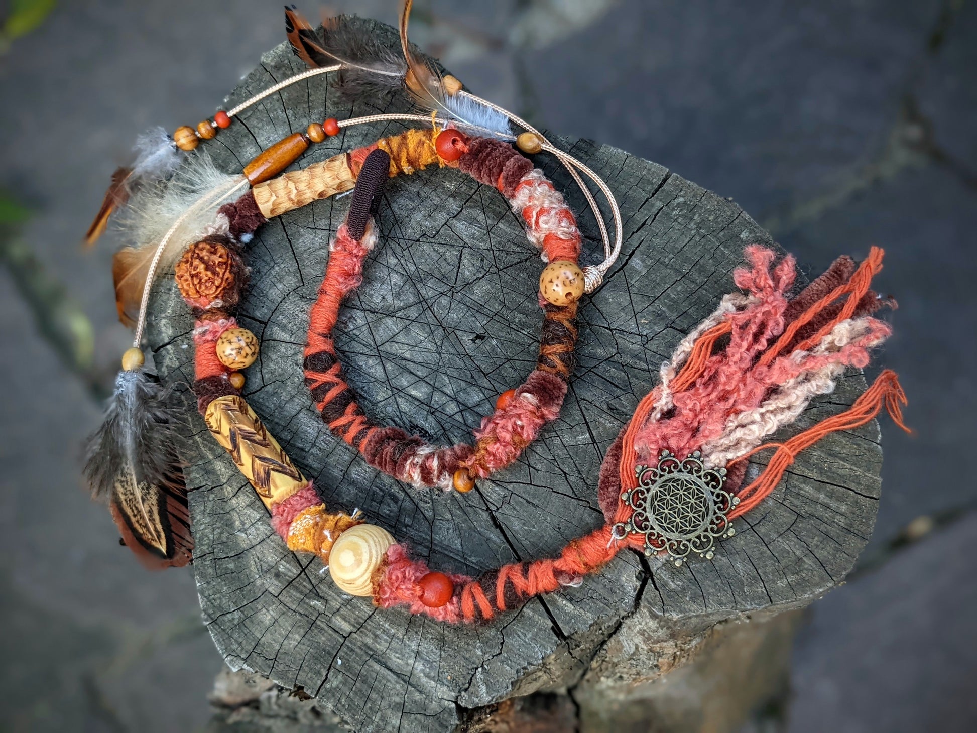 Ozdobný dread vyrobený z příze a recyklovaných látek. Zdobeno dřevěnými korálkami, semínky, kovovou mandalou a pírkovým závěsem, který jde z dreadu sundat a použít i samostatně jako pírková ozdoba do vlasů/dreadů.