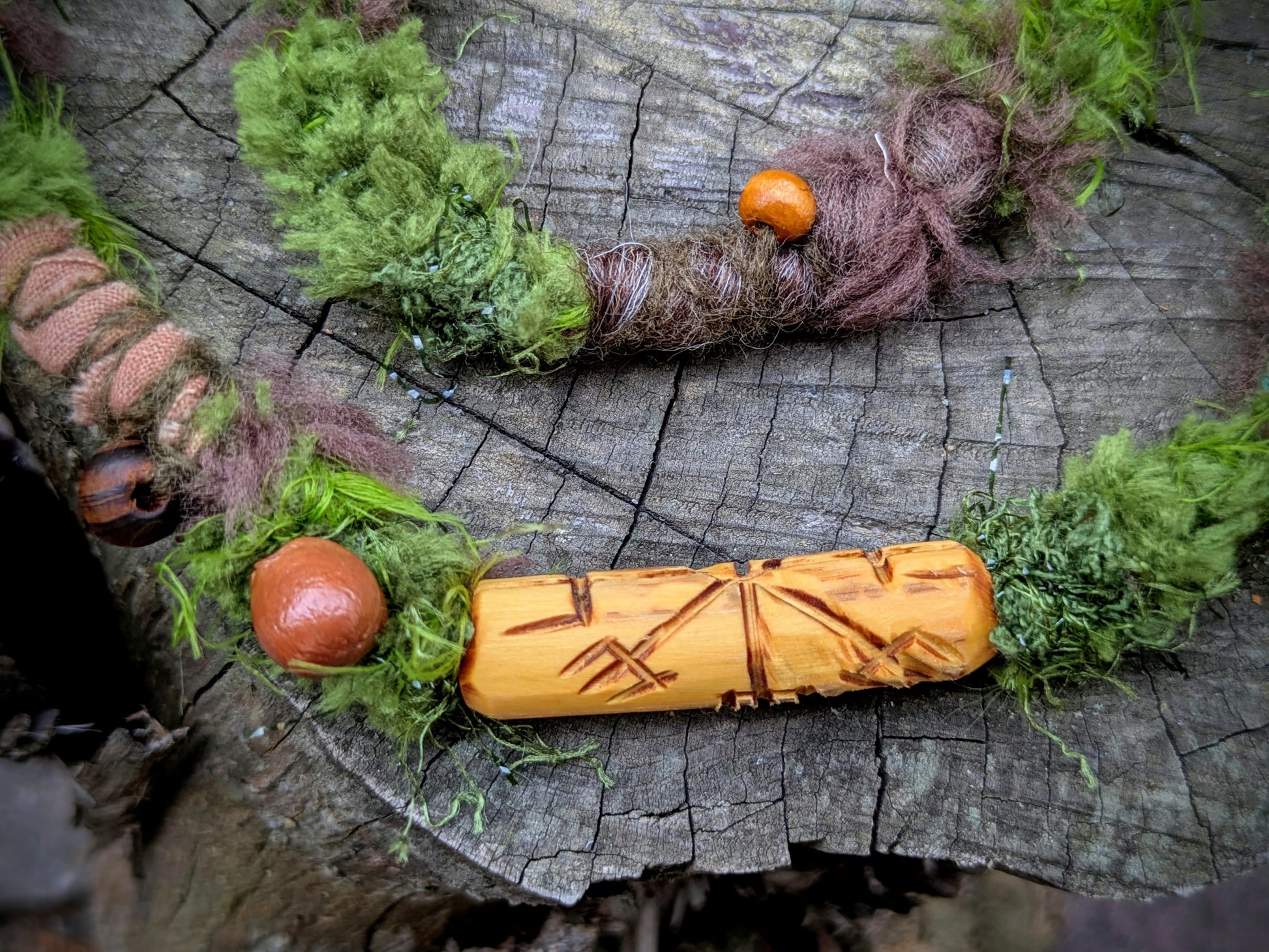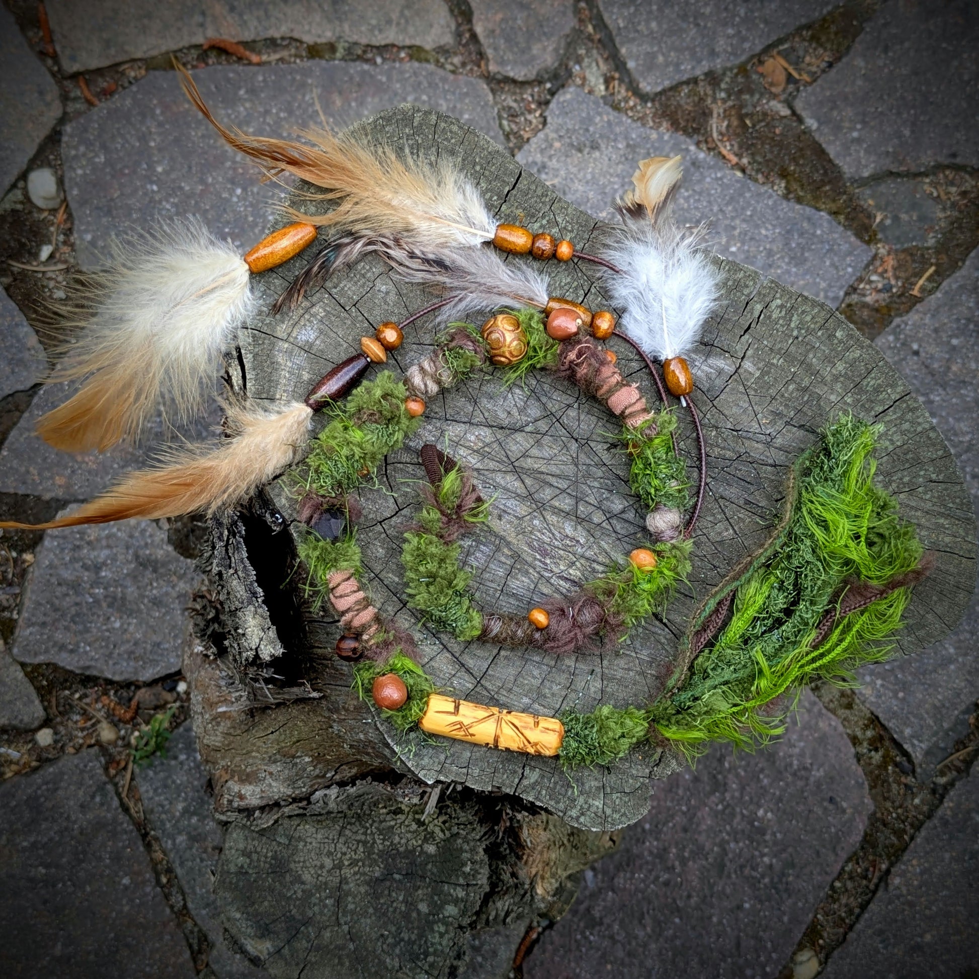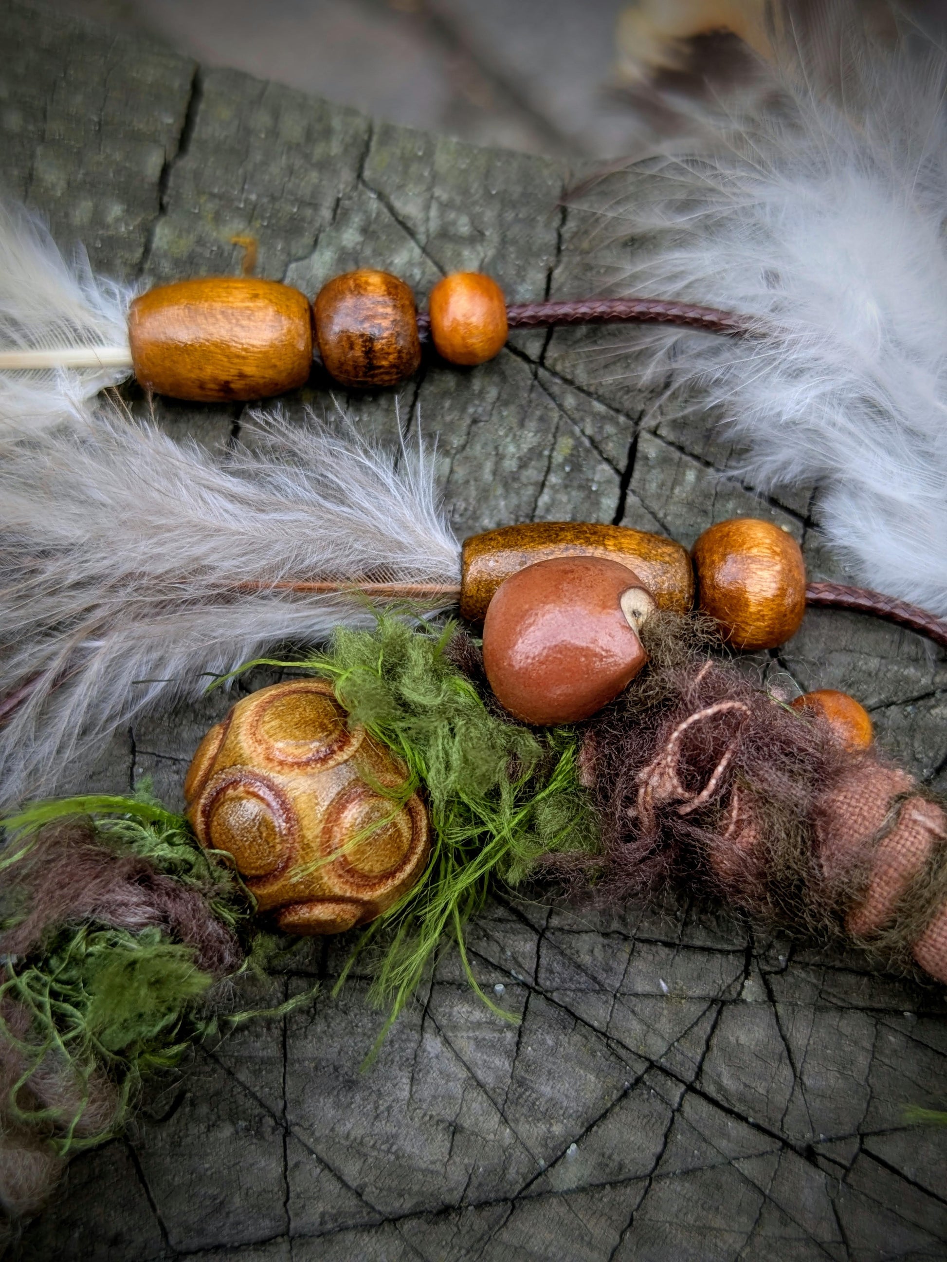 Ozdobný dread mechové struktury vyrobený z příze, merino vlny a recyklovaných látek. Zdobeno dřevěnými a semínkovými korálky a pírkovým závěsem, který jde z dreadu sundat a použít i samostatně jako pírková ozdoba do vlasů/dreadů.