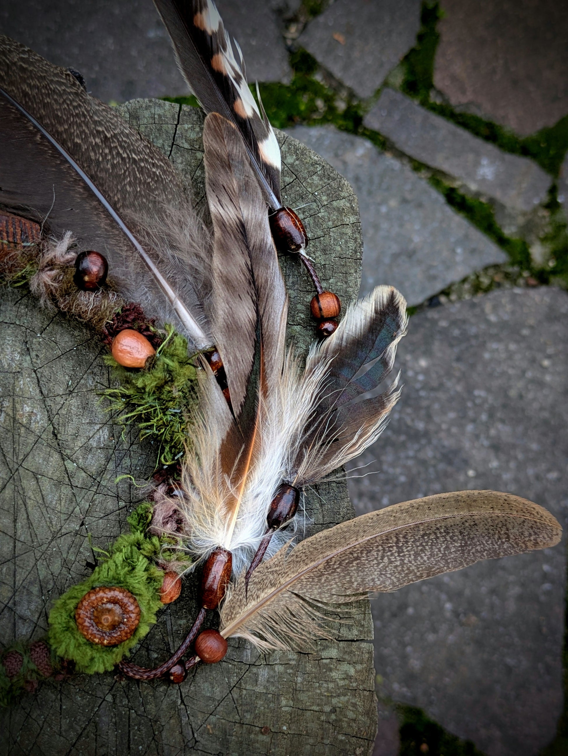 Ozdobný dread mechové struktury vyrobený z příze, merino vlny a recyklovaných látek. Zdobeno dřevěnými a semínkovými korálky, žaludy, velkou duběnkou, keramickou houbou a pírkovým závěsem, který jde z dreadu sundat a použít i samostatně jako pírková ozdoba do vlasů/dreadů.