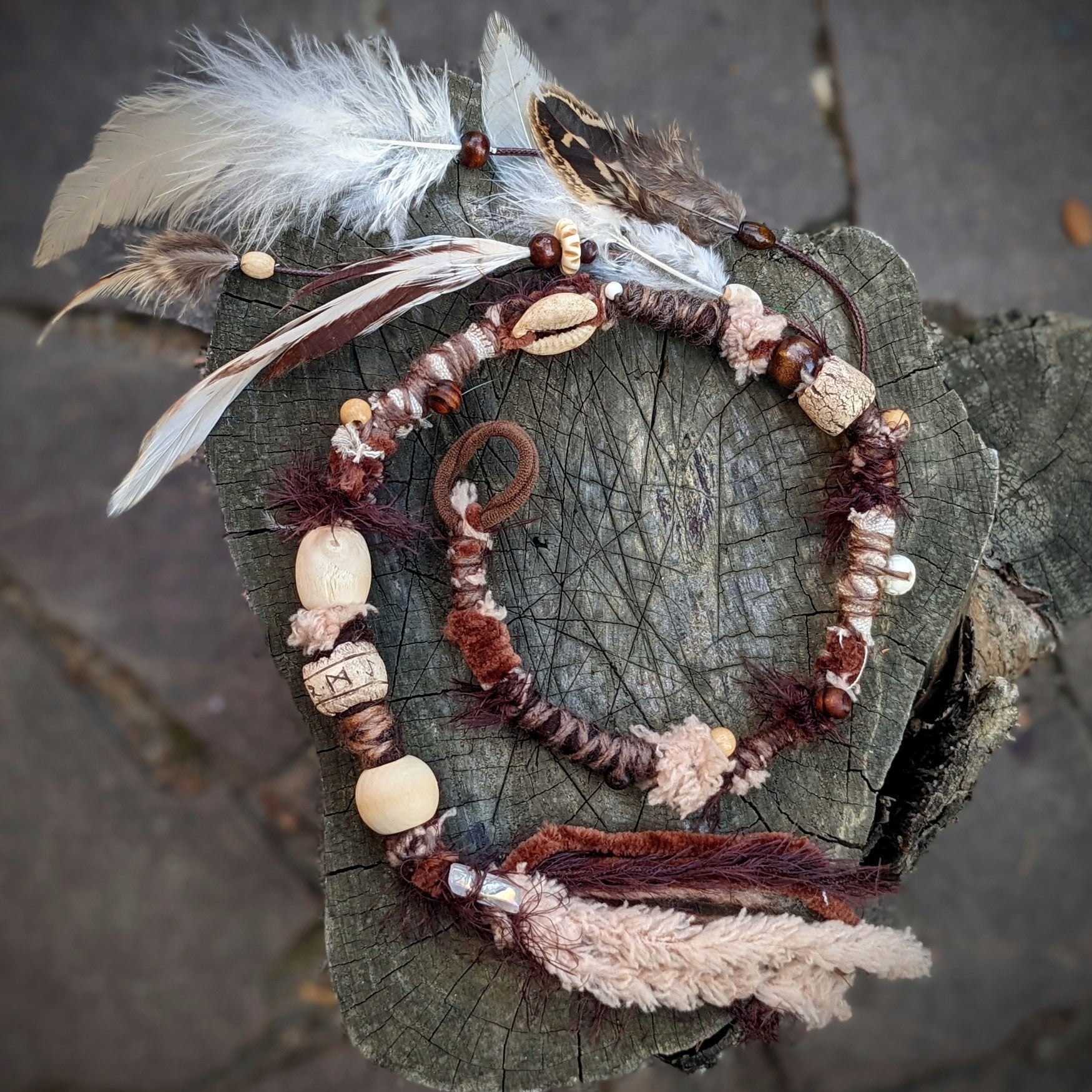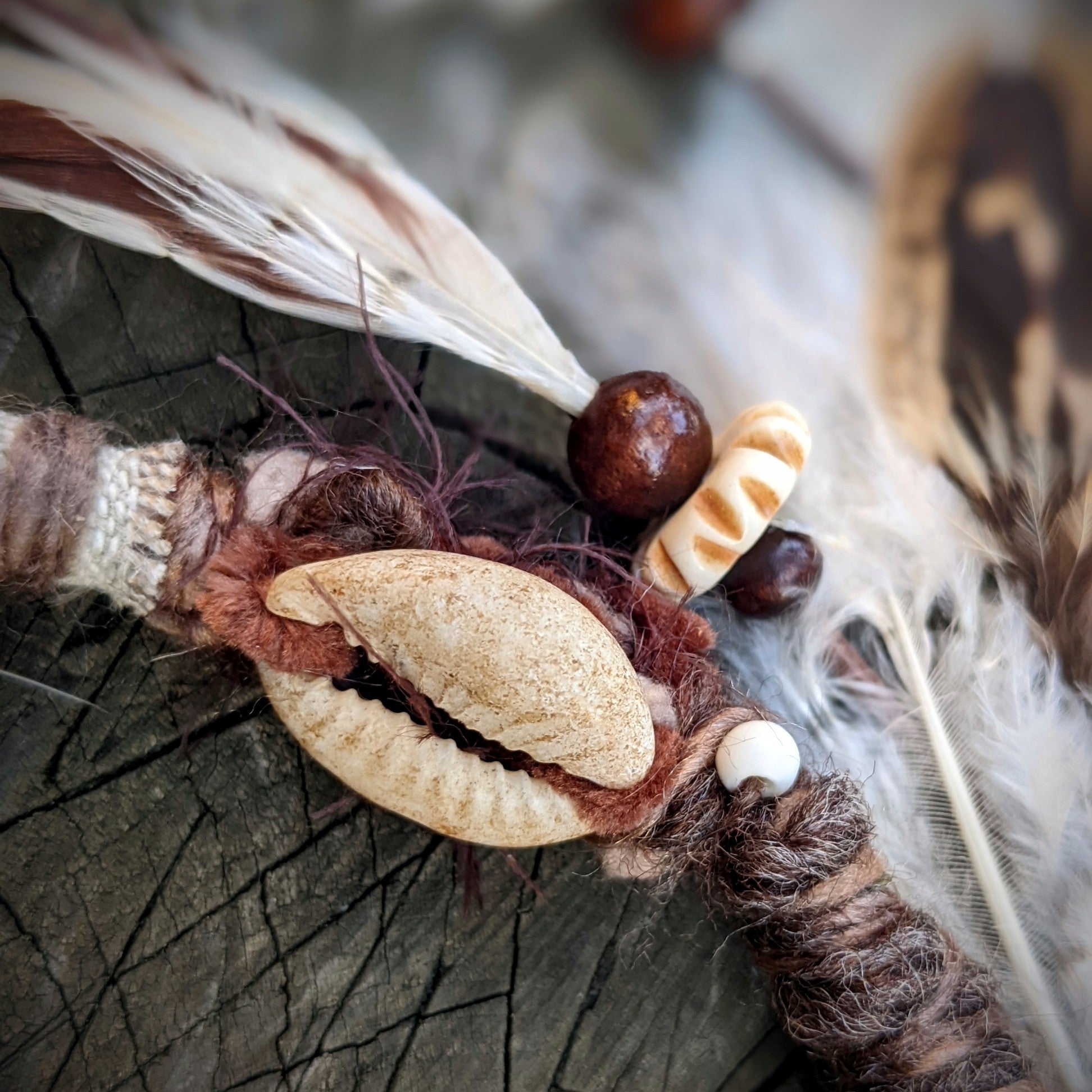 Ozdobný dread vyrobený z příze a recyklovaných látek. Zdobeno dřevěnými a keramickými korálkami, mušličkou, krystalem a pírkovým závěsem, který jde z dreadu sundat a použít i samostatně jako pírková ozdoba do vlasů/dreadů.