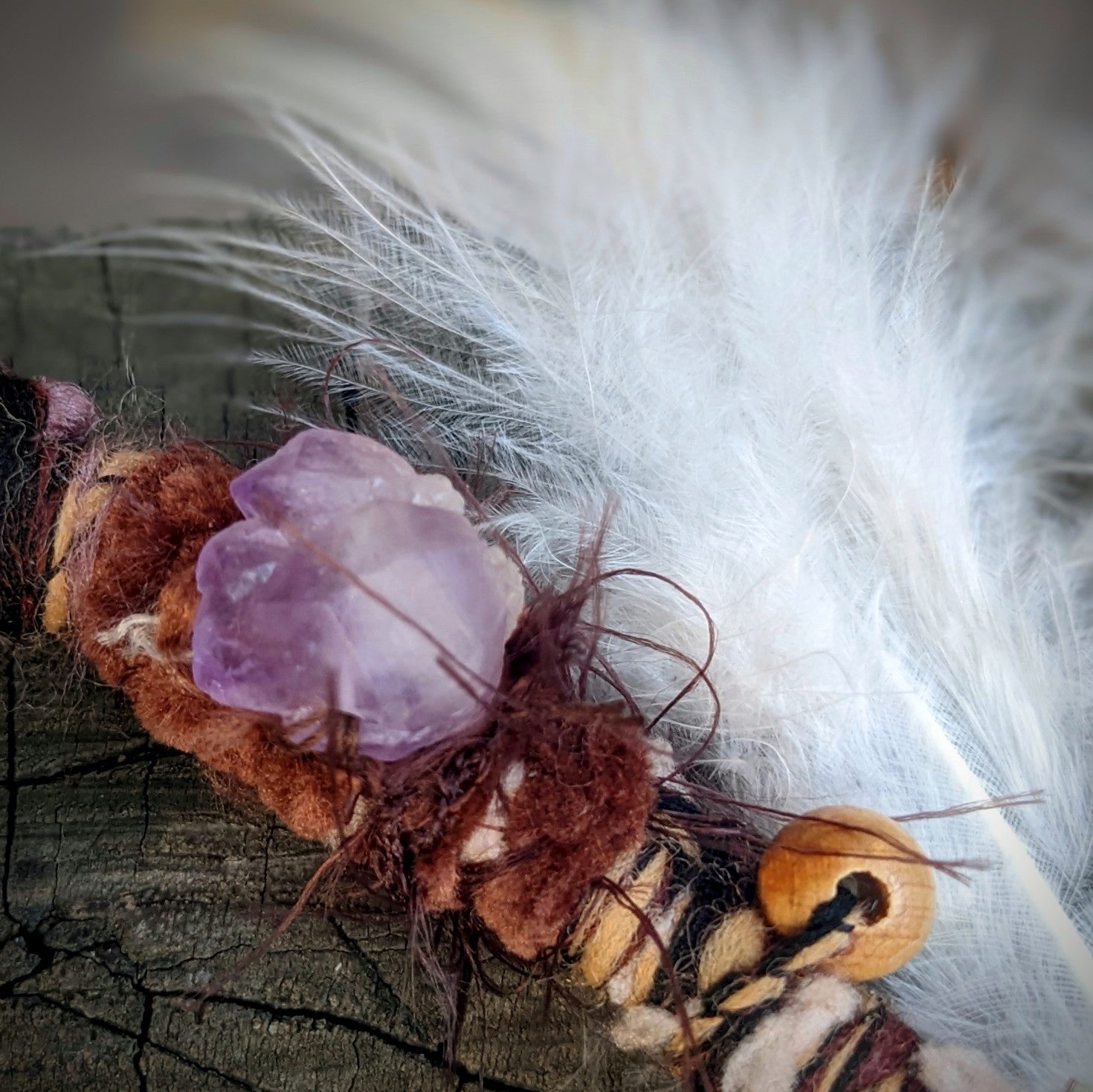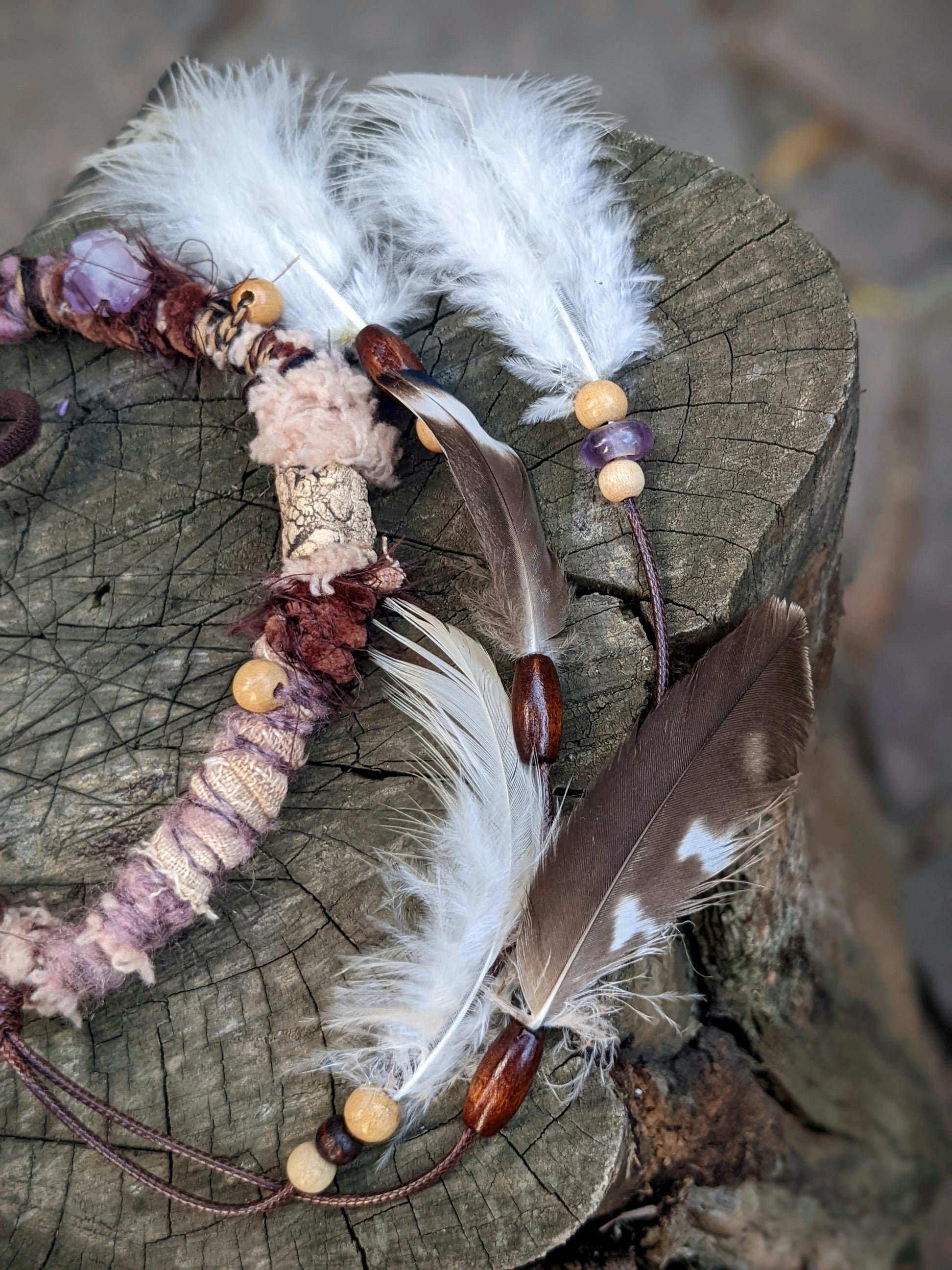 Ozdobný dread vyrobený z příze a recyklovaných látek. Zdobeno dřevěnými a keramickými korálkami, mandalou a pírkovým závěsem, který jde z dreadu sundat a použít i samostatně jako pírková ozdoba do vlasů/dreadů.