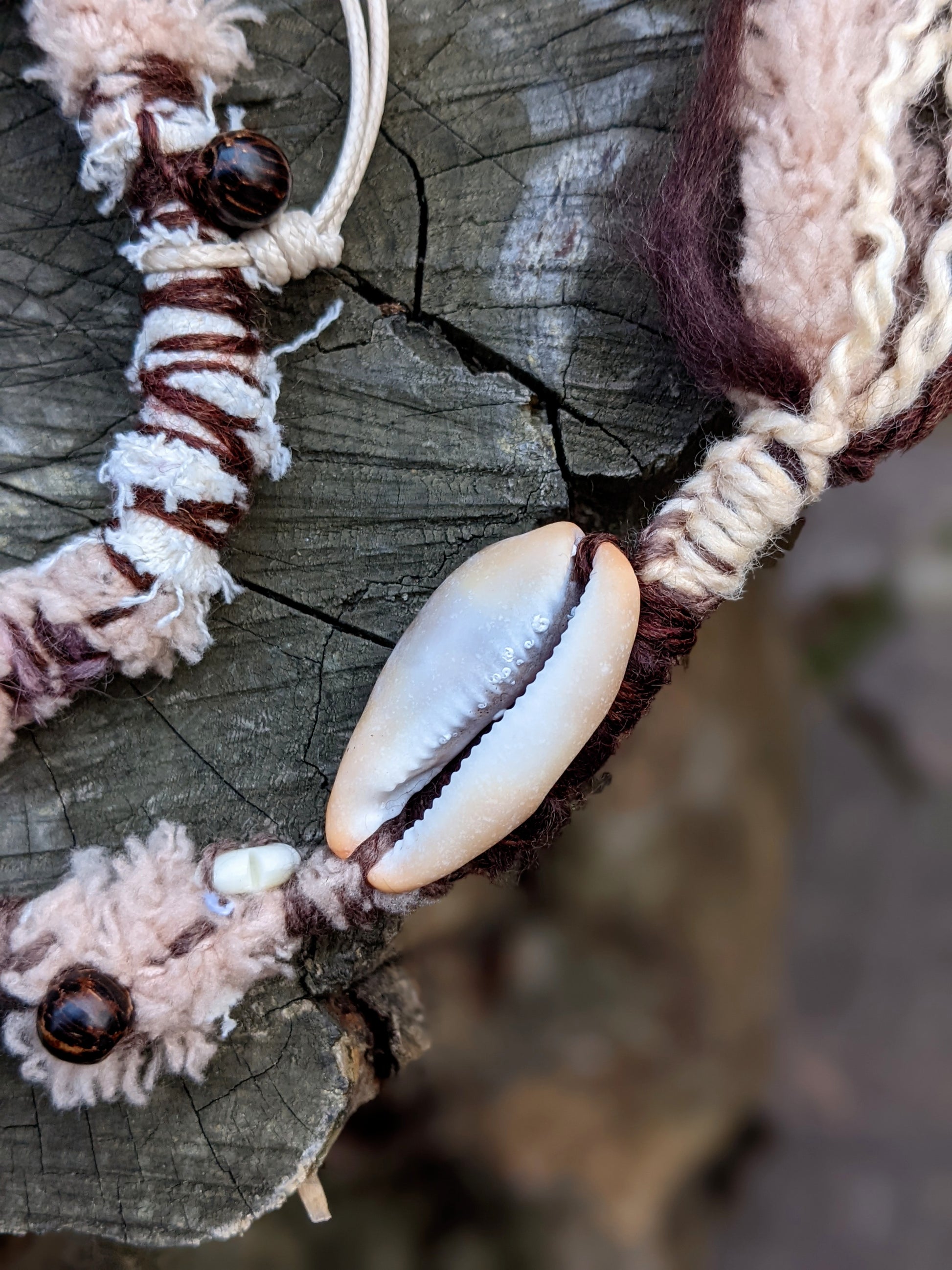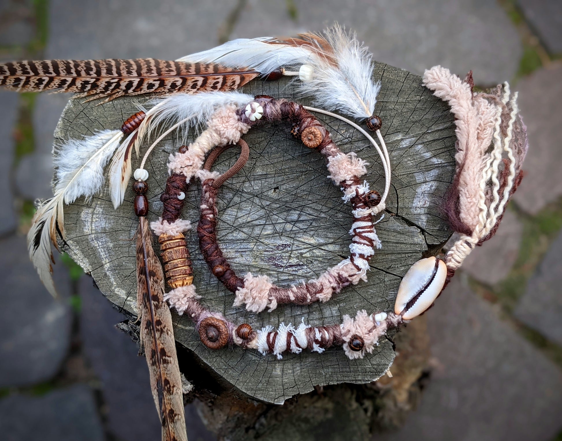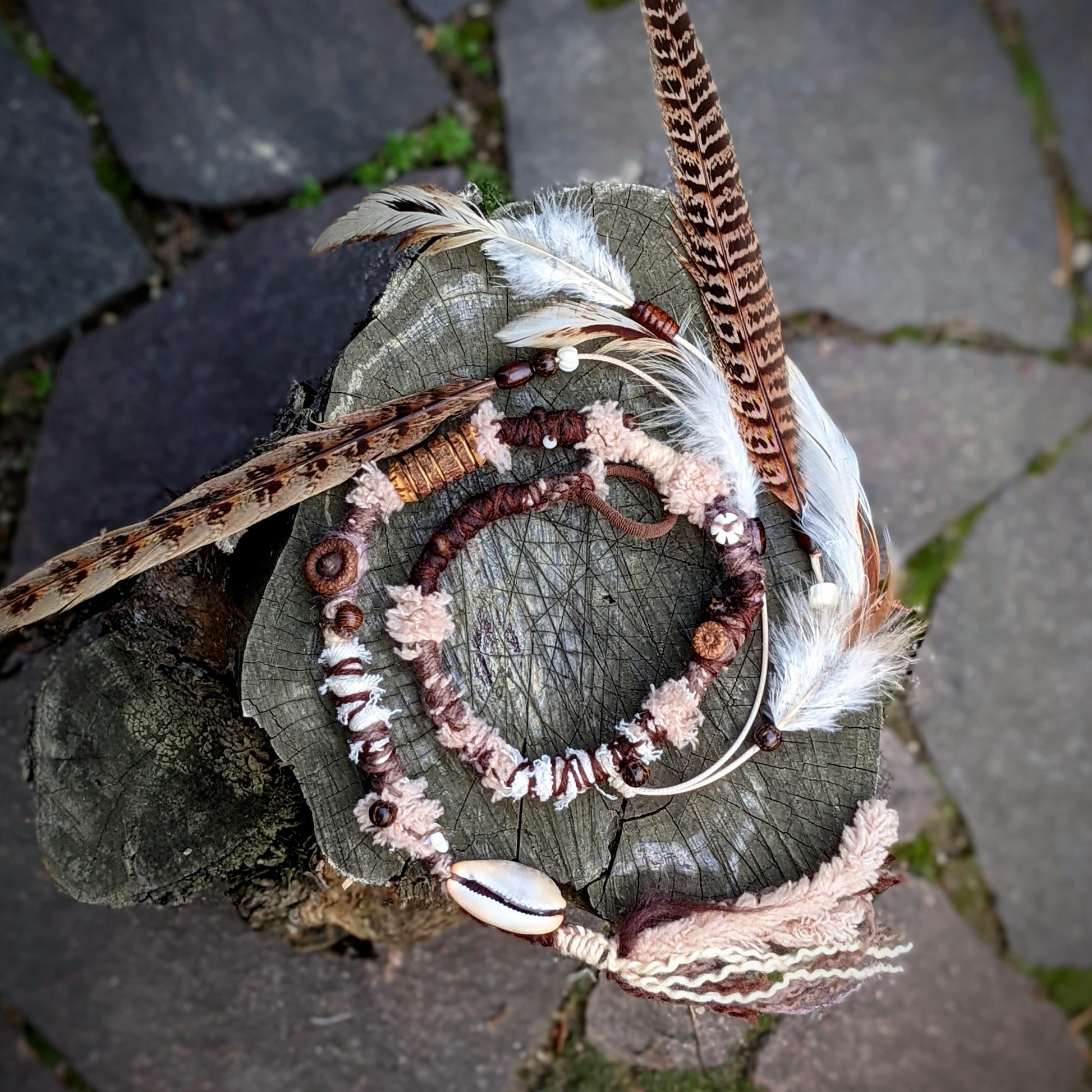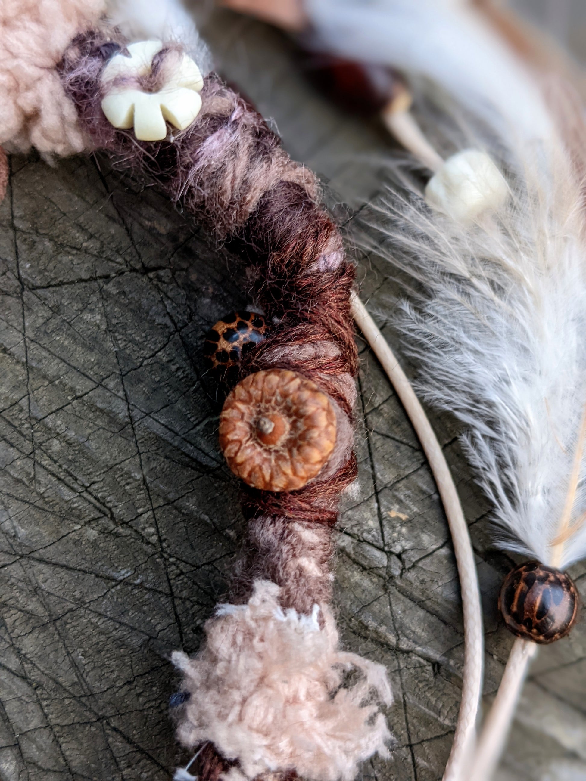 Ozdobný dread vyrobený z příze a recyklovaných látek. Zdobeno dřevěnými a kostěnými korálkami, mušličkami, žaludy a pírkovým závěsem, který jde z dreadu sundat a použít i samostatně jako pírková ozdoba do vlasů/dreadů.