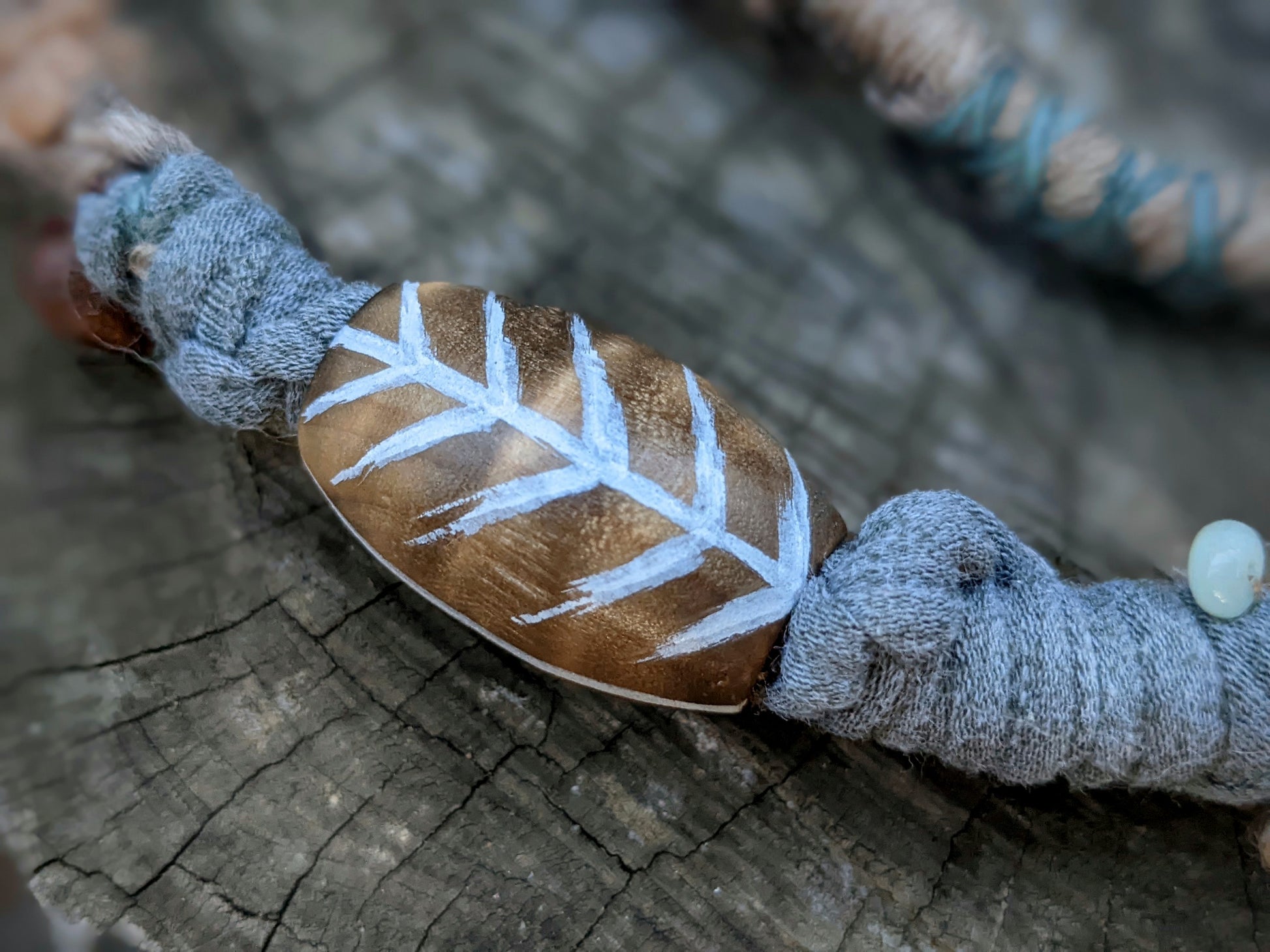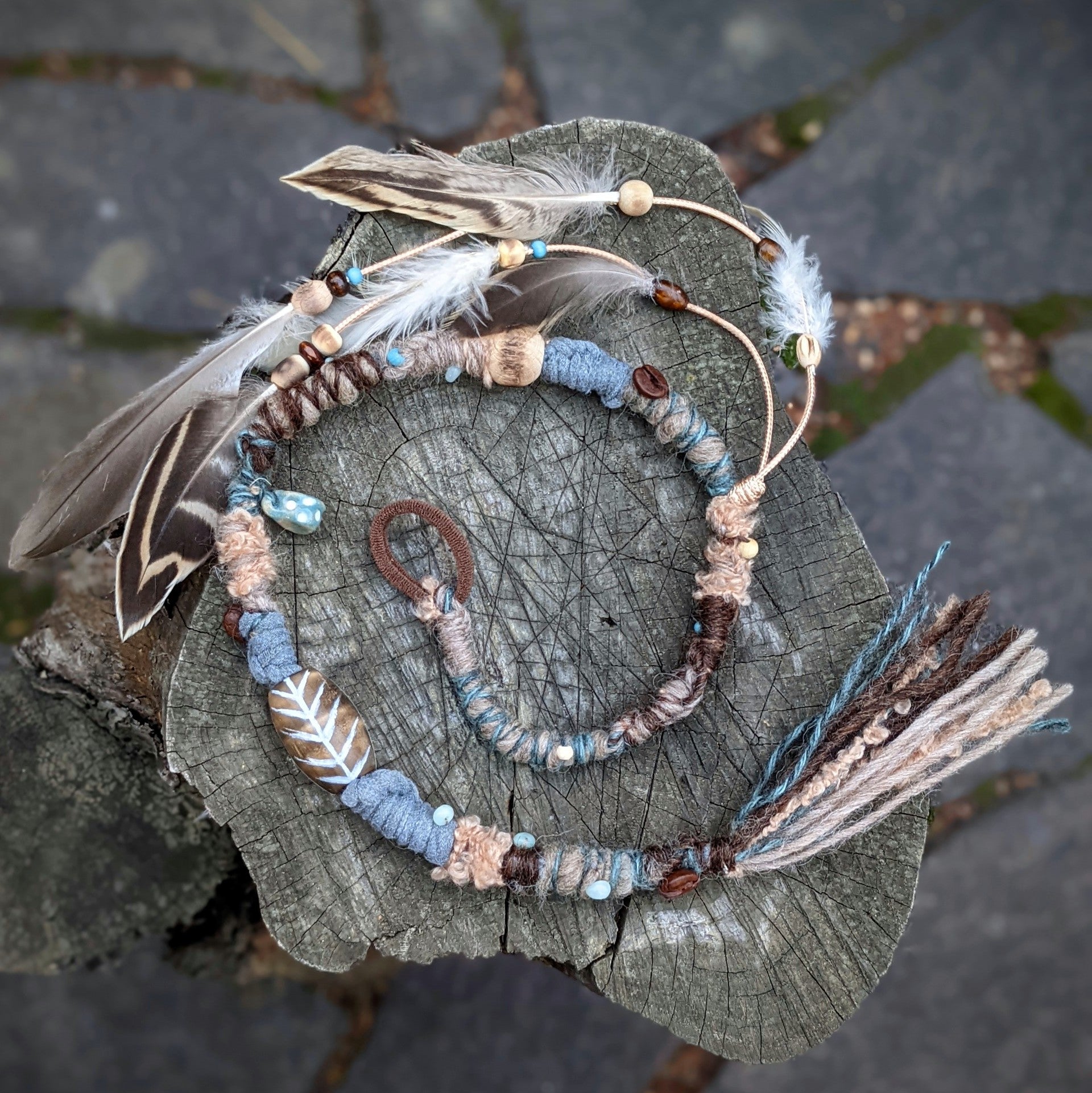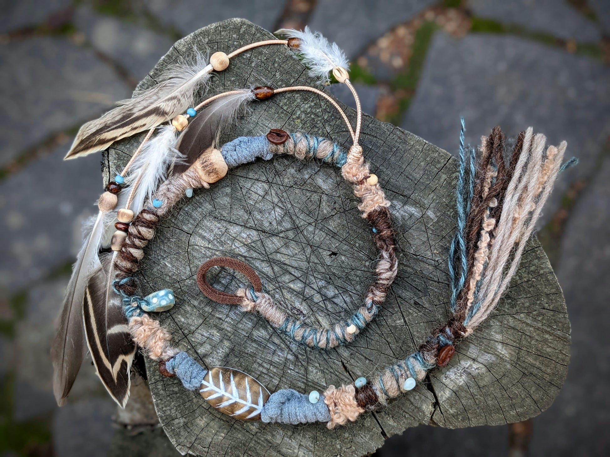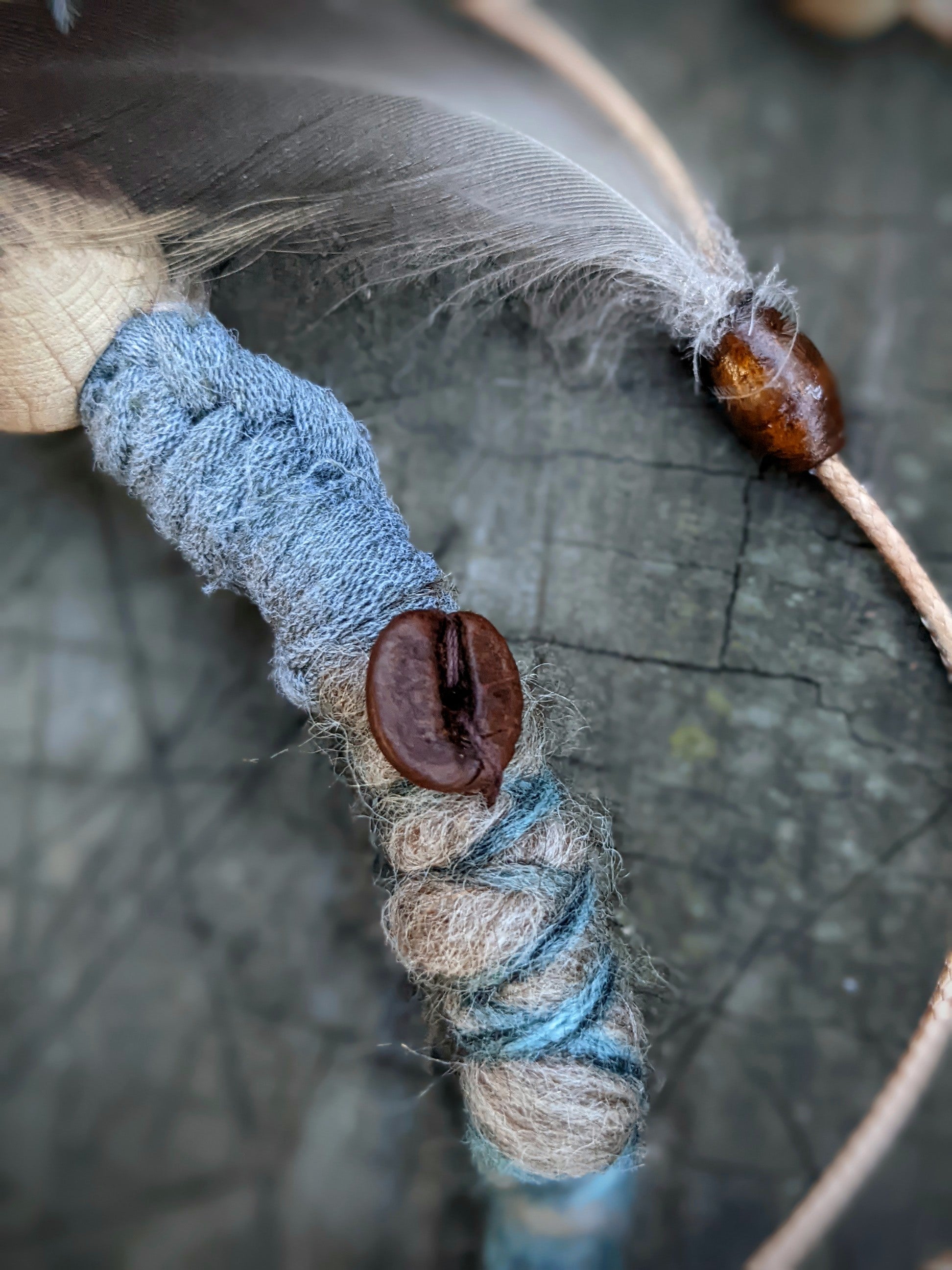 Ozdobný dread vyrobený z příze a recyklovaných látek. Zdobeno dřevěnými a amazonitovými korálkami, kávovými zrnky, keramickým hrníčkem a pírkovým závěsem, který jde z dreadu sundat a použít i samostatně jako pírková ozdoba do vlasů/dreadů.