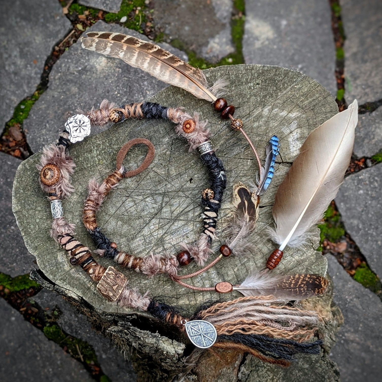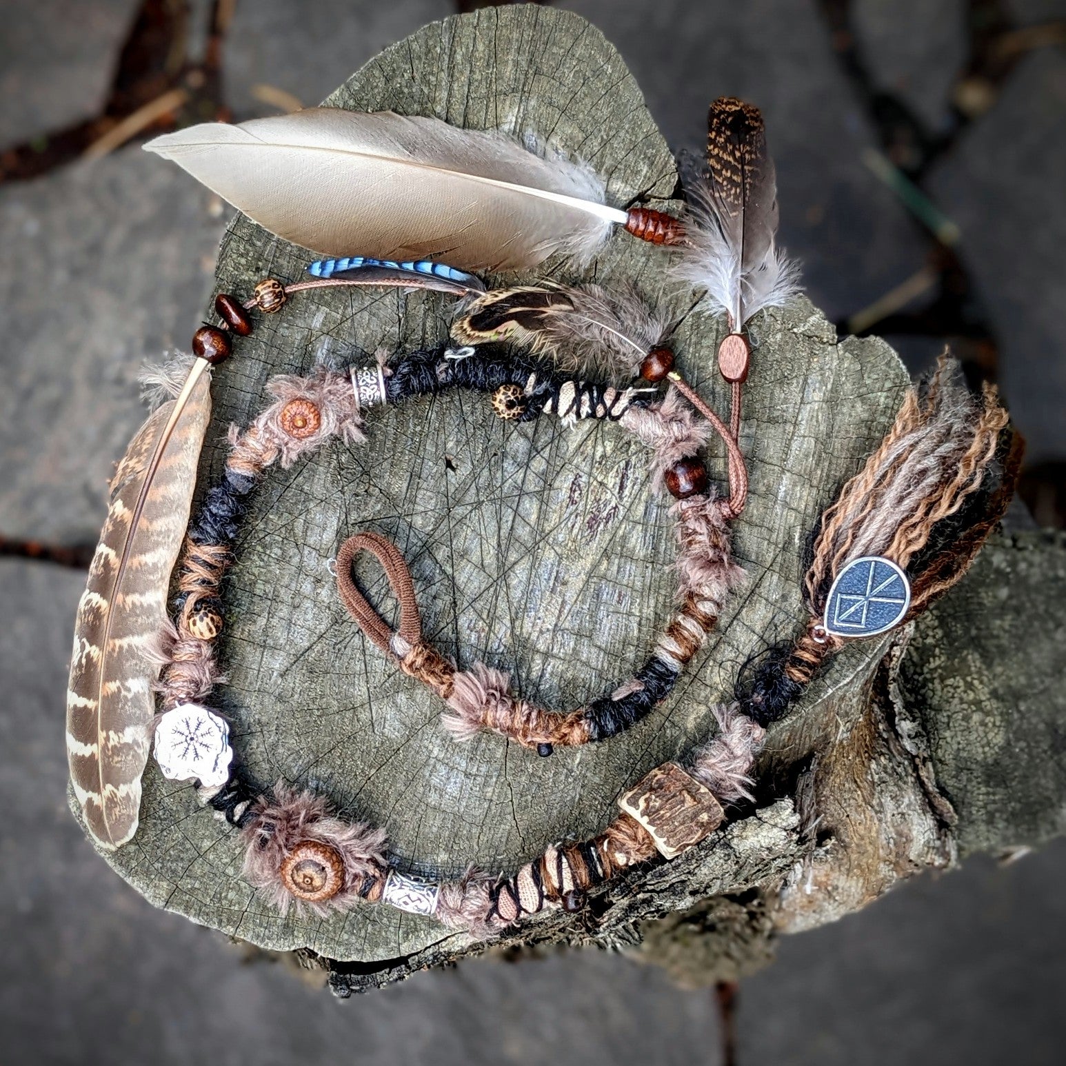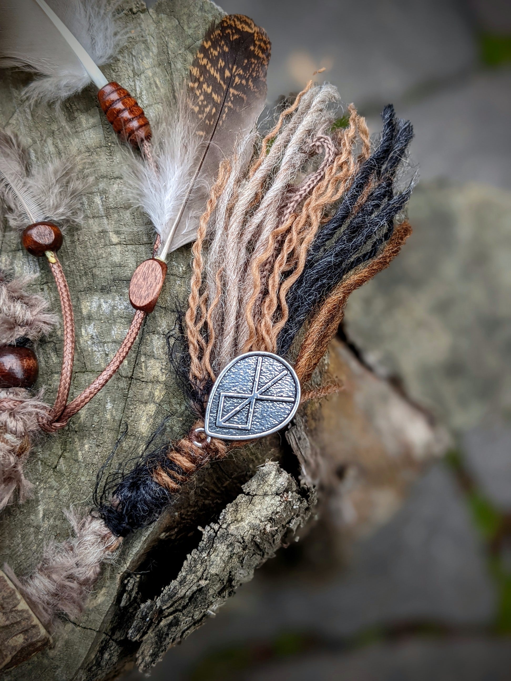 Ozdobný dread vyrobený z příze a recyklovaných látek. Zdobeno dřevěnými a kovovými korálkami, parůžkovým korálkem z dílny Carol Black, žaludy, runovým přívěskěm a pírkovým závěsem, který jde z dreadu sundat a použít i samostatně jako pírková ozdoba do vlasů/dreadů.
