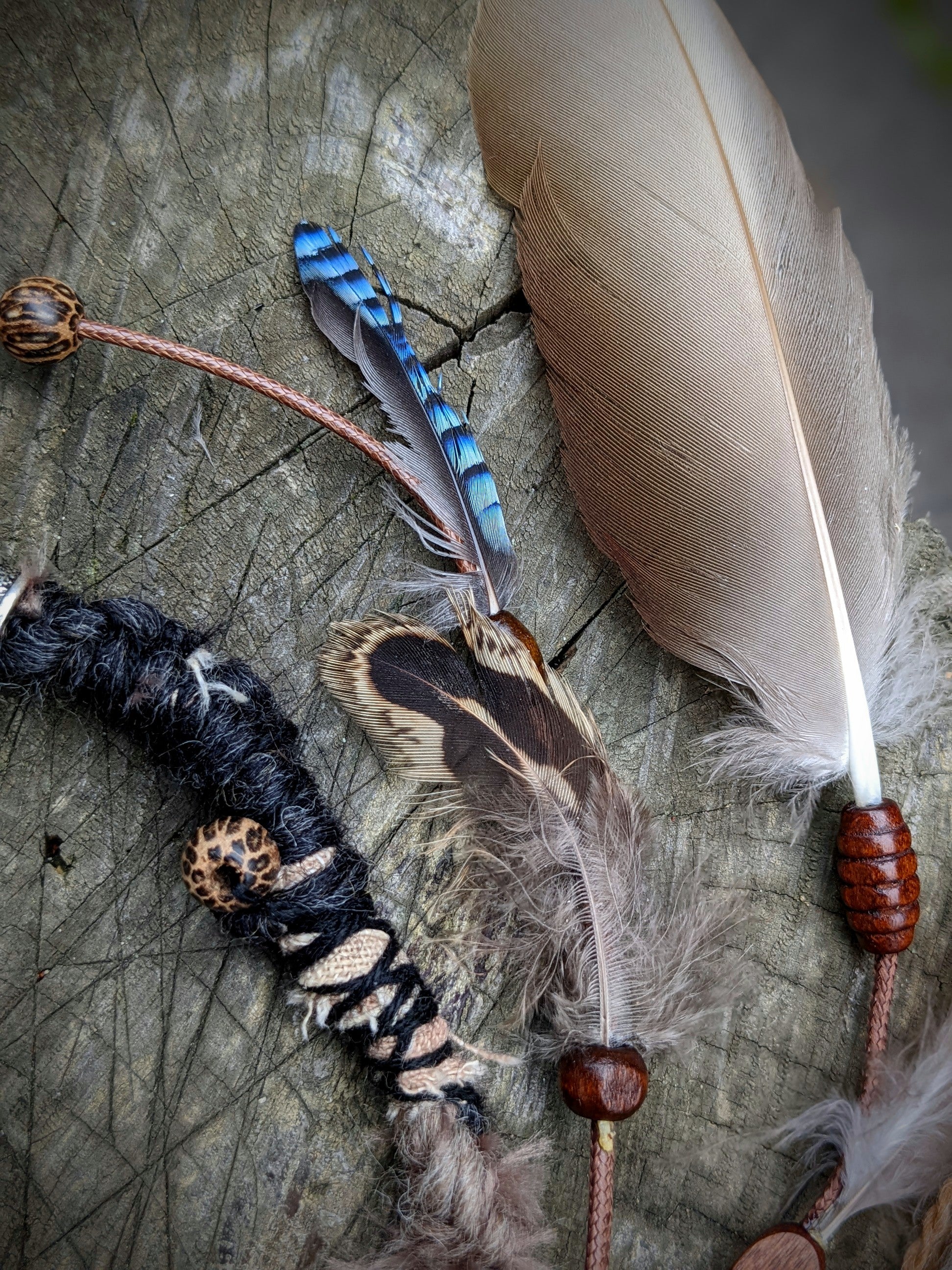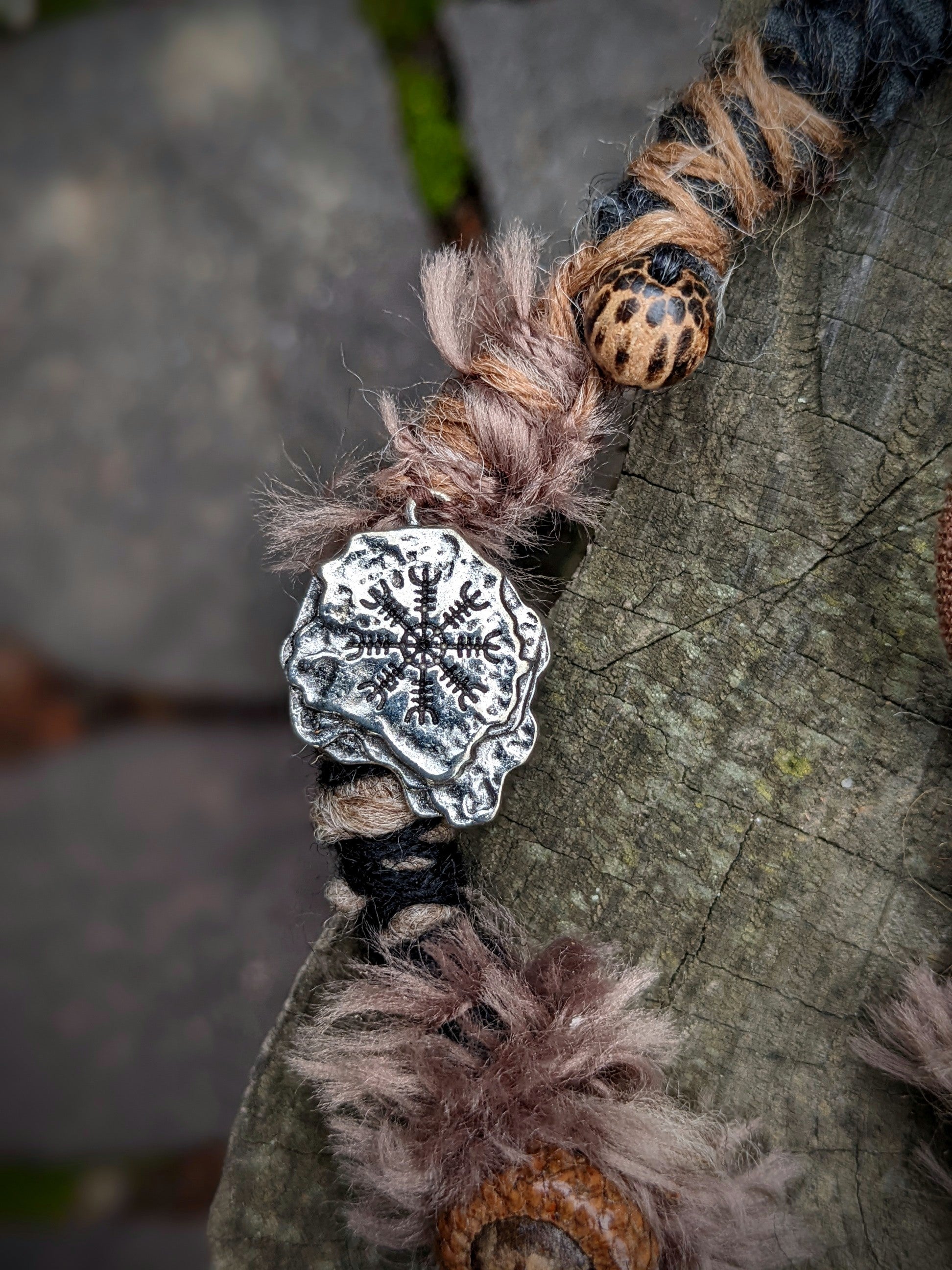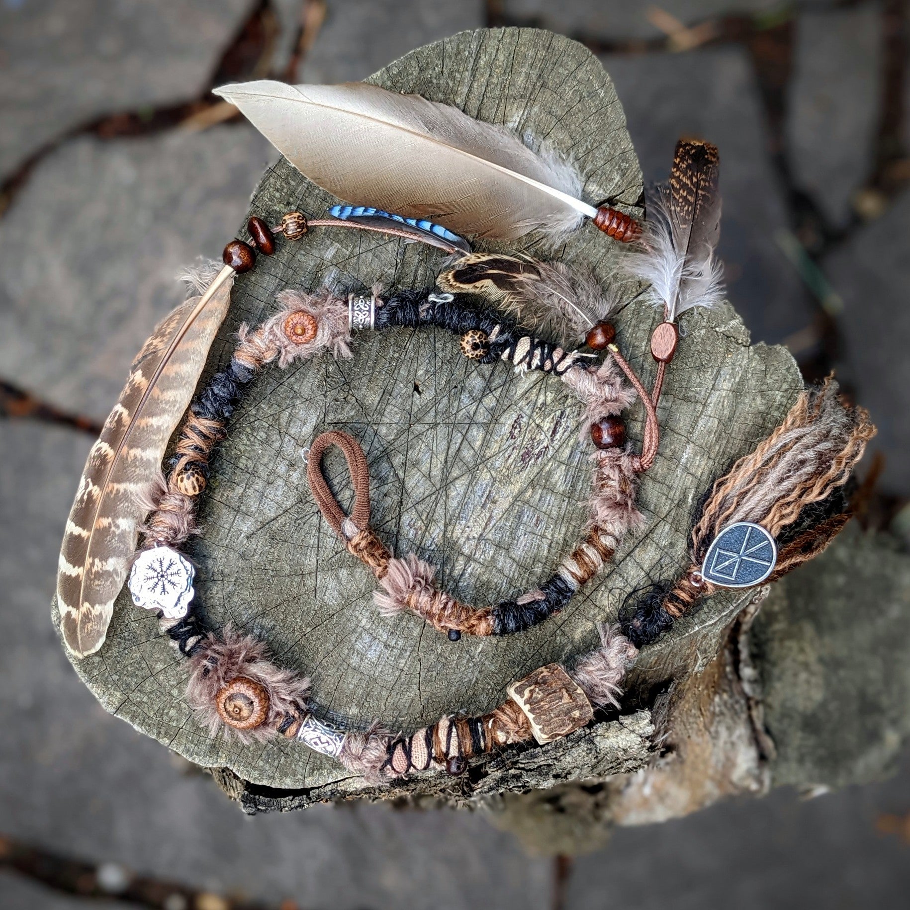 Ozdobný dread vyrobený z příze a recyklovaných látek. Zdobeno dřevěnými a kovovými korálkami, parůžkovým korálkem z dílny Carol Black, žaludy, runovým přívěskěm a pírkovým závěsem, který jde z dreadu sundat a použít i samostatně jako pírková ozdoba do vlasů/dreadů.