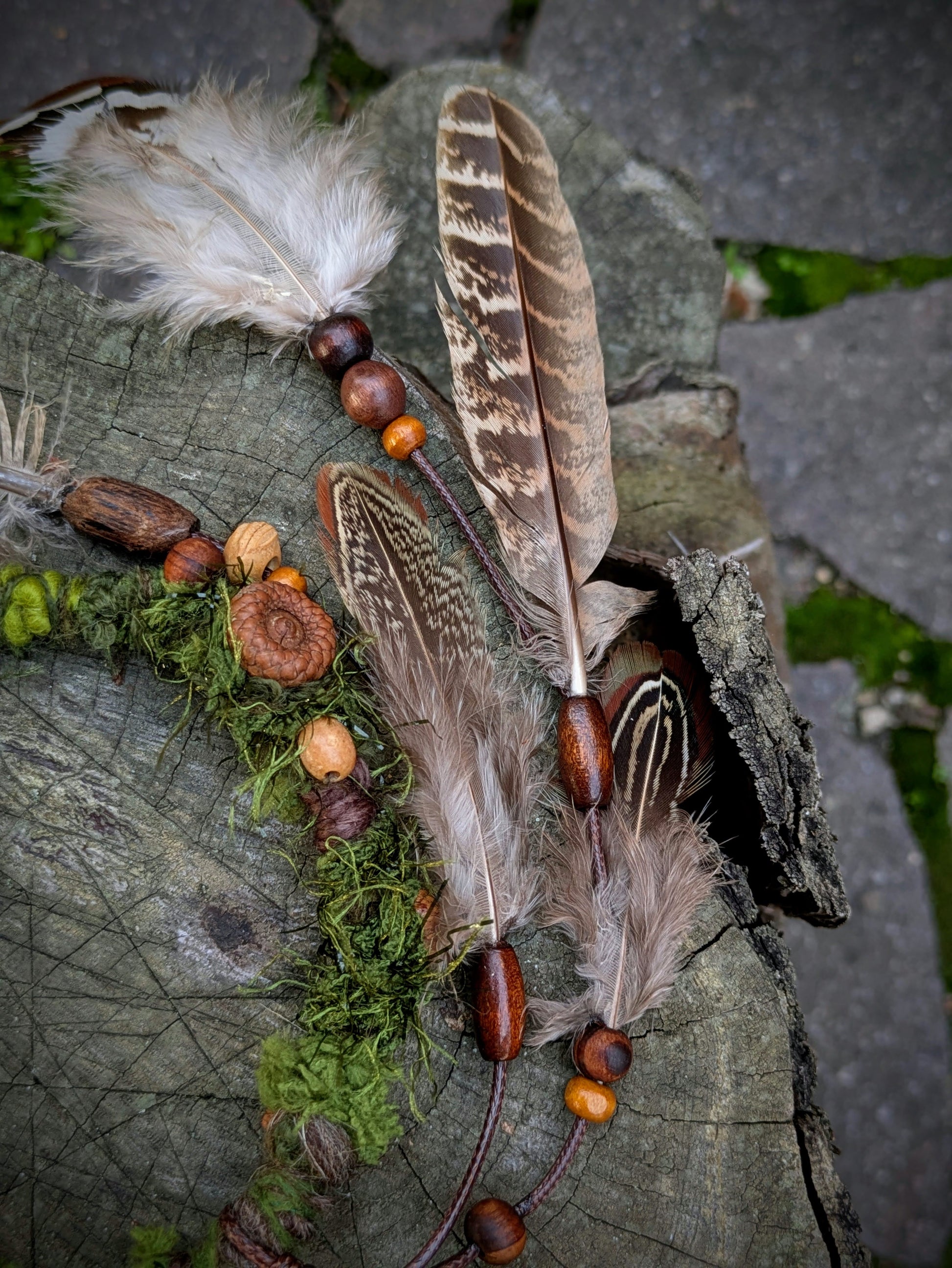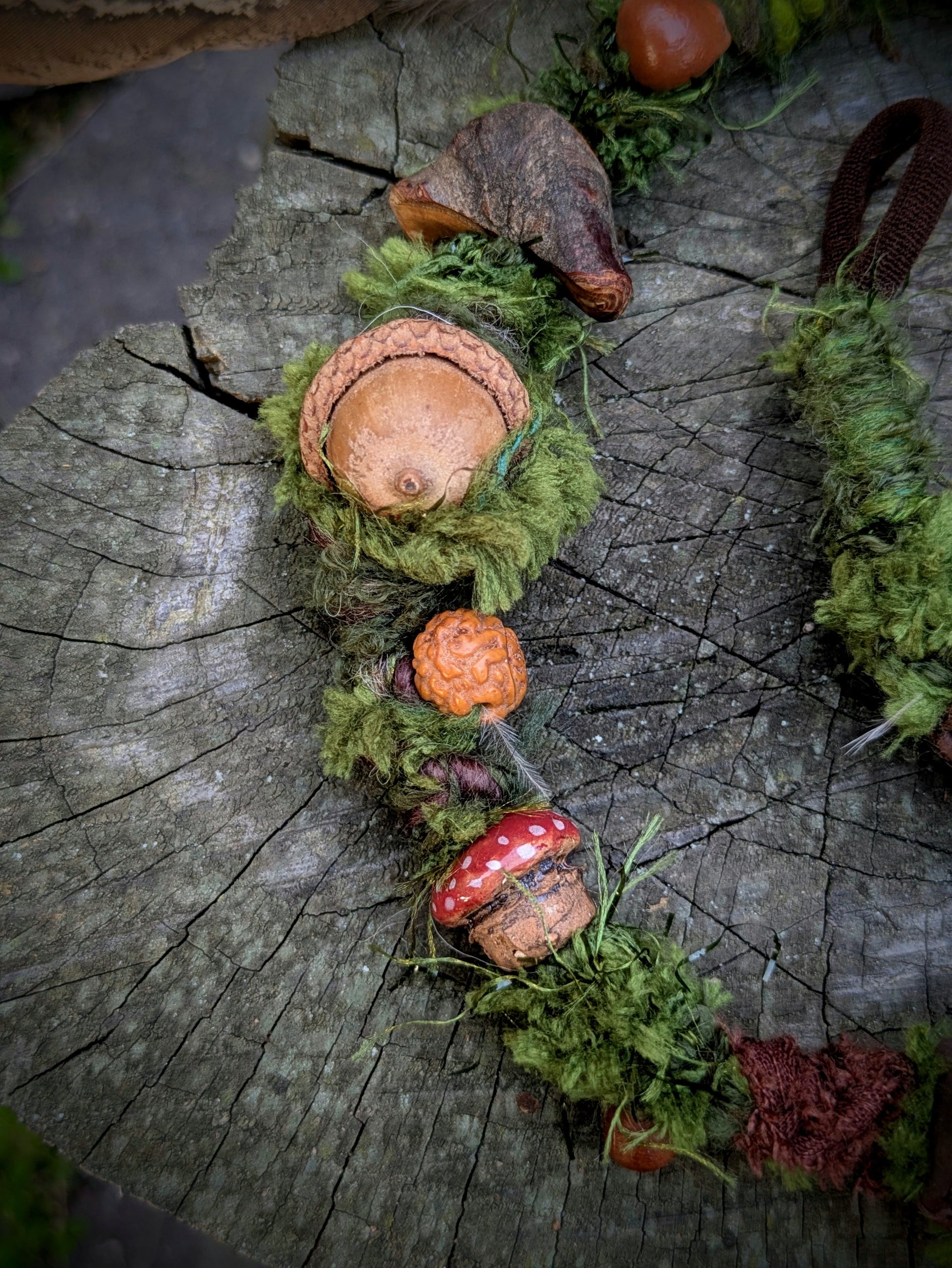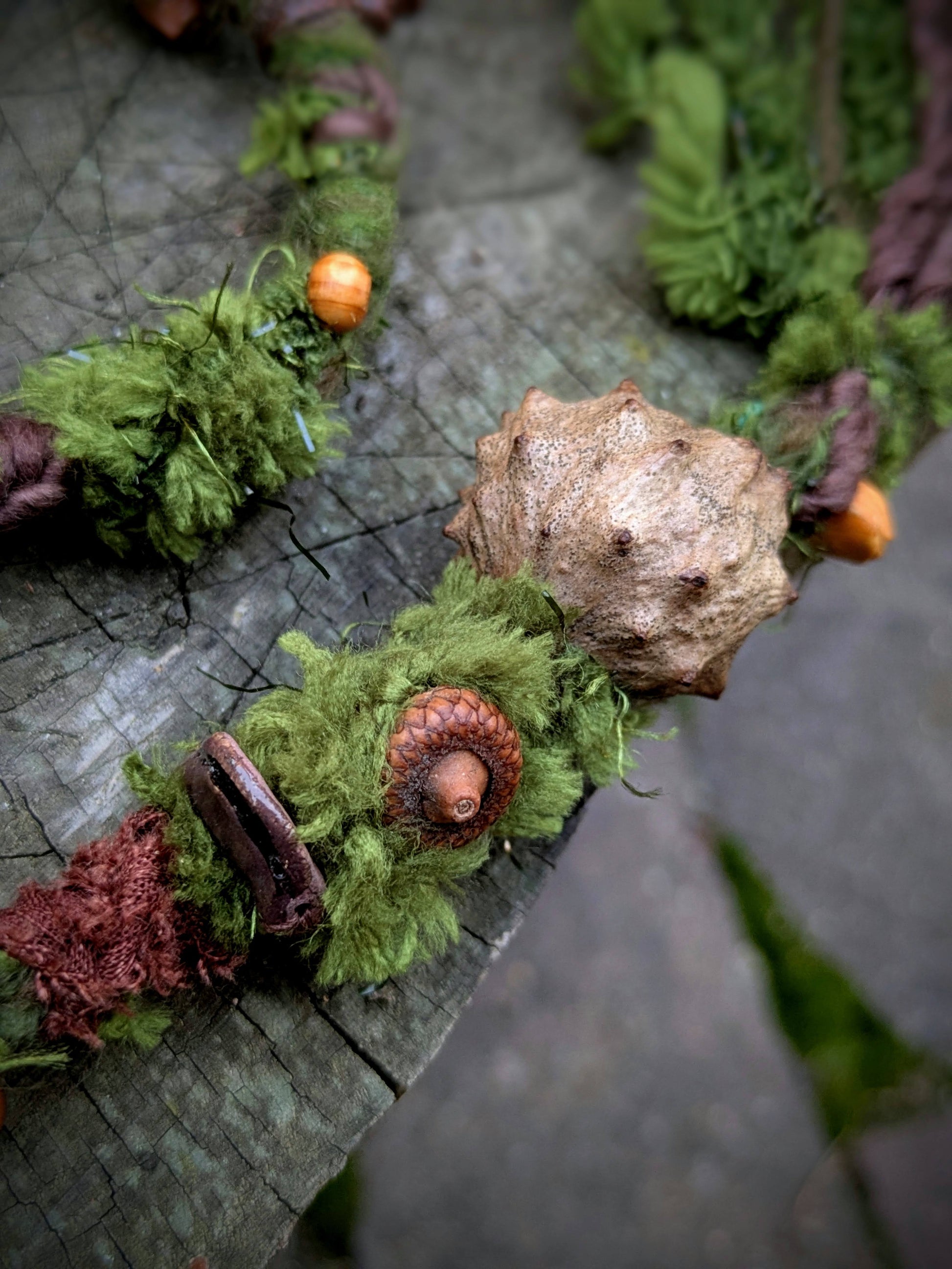 Ozdobný dread mechové struktury vyrobený z příze, merino vlny a recyklovaných látek. Zdobeno dřevěnými a semínkovými korálky, žaludy, velkou duběnkou, keramickou houbou (muchomůrka a choroš) a pírkovým závěsem, který jde z dreadu sundat a použít i samostatně jako pírková ozdoba do vlasů/dreadů.