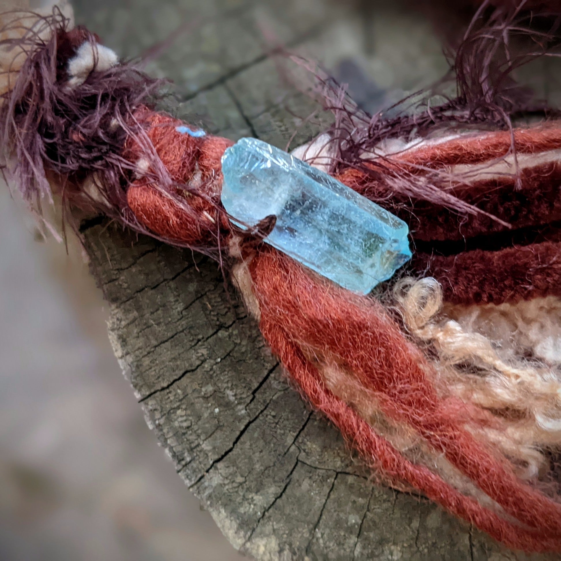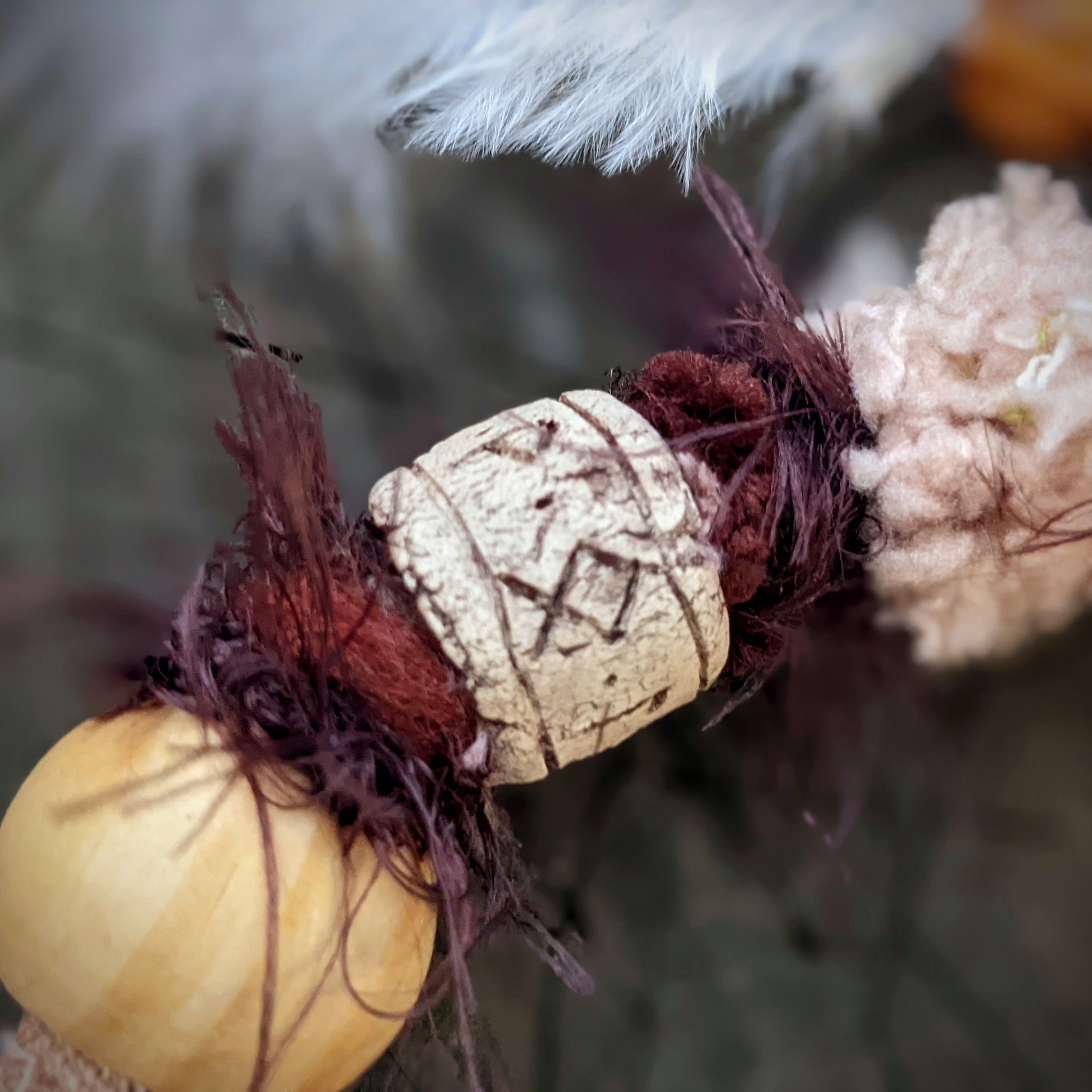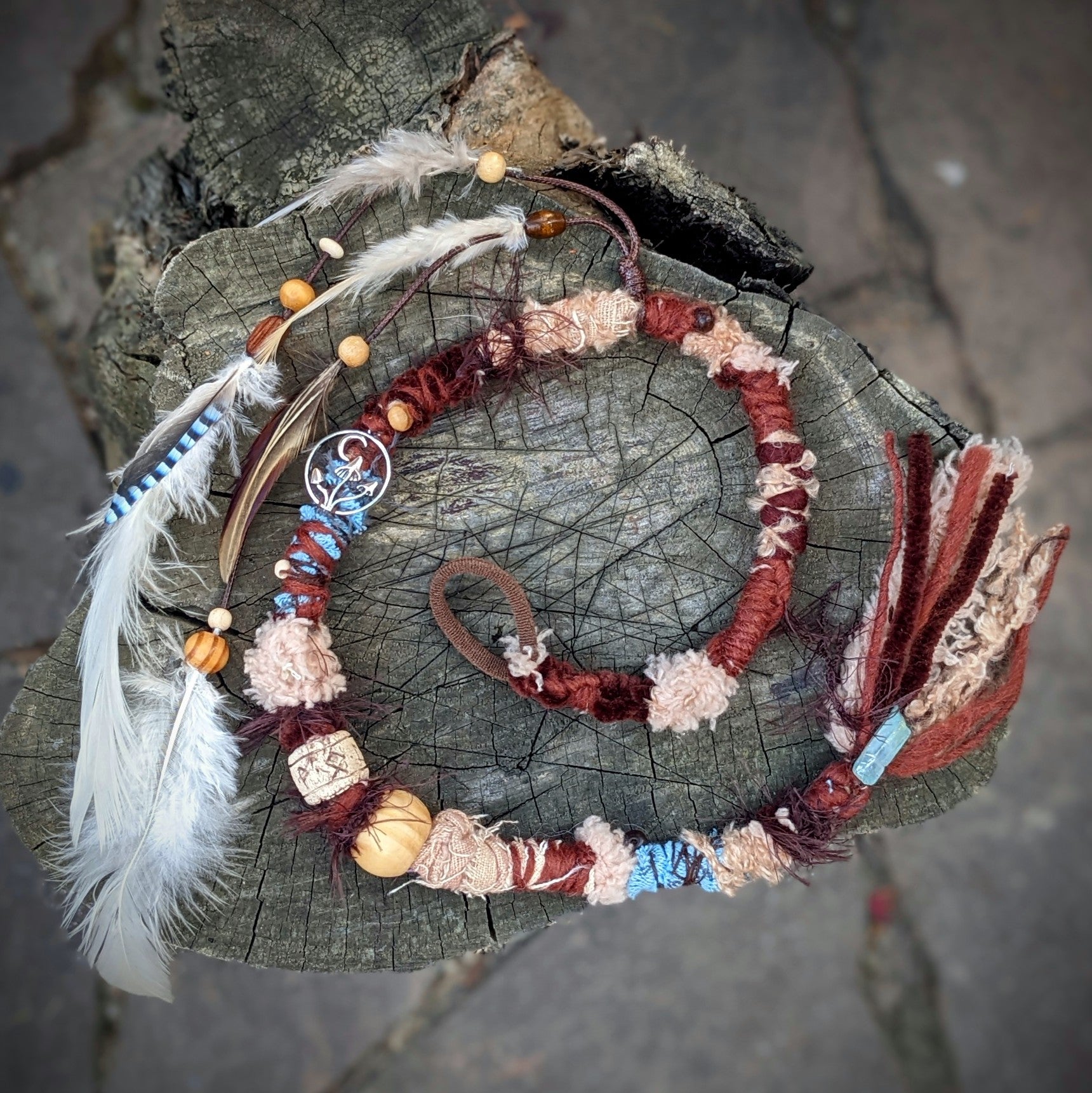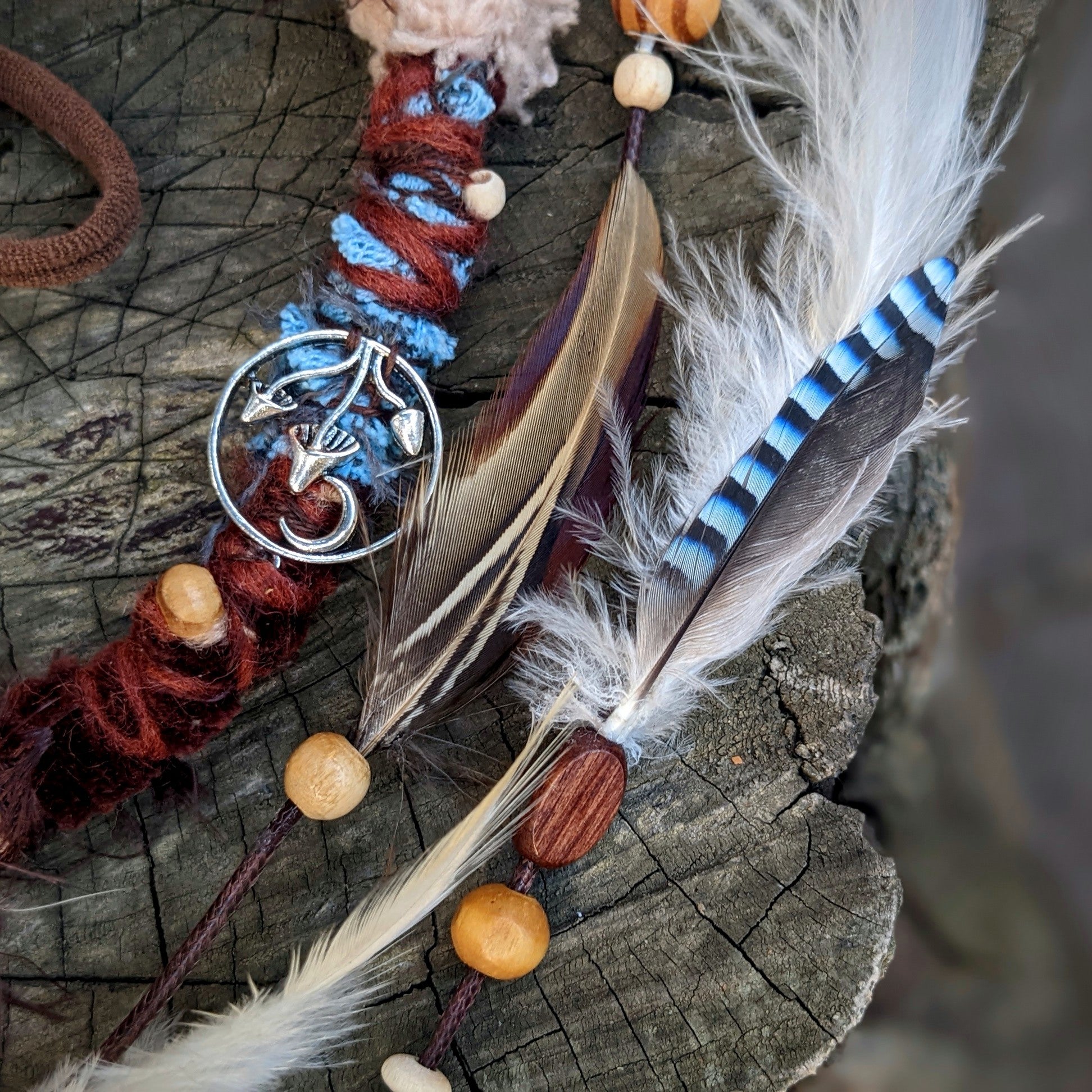 Ozdobný dread vyrobený z příze a recyklovaných látek. Zdobeno dřevěnými a keramickými korálkami, kovovým přívěskem, krystalem a pírkovým závěsem, který jde z dreadu sundat a použít i samostatně jako pírková ozdoba do vlasů/dreadů.