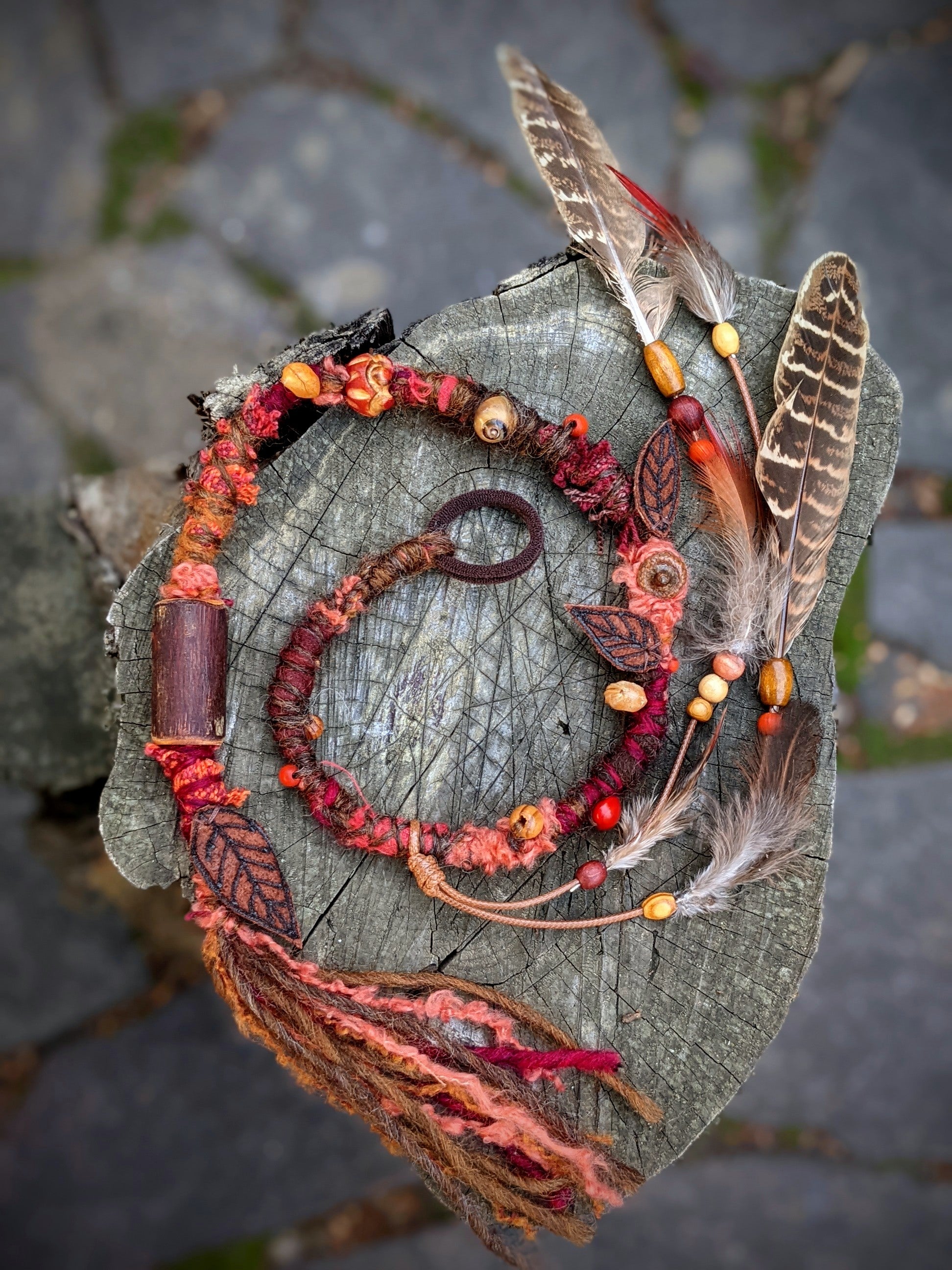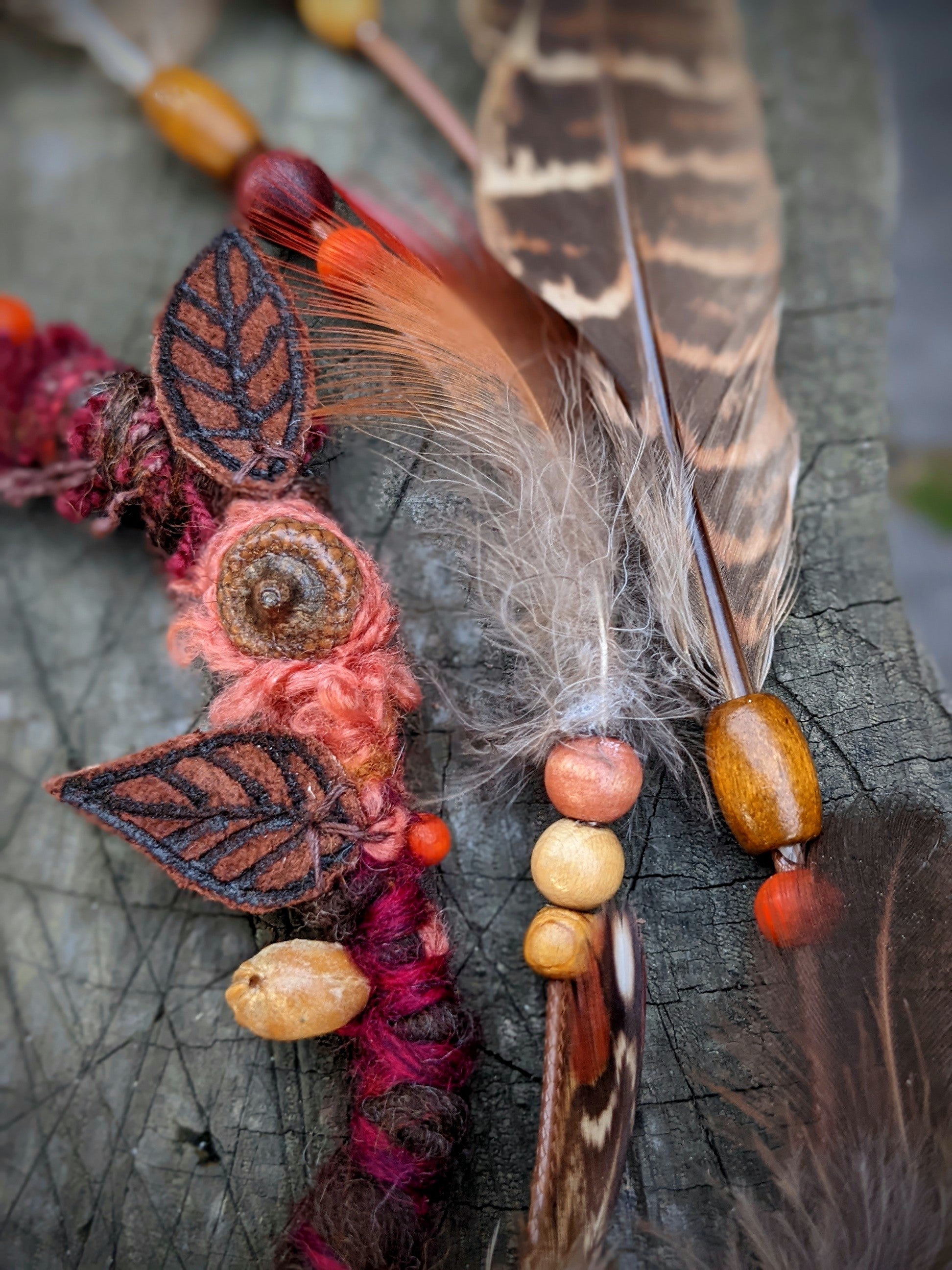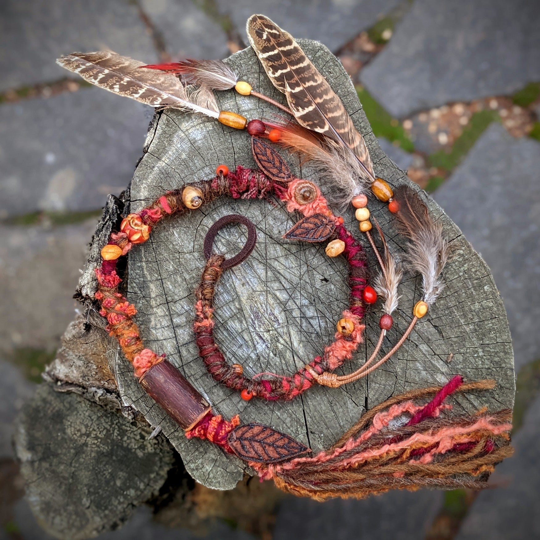 Ozdobný dread z podzimní kolekce vyrobený z příze a recyklovaných látek. Zdobeno dřevěnými a semínkovými korálkami, koženými lístečky, žaludy, ulitou a pírkovým závěsem, který jde z dreadu sundat a použít i samostatně jako pírková ozdoba do vlasů/dreadů.