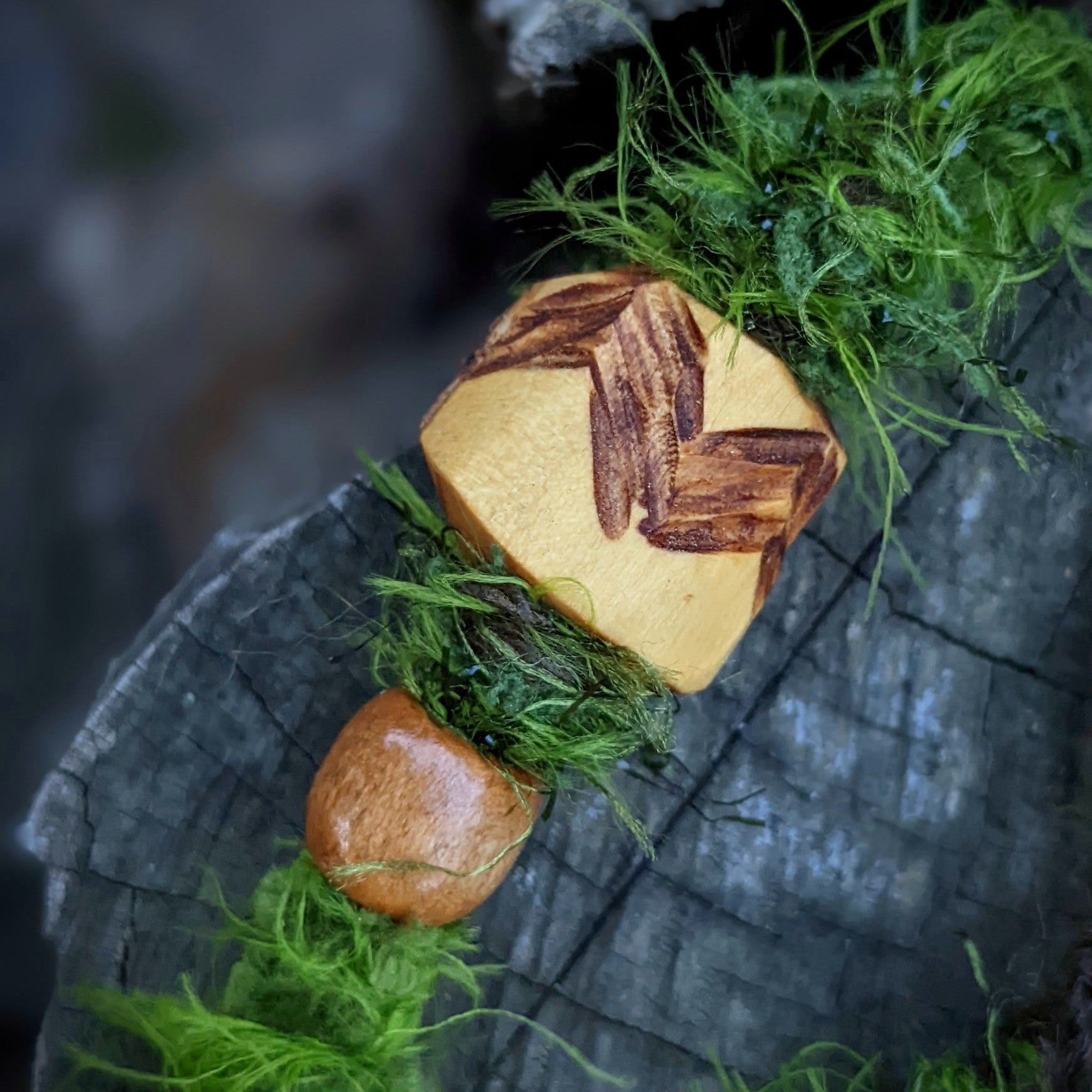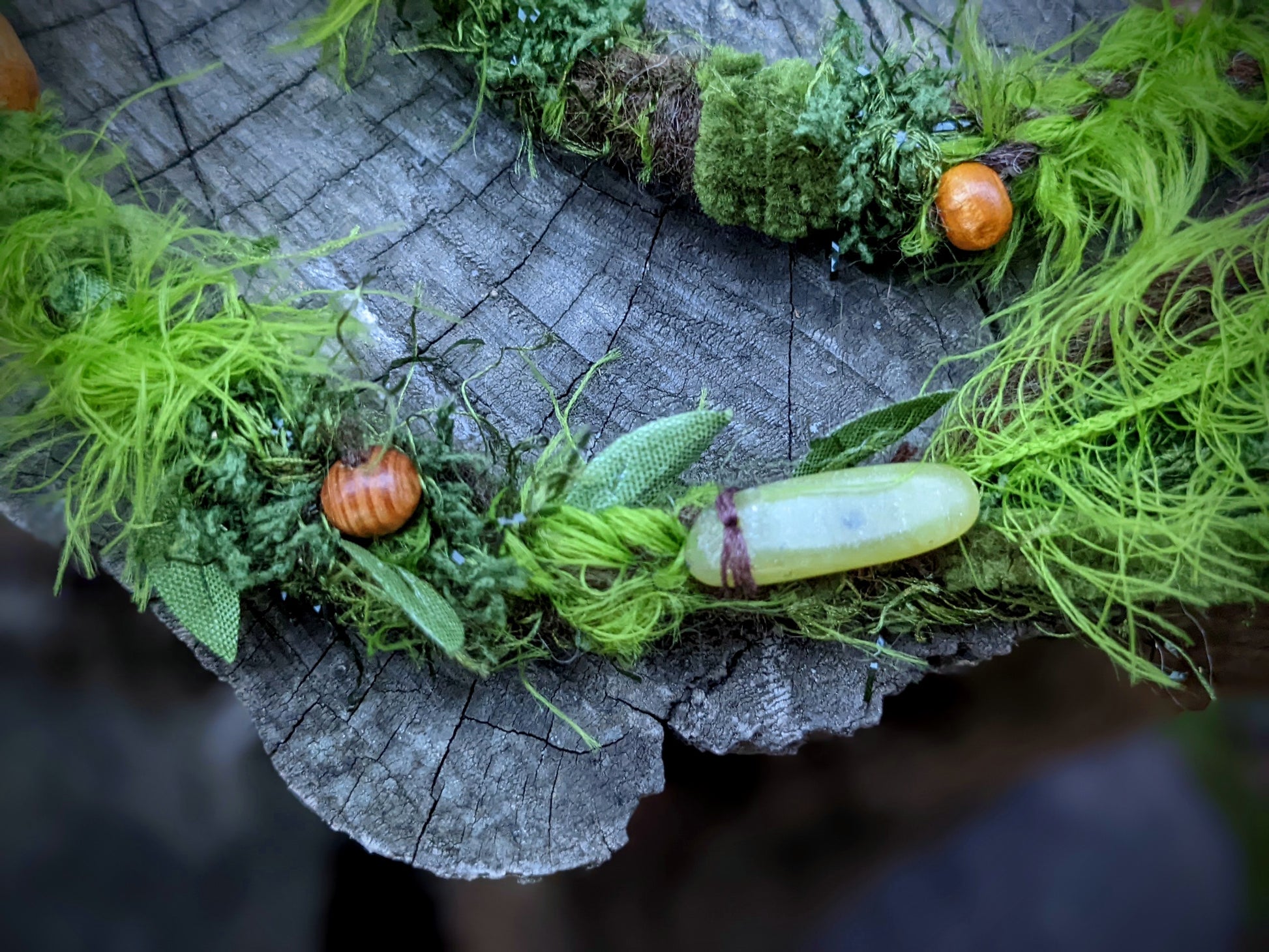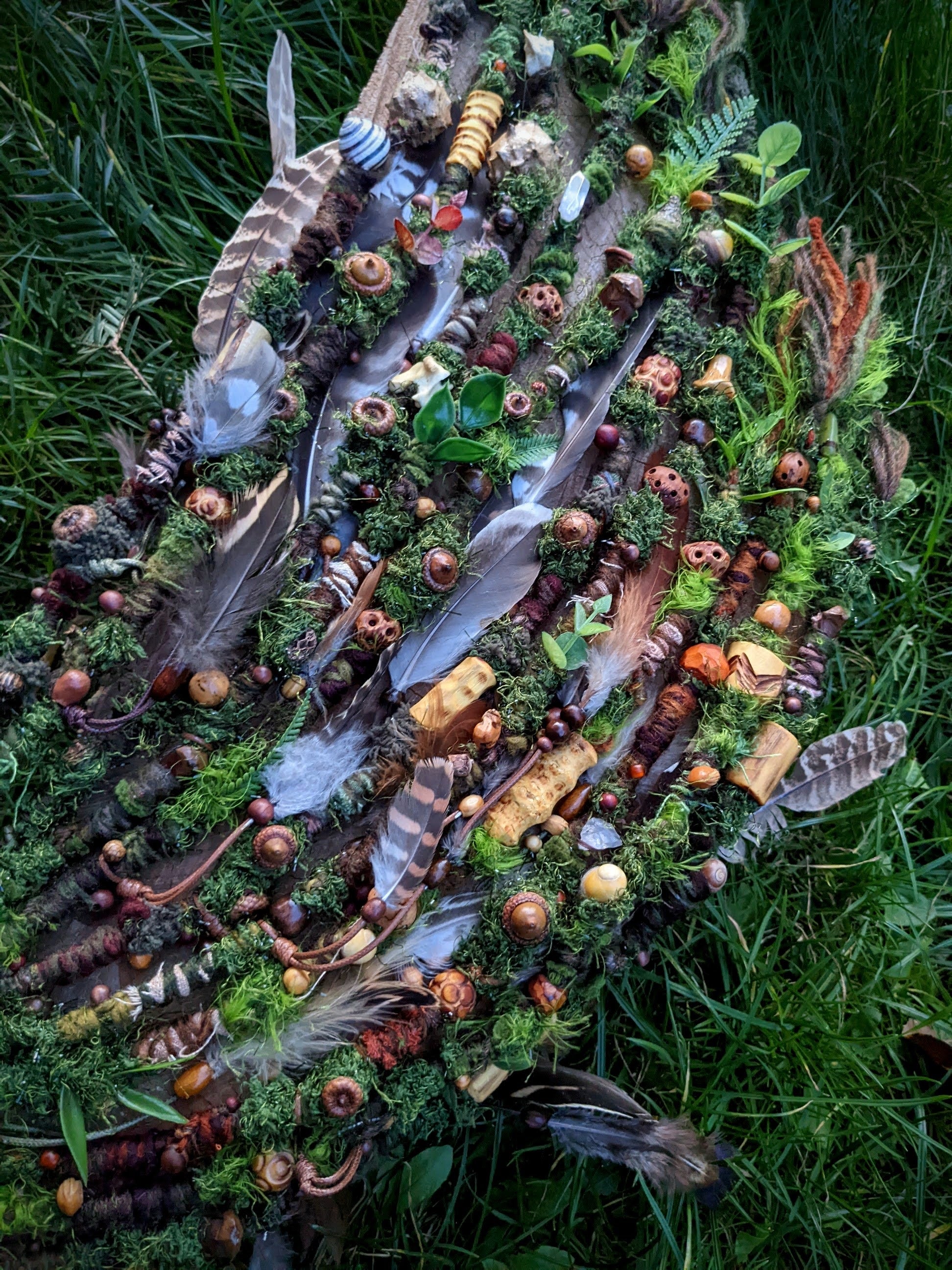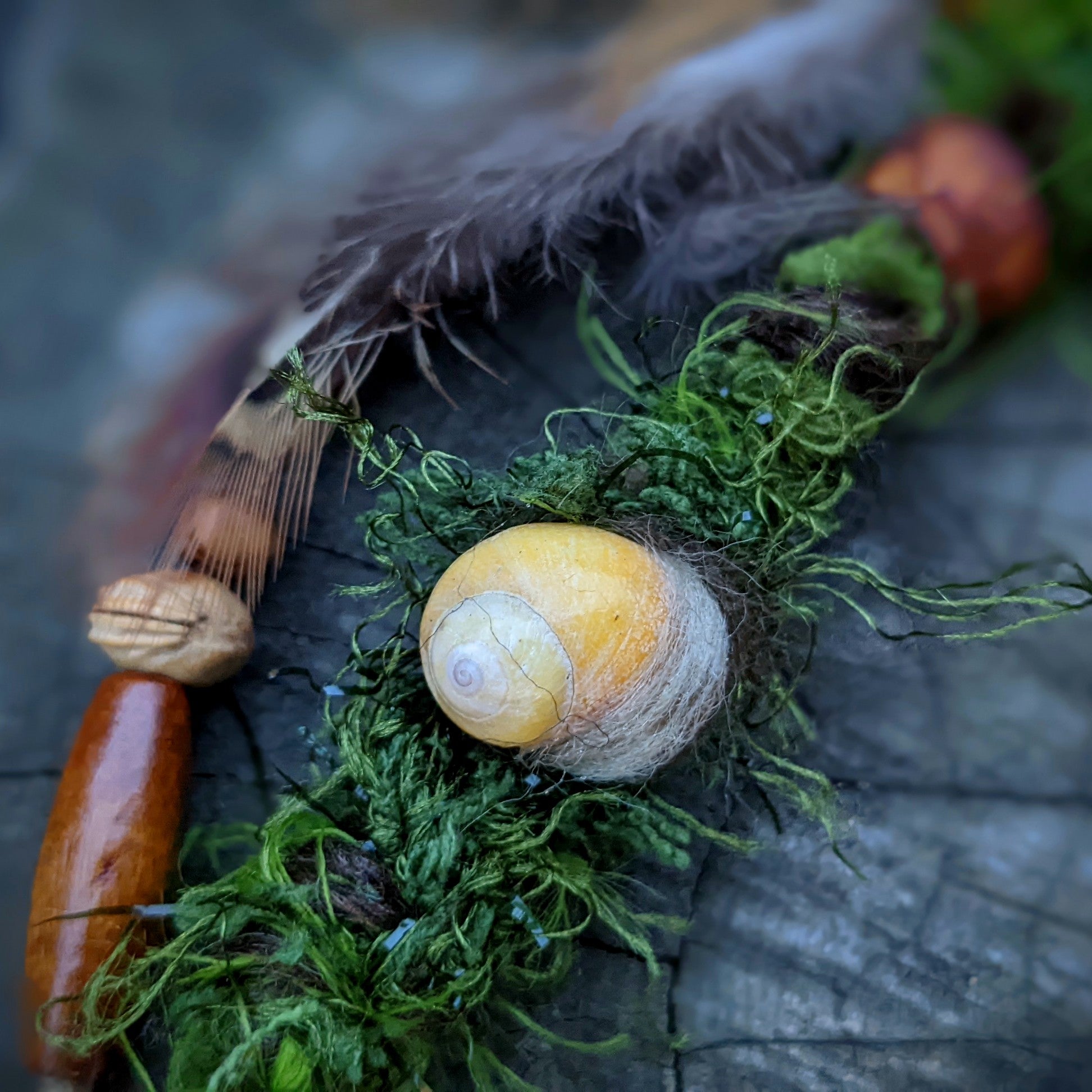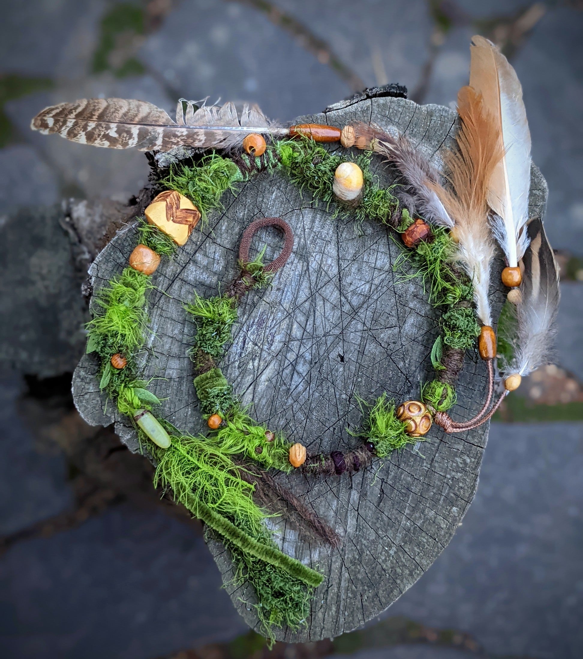 Ozdobný dread z mechové kolekce vyrobený z příze a recyklovaných látek. Zdobeno dřevěnými a semínkovými korálkami, lístečky, ulitou, jadeitem a pírkovým závěsem, který jde z dreadu sundat a použít i samostatně jako pírková ozdoba do vlasů/dreadů.