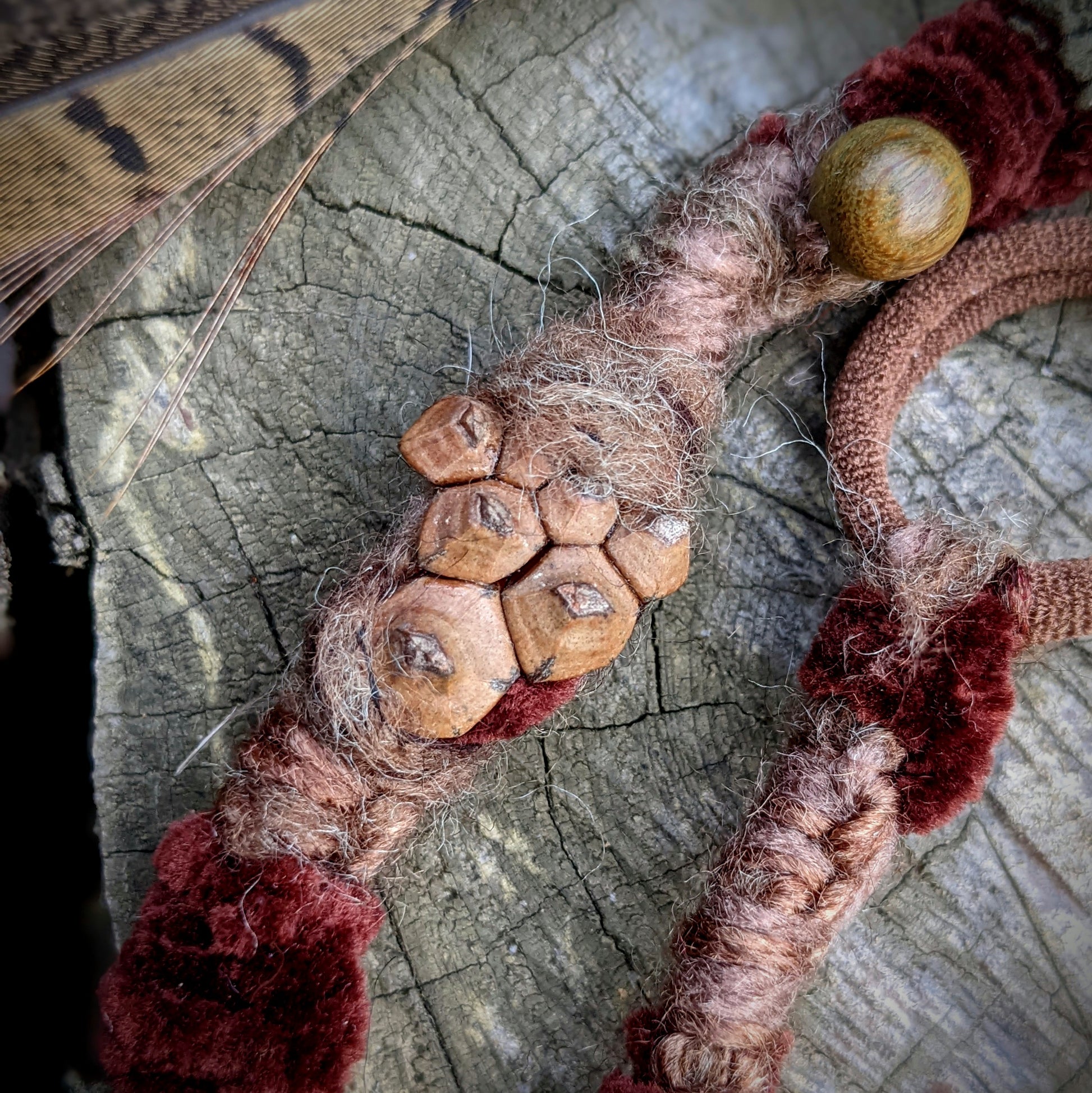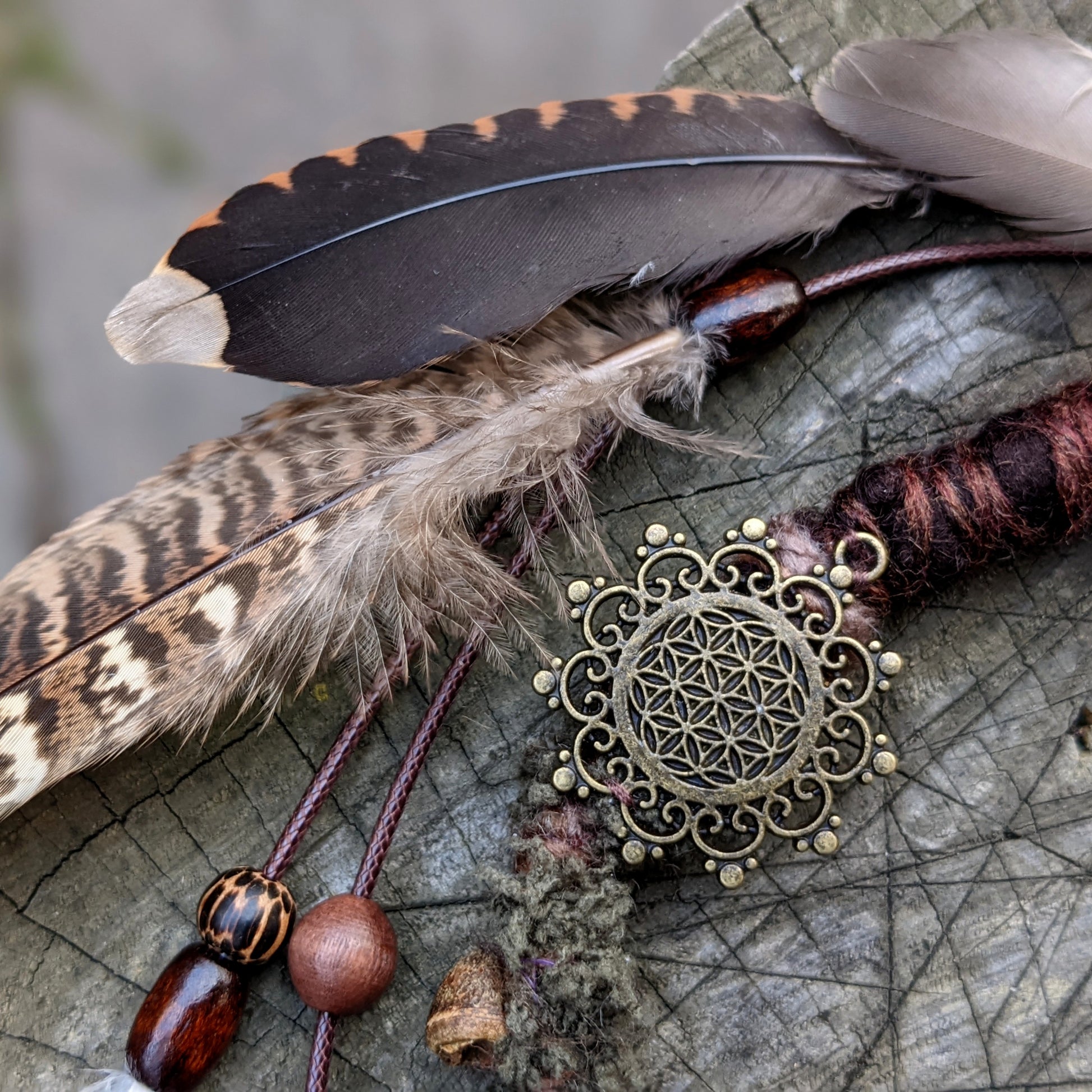 Ozdobný dread vyrobený z příze a recyklovaných látek. Zdobeno dřevěnými korálkami, šiškovými lupínky, mandalou a pírkovým závěsem, který jde z dreadu sundat a použít i samostatně jako pírková ozdoba do vlasů/dreadů.
