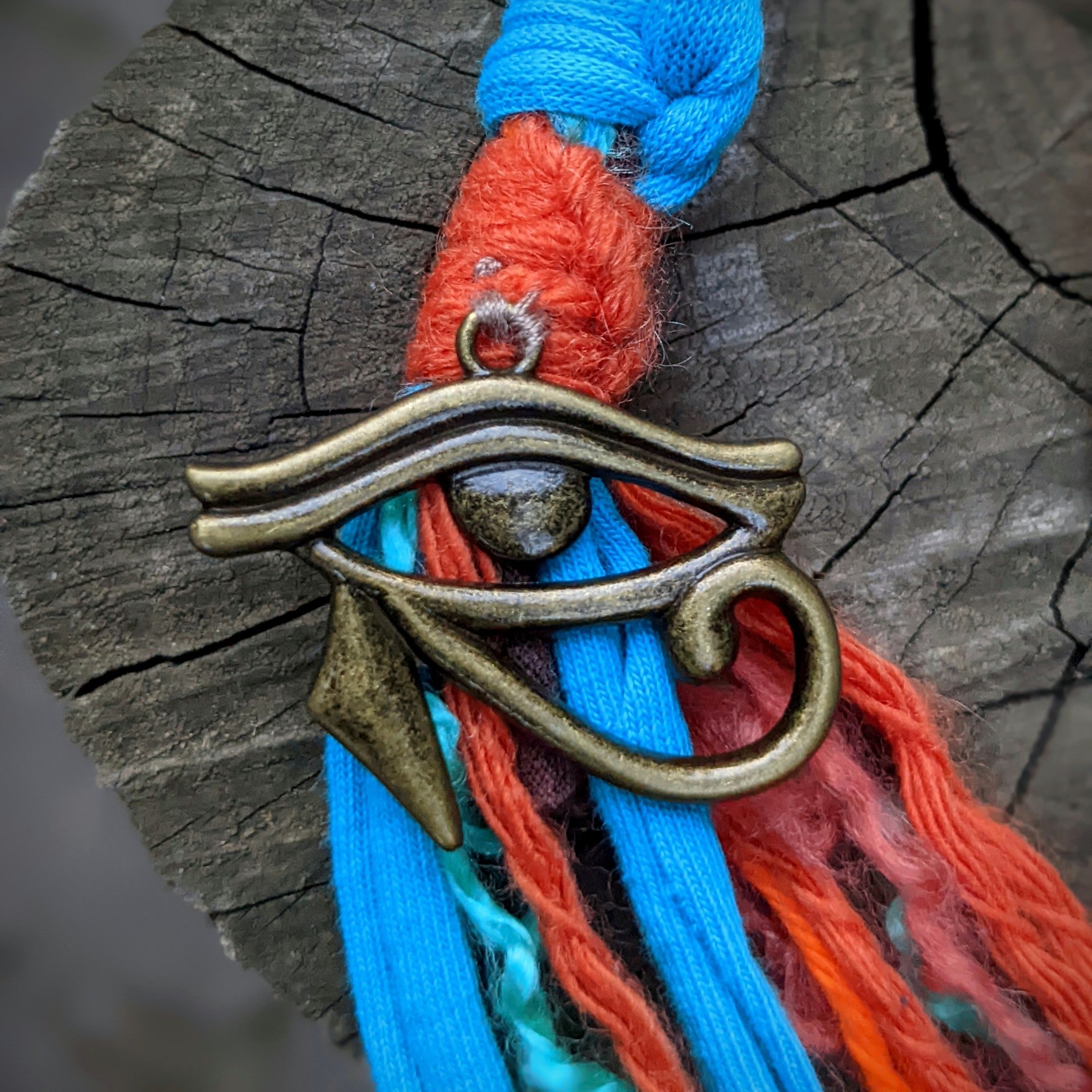 Ozdobný dread vyrobený z příze a recyklovaných látek. Zdobeno dřevěnými a kovovými korálkami, úlomky tyrkenitu a pírkovým závěsem, který jde z dreadu sundat a použít i samostatně jako pírková ozdoba do vlasů/dreadů.