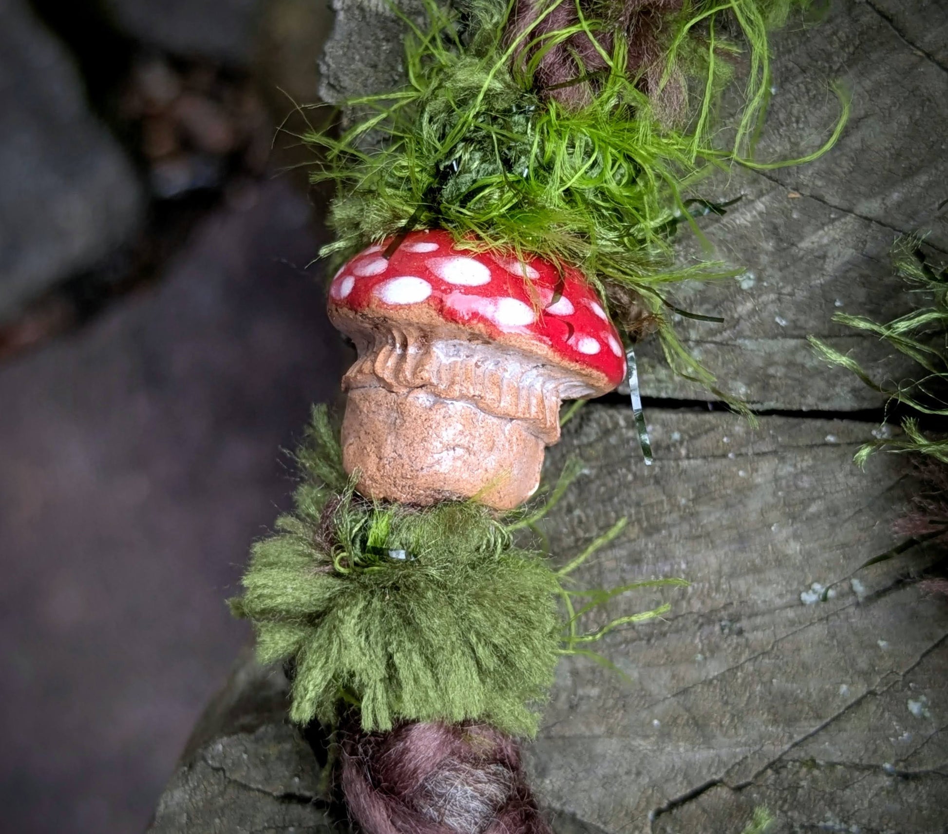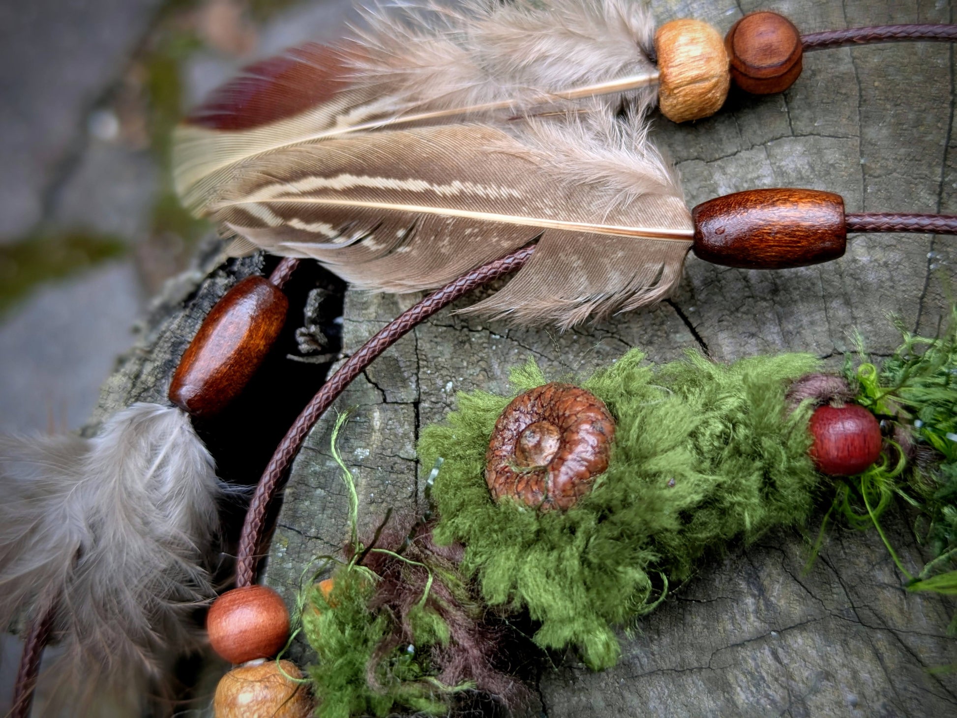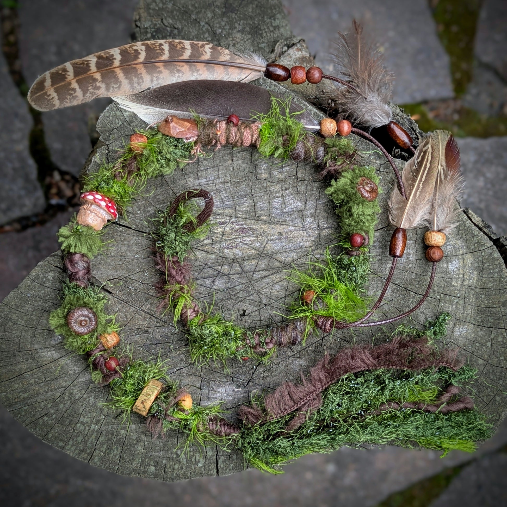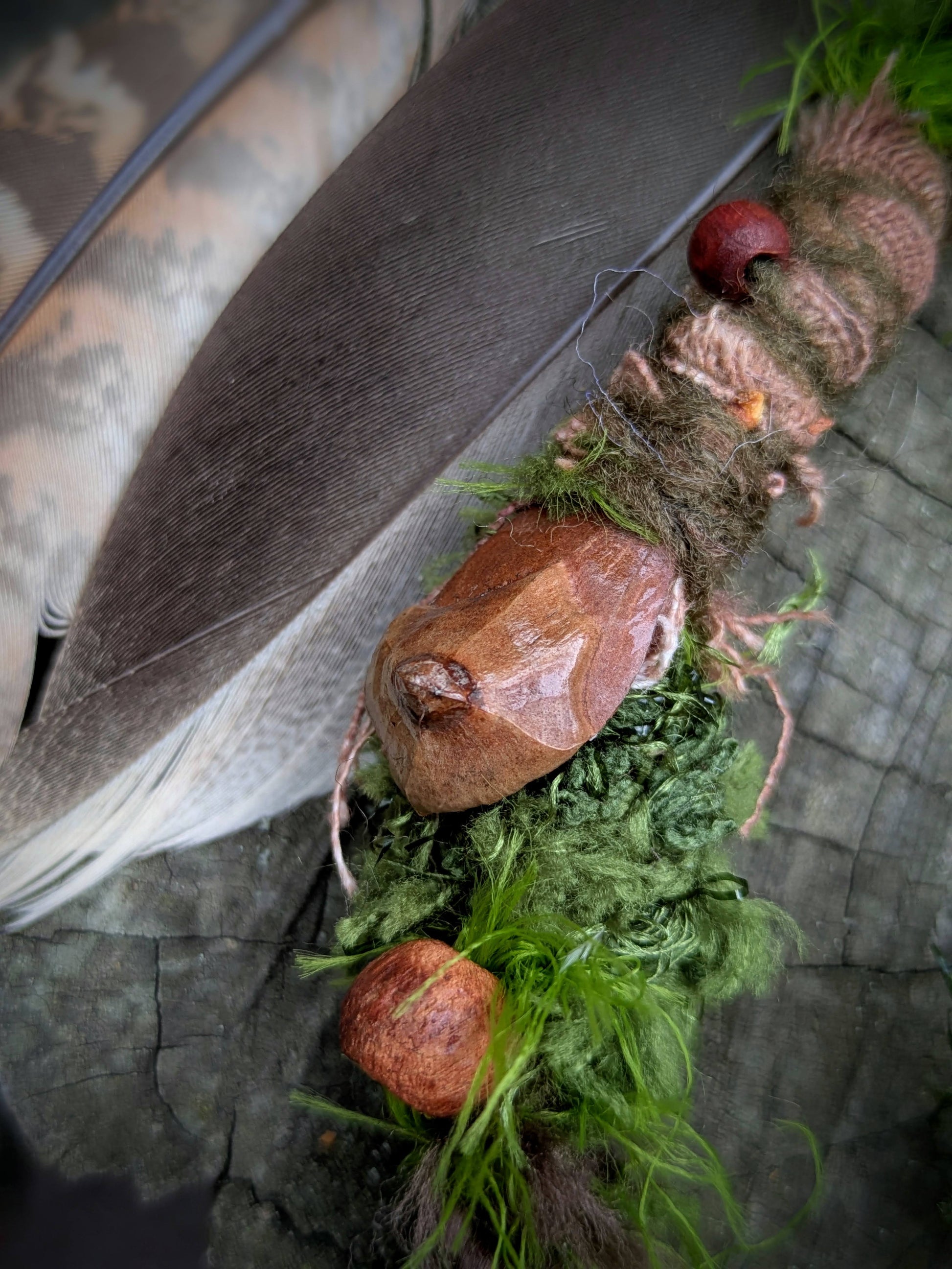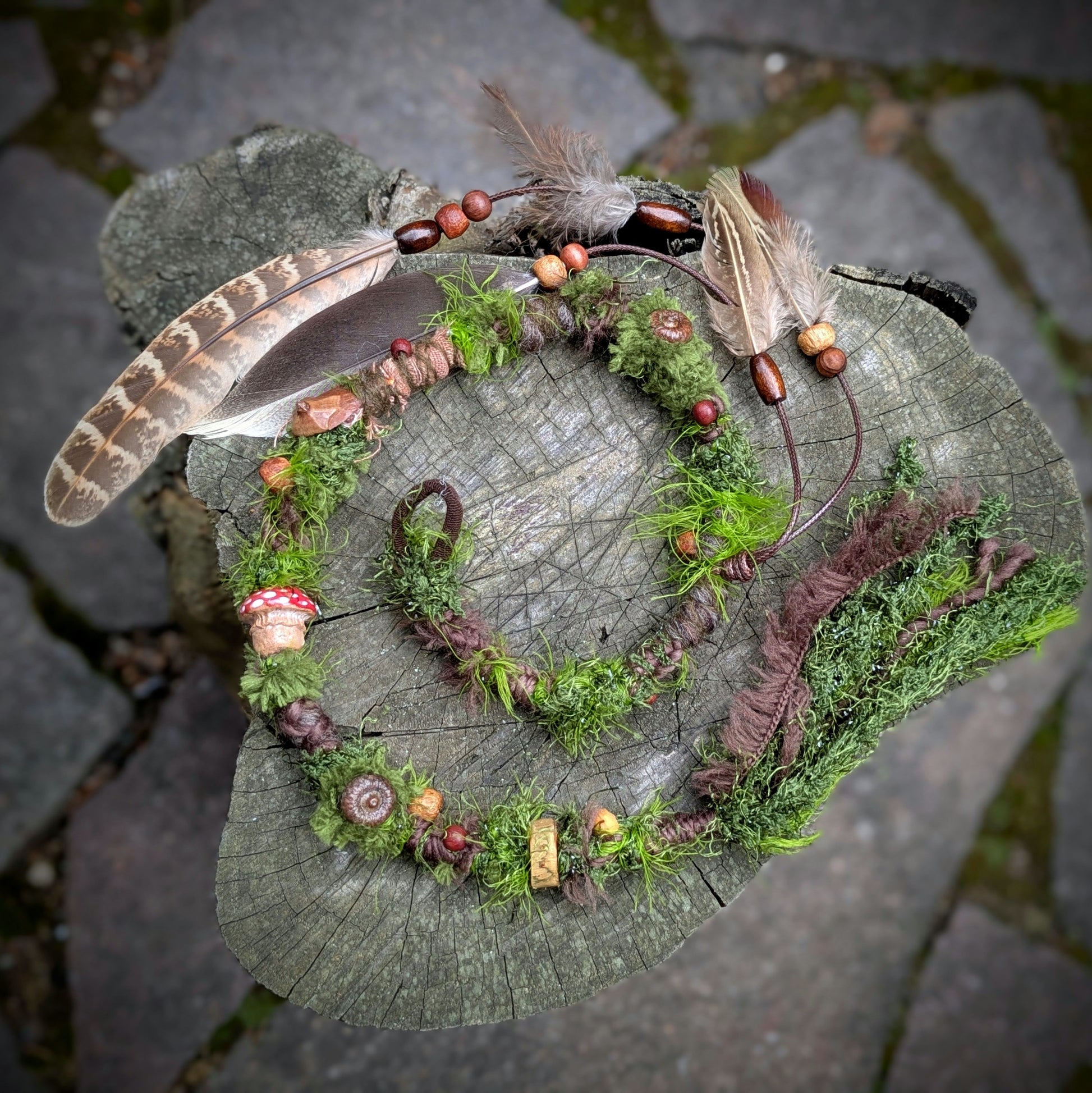 Ozdobný dread mechové struktury vyrobený z příze, merino vlny a recyklovaných látek. Zdobeno dřevěnými a semínkovými korálky, žaludy, šiškovými lupínky, keramickou muchomůrkou a pírkovým závěsem, který jde z dreadu sundat a použít i samostatně jako pírková ozdoba do vlasů/dreadů.