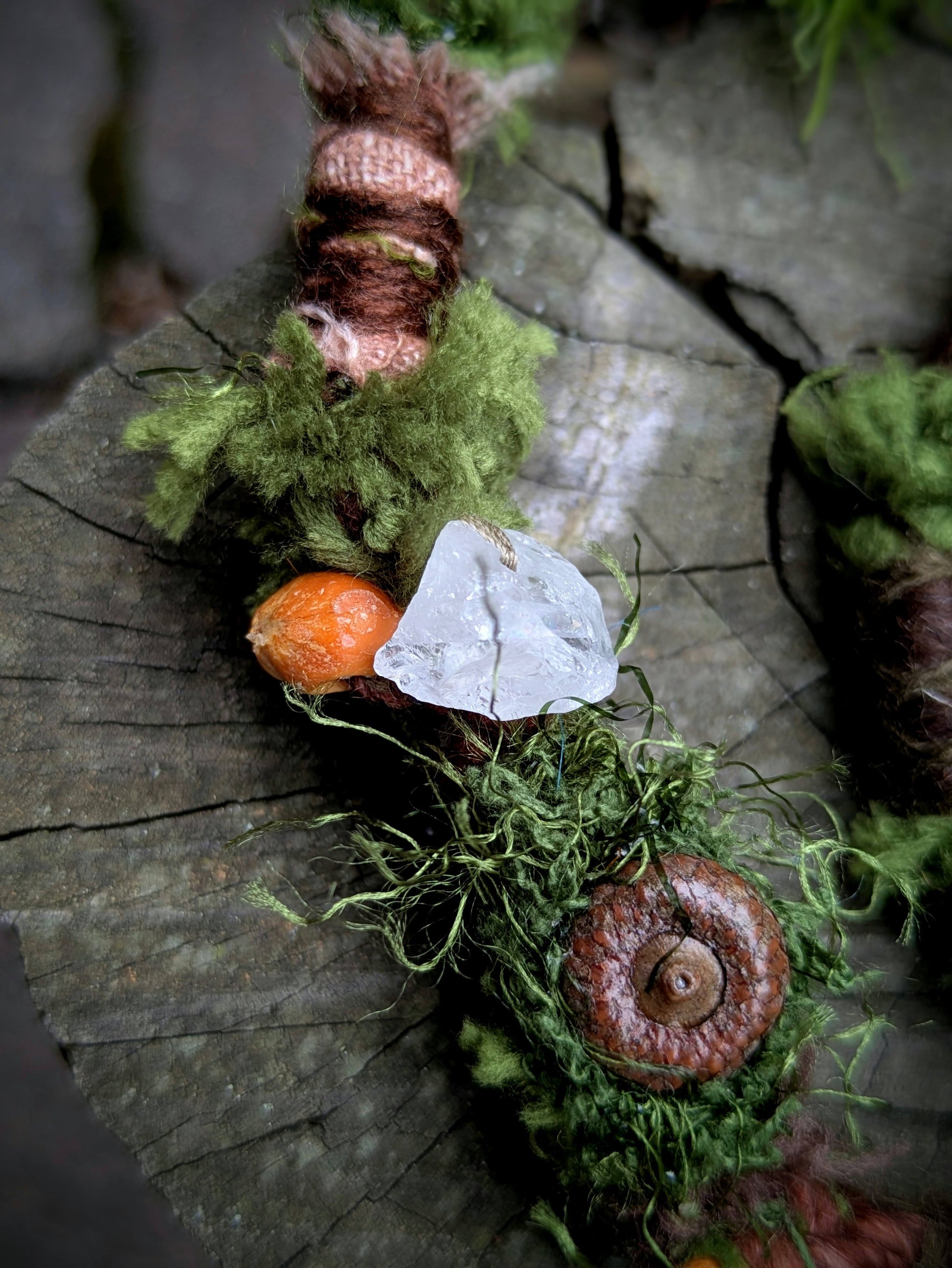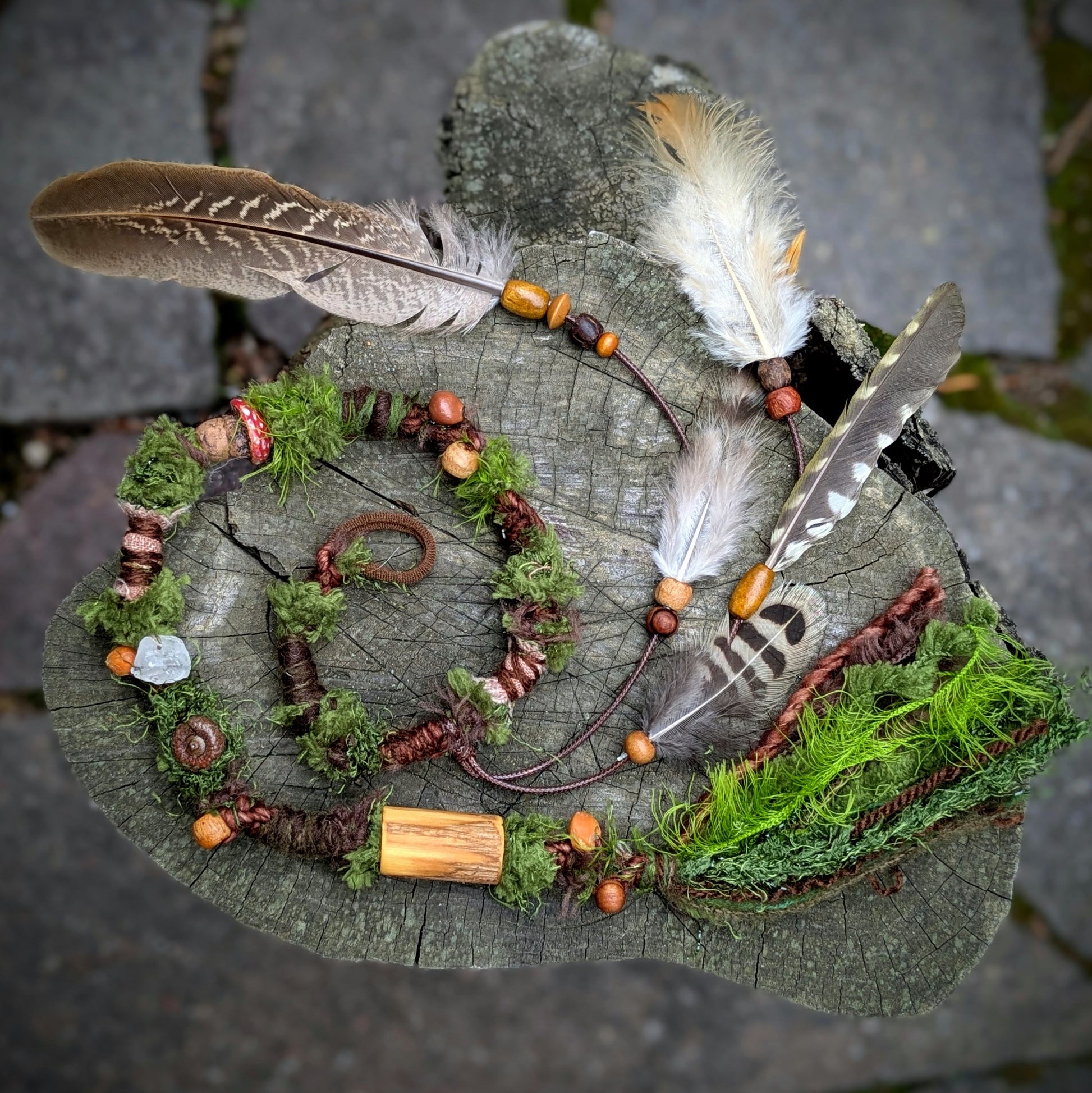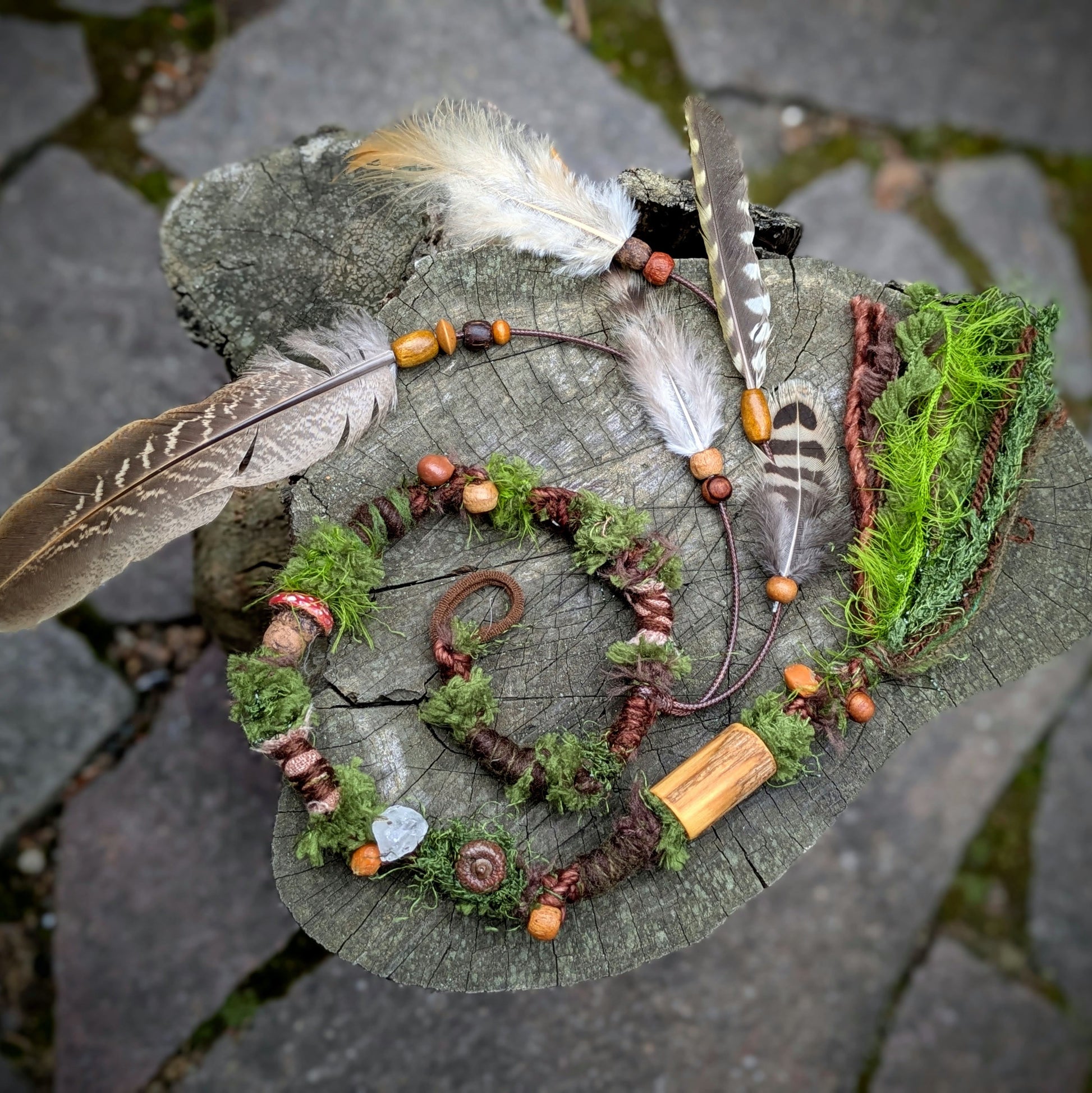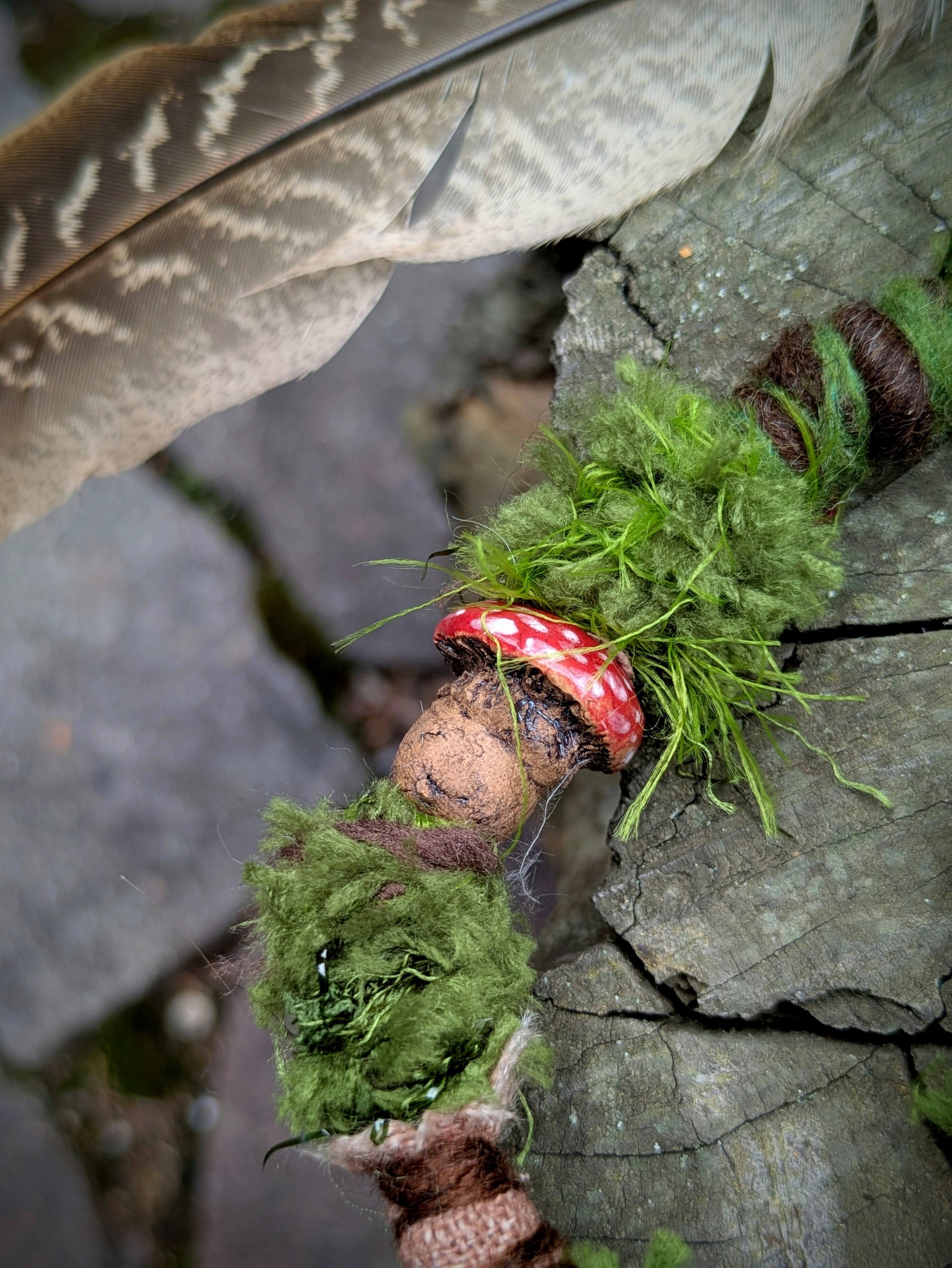 Ozdobný dread mechové struktury vyrobený z příze, merino vlny a recyklovaných látek. Zdobeno dřevěnými a semínkovými korálky, žaludy, krystalem, keramickou muchomůrkou a pírkovým závěsem, který jde z dreadu sundat a použít i samostatně jako pírková ozdoba do vlasů/dreadů.