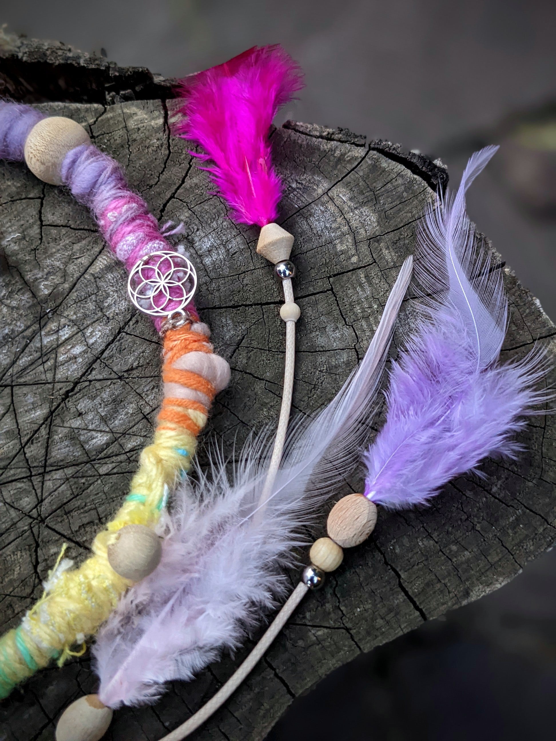 Ozdobný duhový dread vyrobený z příze a recyklovaných látek. Zdobeno dřevěnými korálkami, krystalem, stříbrným přívěskem a pírkovým závěsem, který jde z dreadu sundat a použít i samostatně jako pírková ozdoba do vlasů/dreadů.