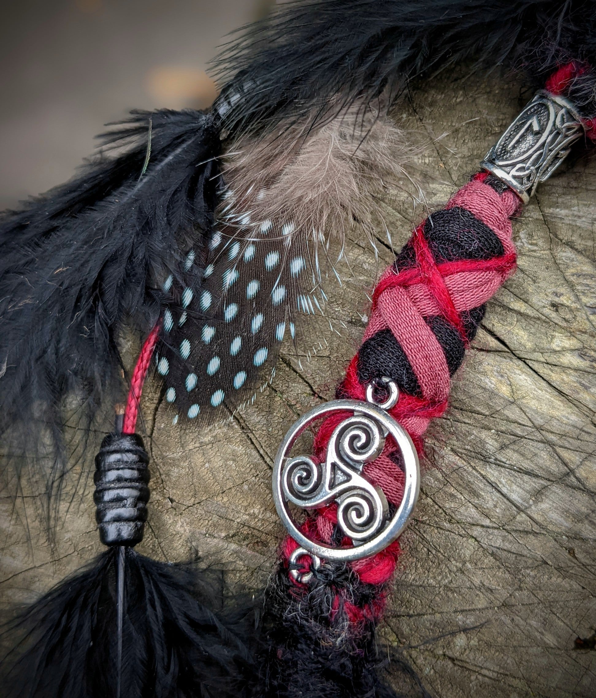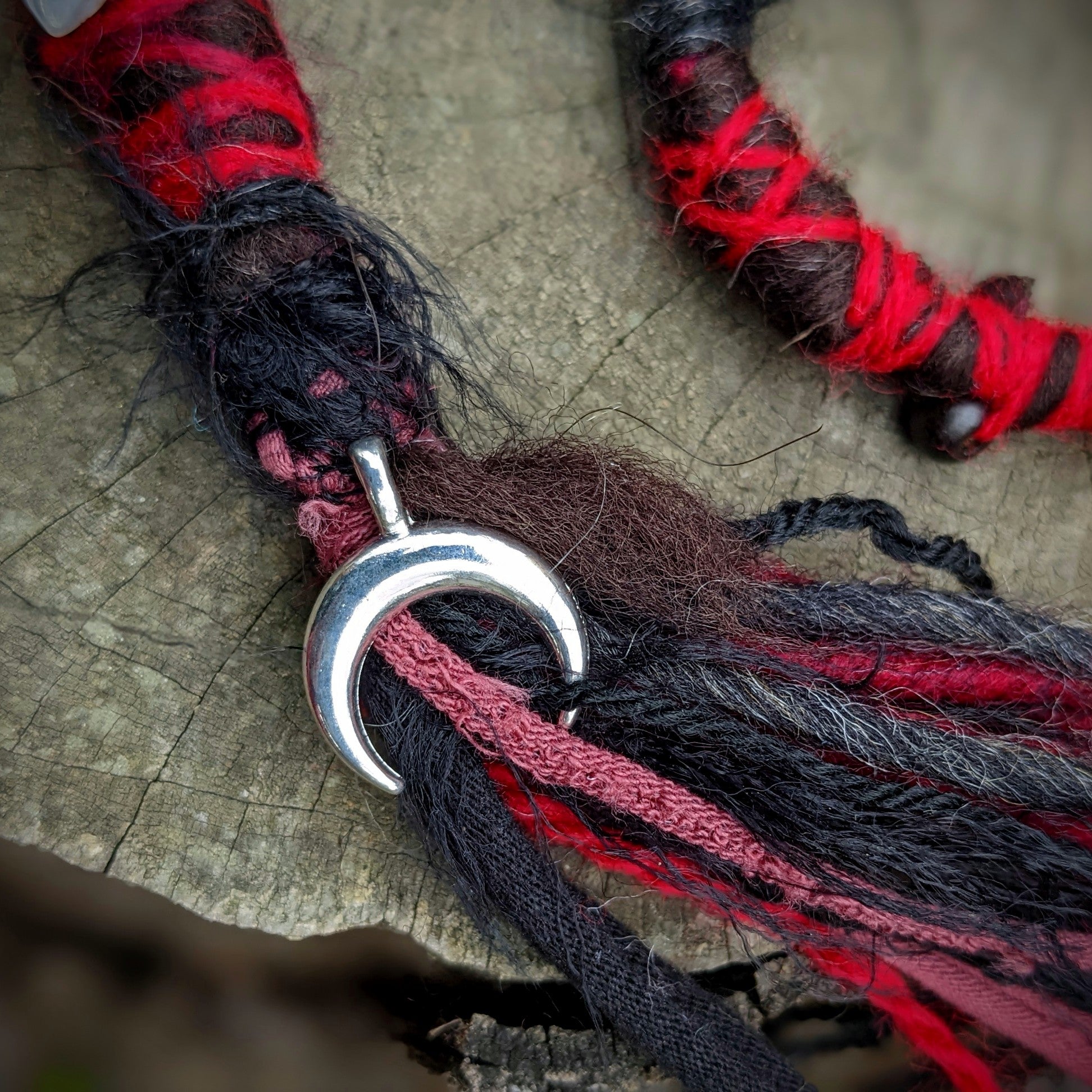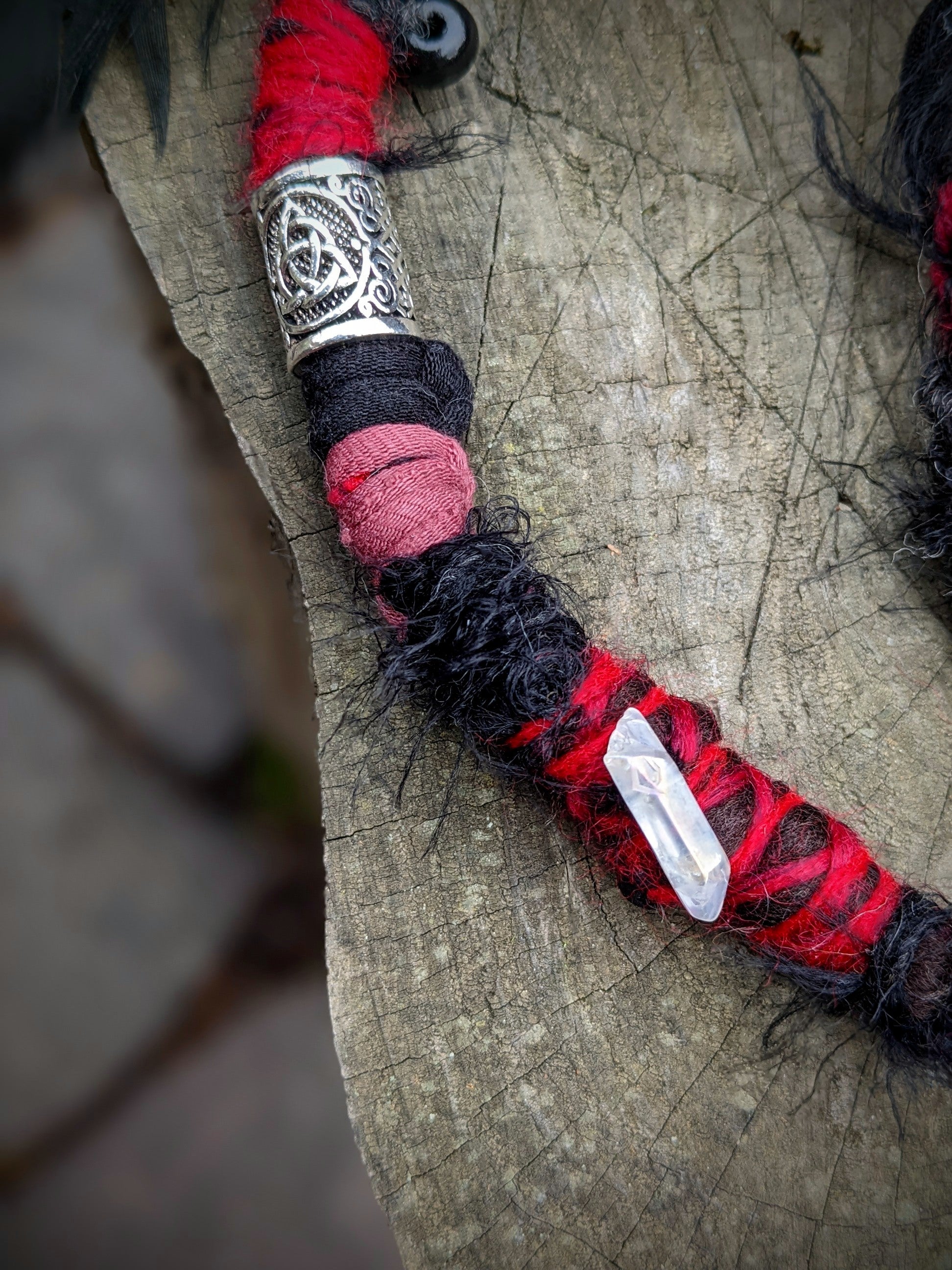Ozdobný dread vyrobený z příze a recyklovaných látek. Zdobeno dřevěnými a kovovými korálkami, krystalem a pírkovým závěsem, který jde z dreadu sundat a použít i samostatně jako pírková ozdoba do vlasů/dreadů.