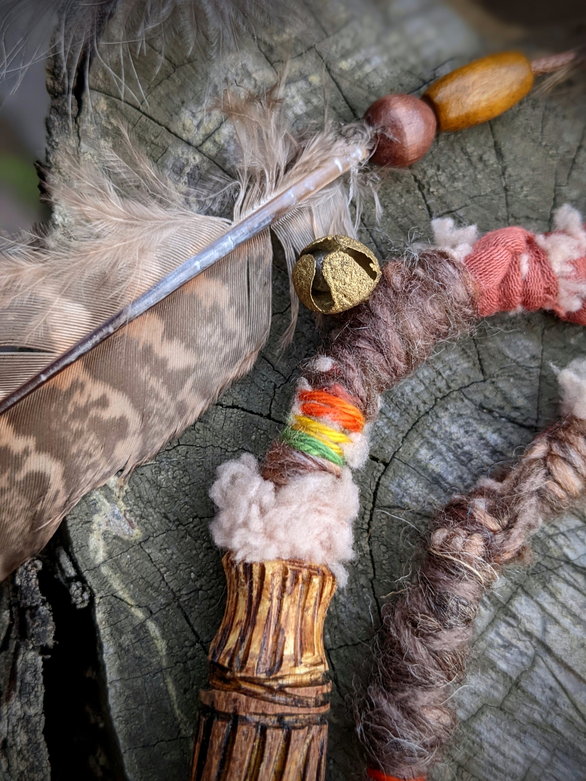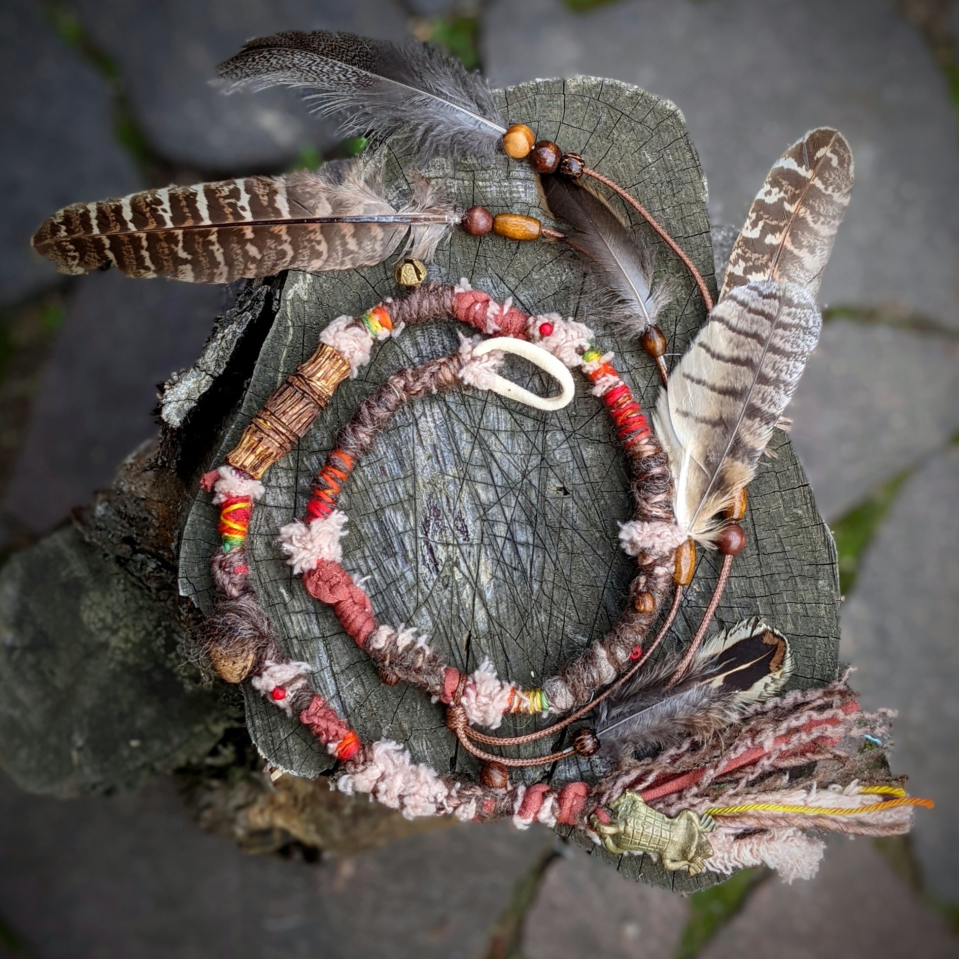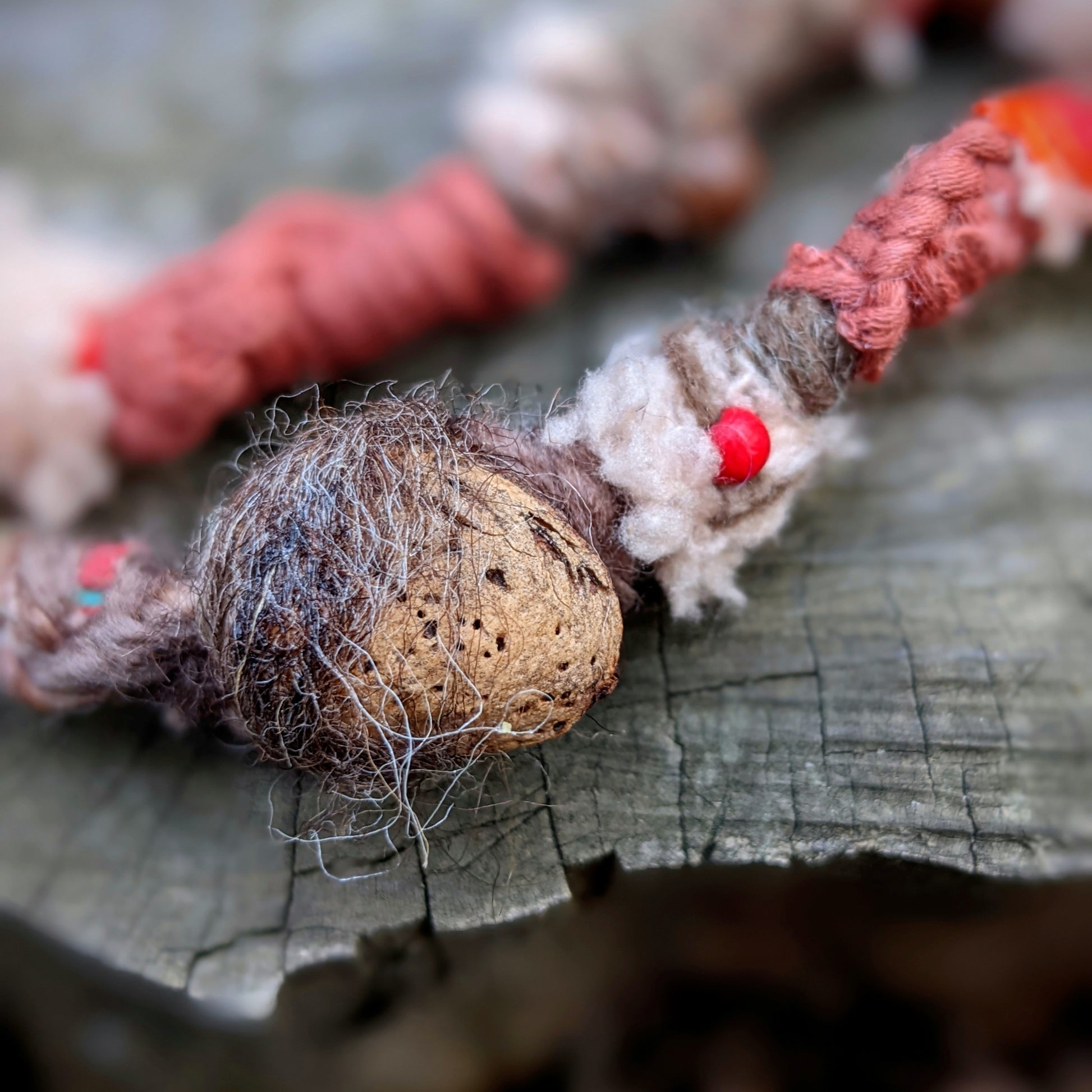 Ozdobný dread vyrobený z příze a recyklovaných látek. Zdobeno dřevěnými korálkami, rolničkou (zvoní!), mosazným africkým přívěskem žáby, mandlovou skořápkou a pírkovým závěsem, který jde z dreadu sundat a použít i samostatně jako pírková ozdoba do vlasů/dreadů.