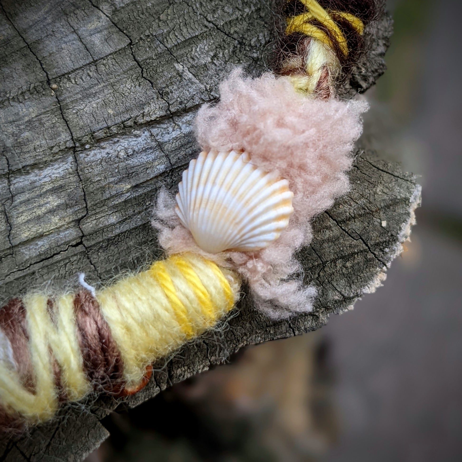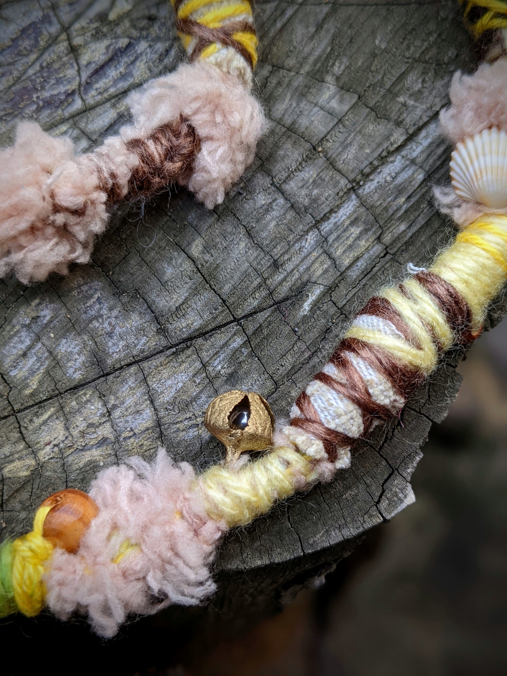 Ozdobný dread vyrobený z příze a recyklovaných látek. Zdobeno dřevěnými korálkami, rolničkou (zvoní!), mušličkou a pírkovým závěsem, který jde z dreadu sundat a použít i samostatně jako pírková ozdoba do vlasů/dreadů.