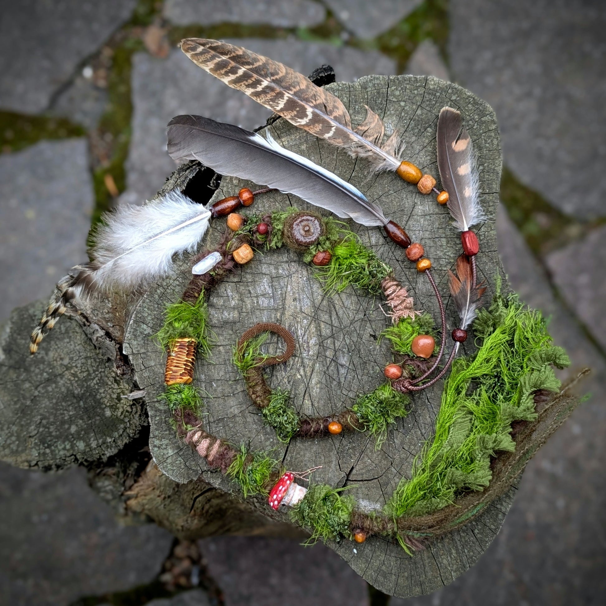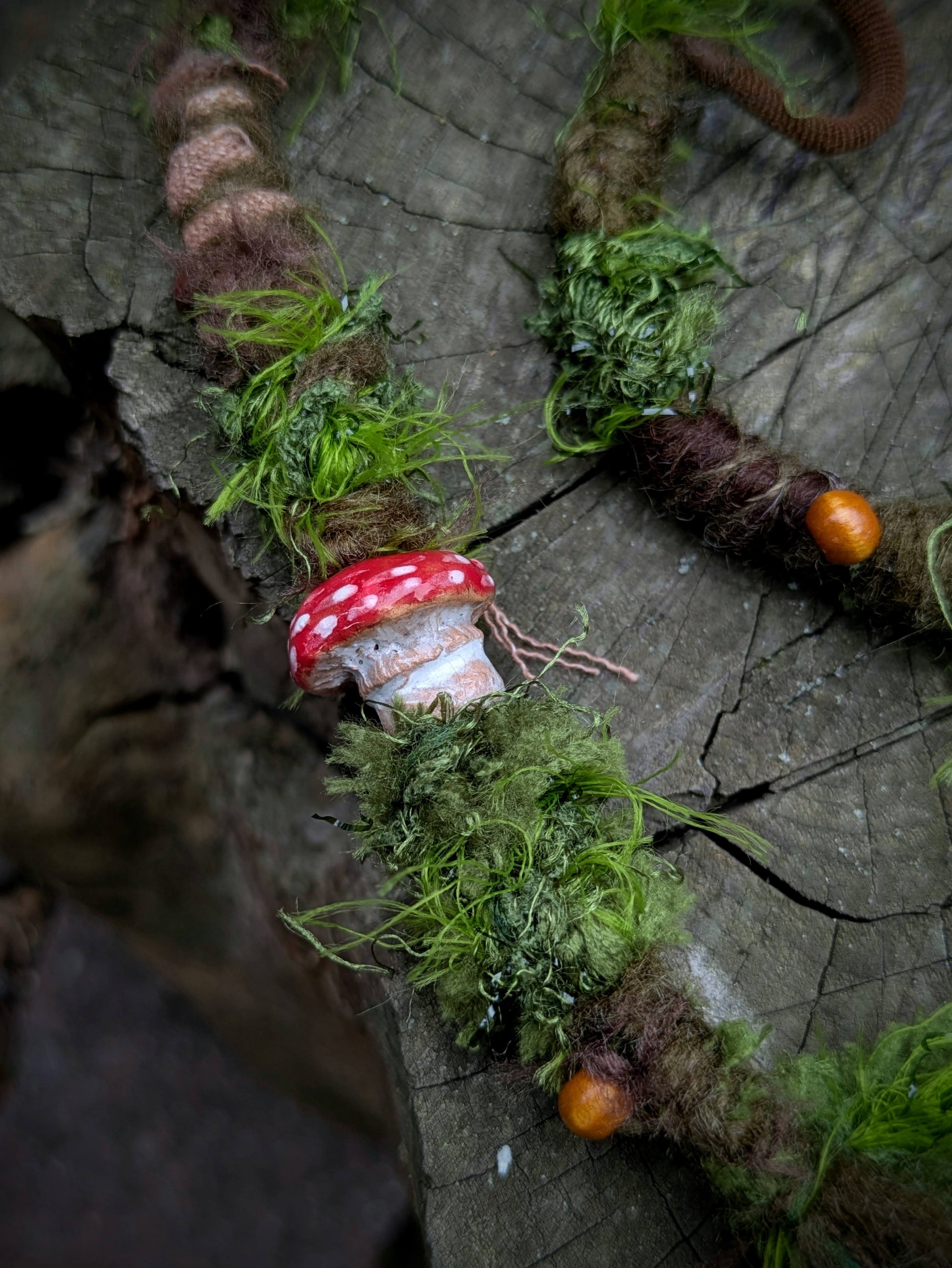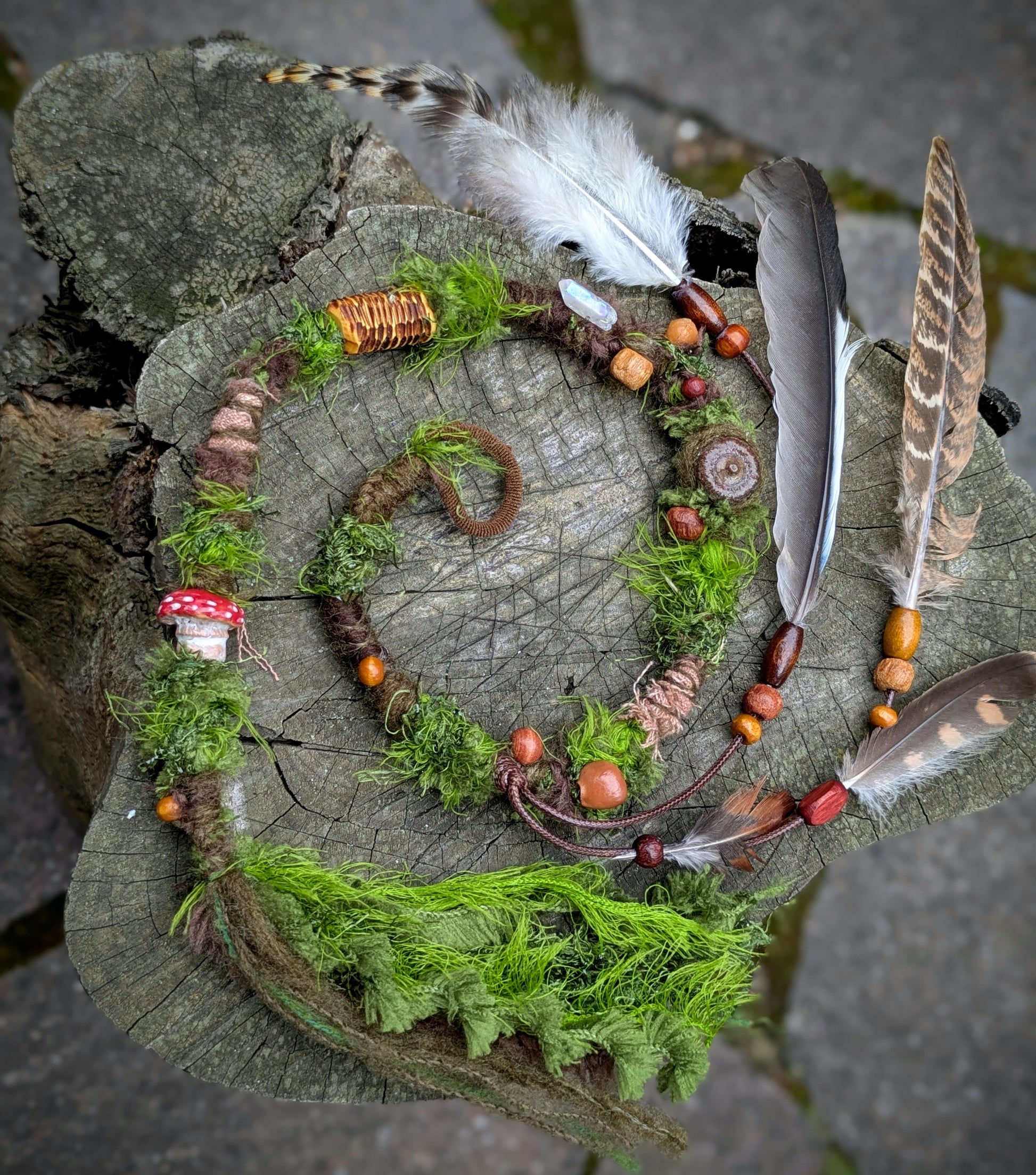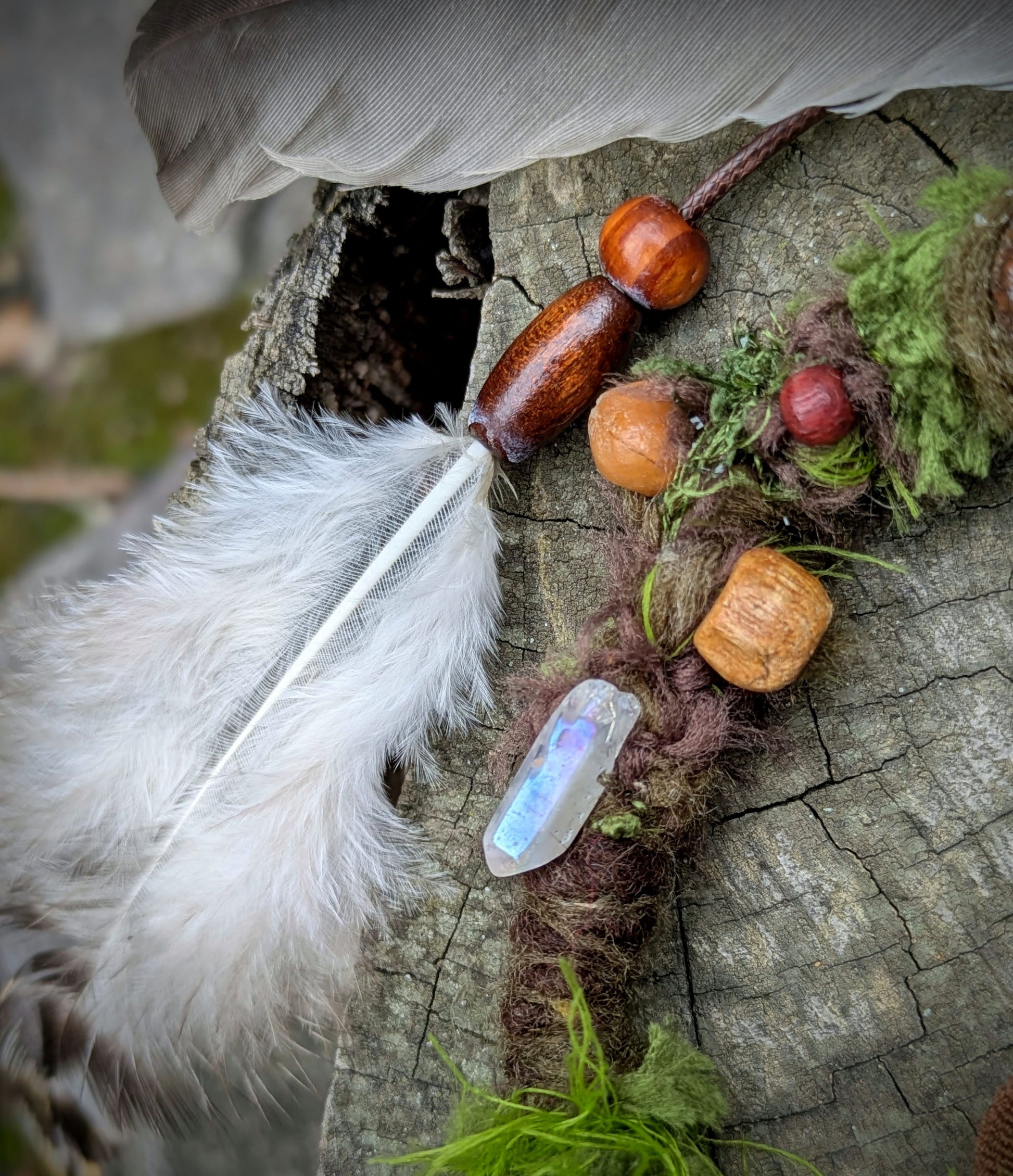 Ozdobný dread mechové struktury vyrobený z příze, merino vlny a recyklovaných látek. Zdobeno dřevěnými a semínkovými korálky, žaludy, šiškovými lupínky, keramickou muchomůrkou, krystalem a pírkovým závěsem, který jde z dreadu sundat a použít i samostatně jako pírková ozdoba do vlasů/dreadů.
