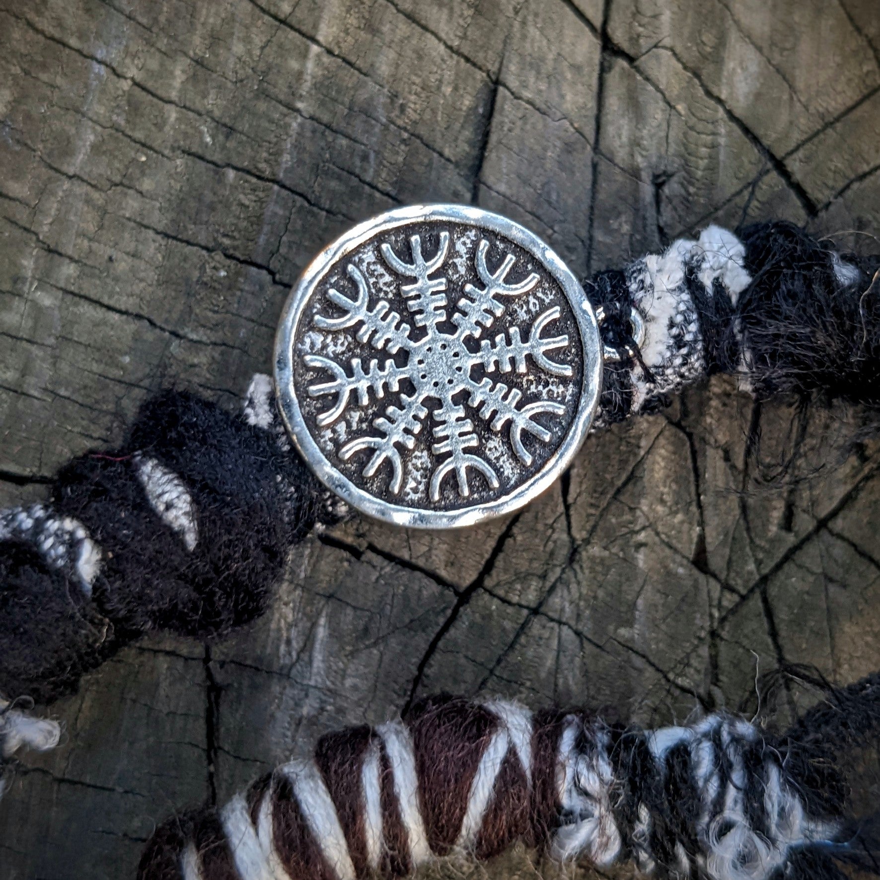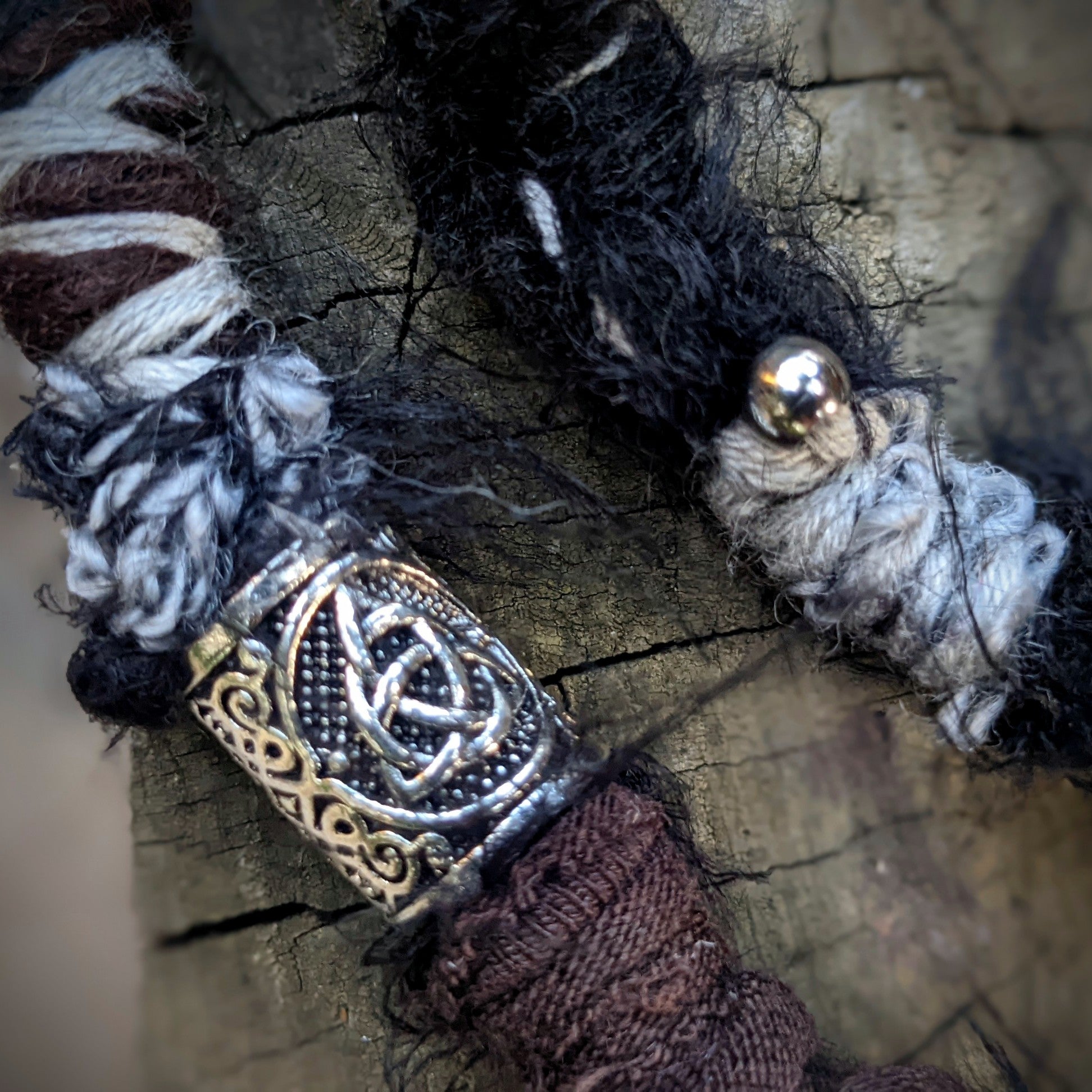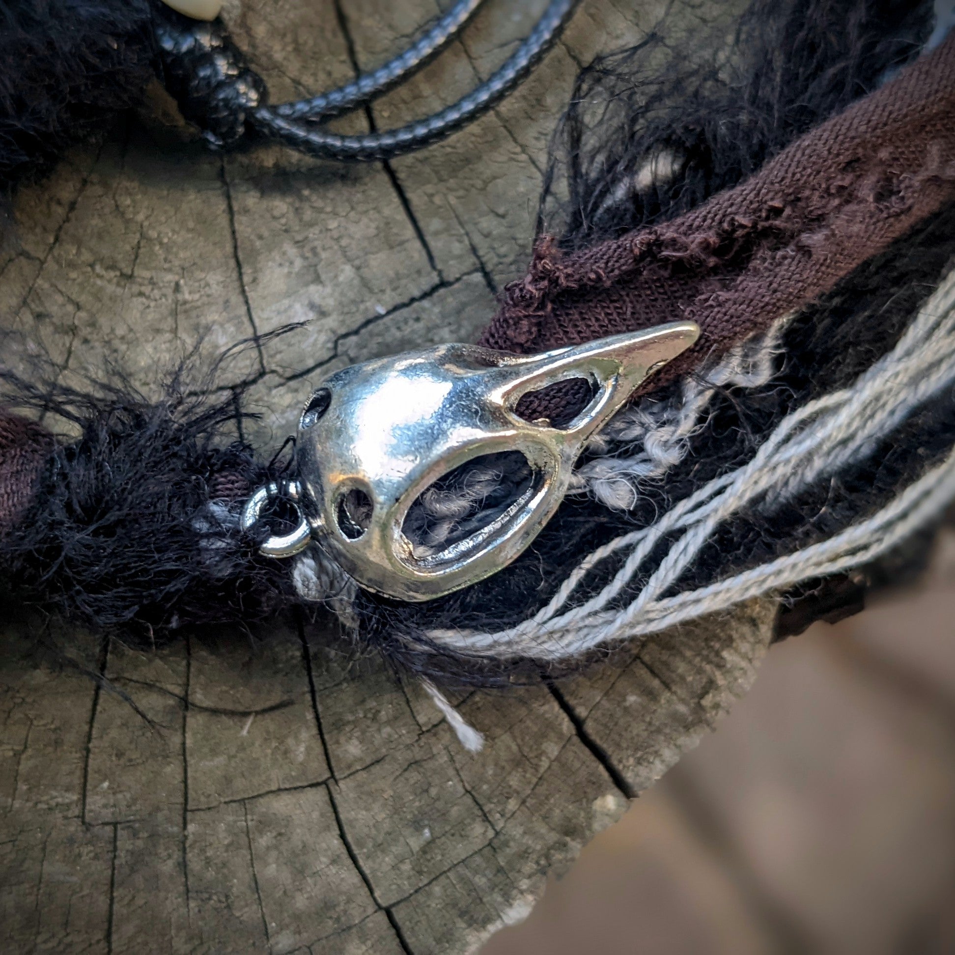 Ozdobný dread vyrobený z příze a recyklovaných látek. Zdobeno kostěnými a kovovými korálkami, kovovými přívěsky, lebkou a pírkovým závěsem, který jde z dreadu sundat a použít i samostatně jako pírková ozdoba do vlasů/dreadů.