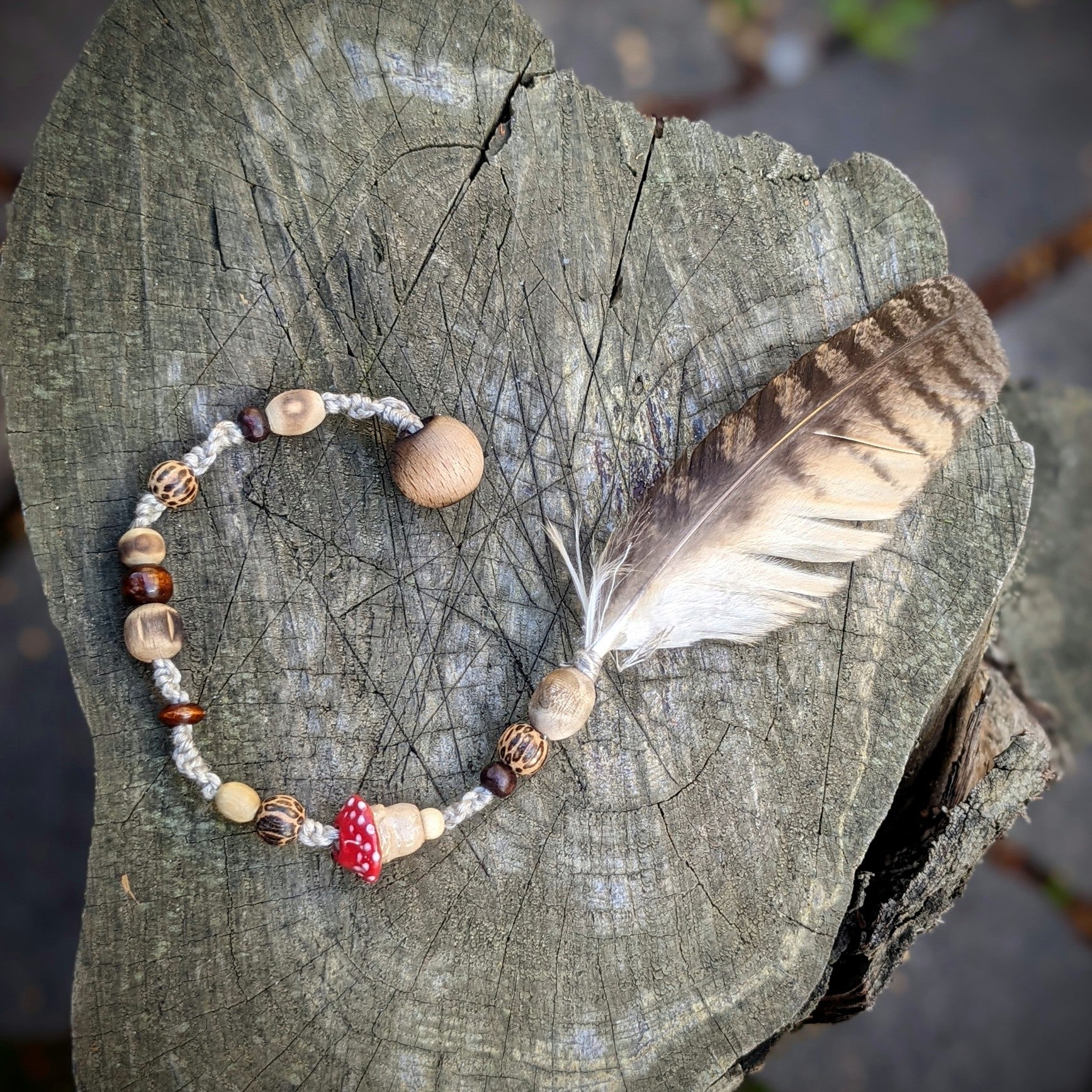 Závěs je vyrobený z lněné šňůrky, kostěných a dřevěných korálků. Zdobeno keramickou muchomůrkou (rucní výroba Rhubarb) a pírky. Délka závěsu včetně pírka je cca 30 cm.