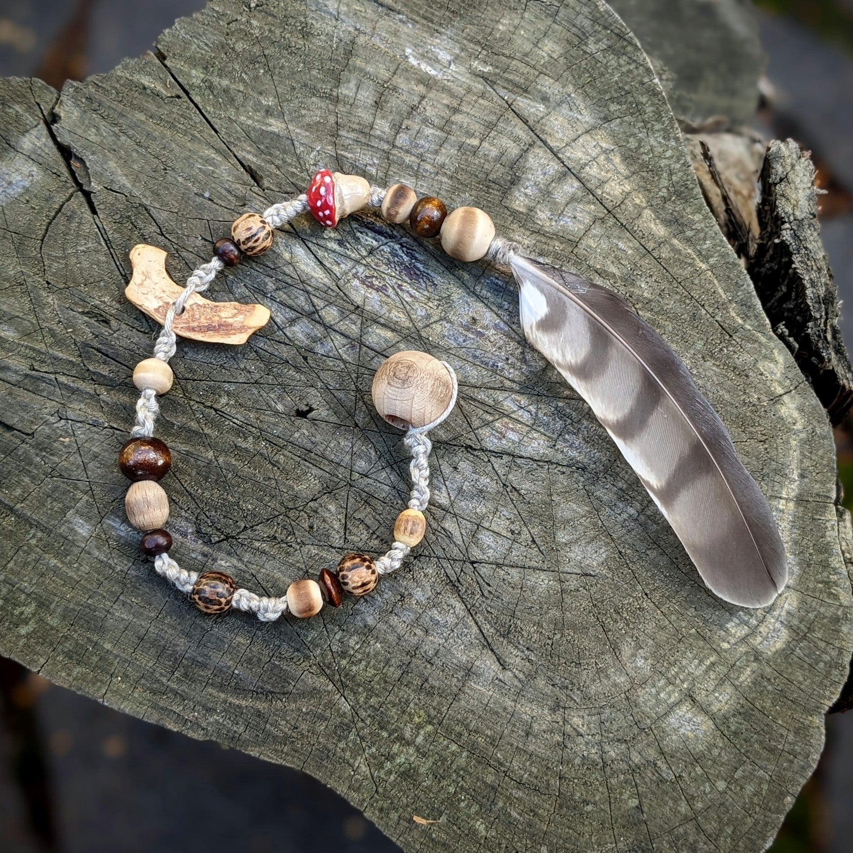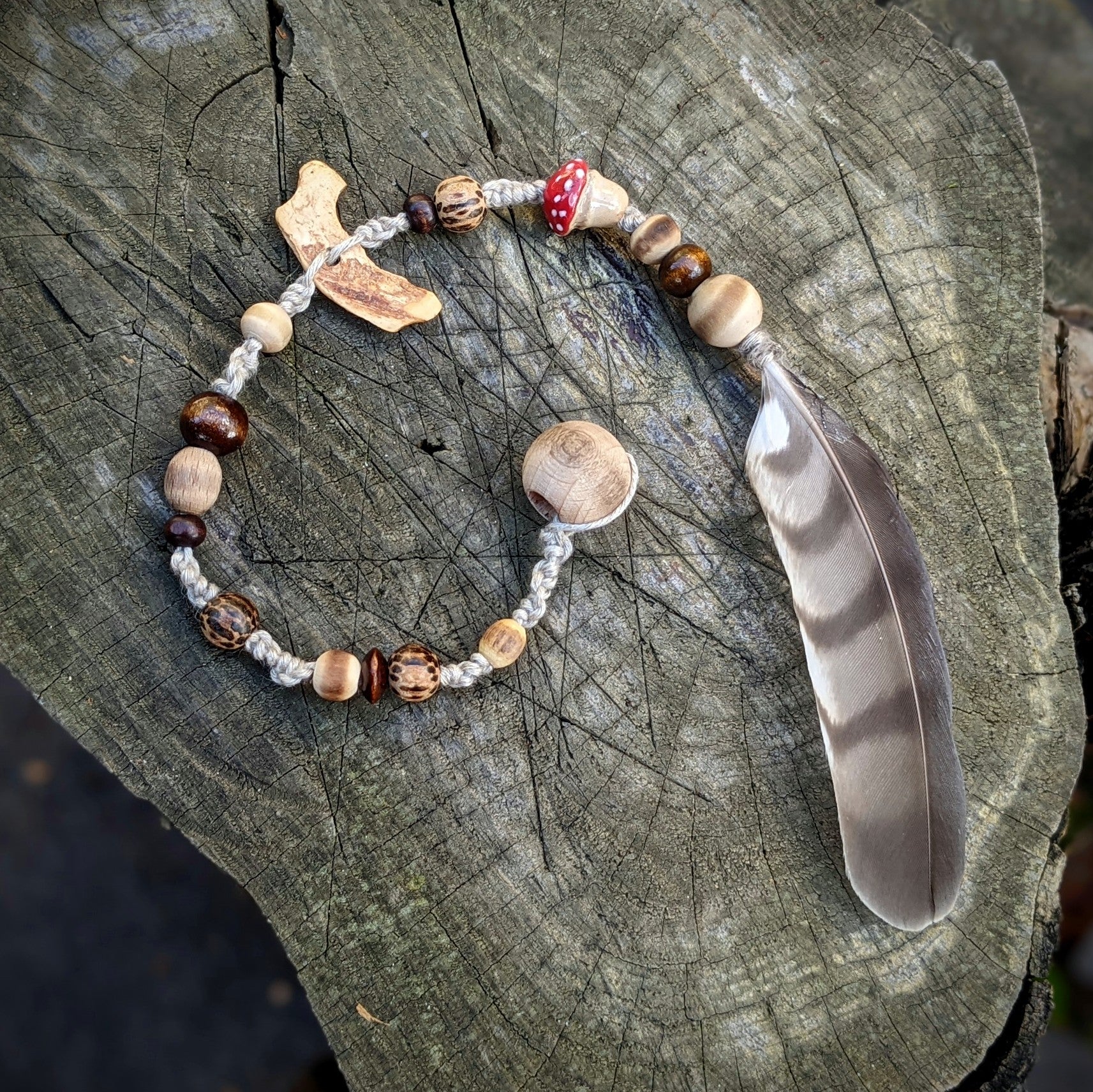 Závěs je vyrobený z lněné šňůrky, kostěných a dřevěných korálků. Zdobeno keramickou muchomůrkou (rucní výroba Rhubarb) a pírky. Délka závěsu včetně pírka je cca 30 cm.
