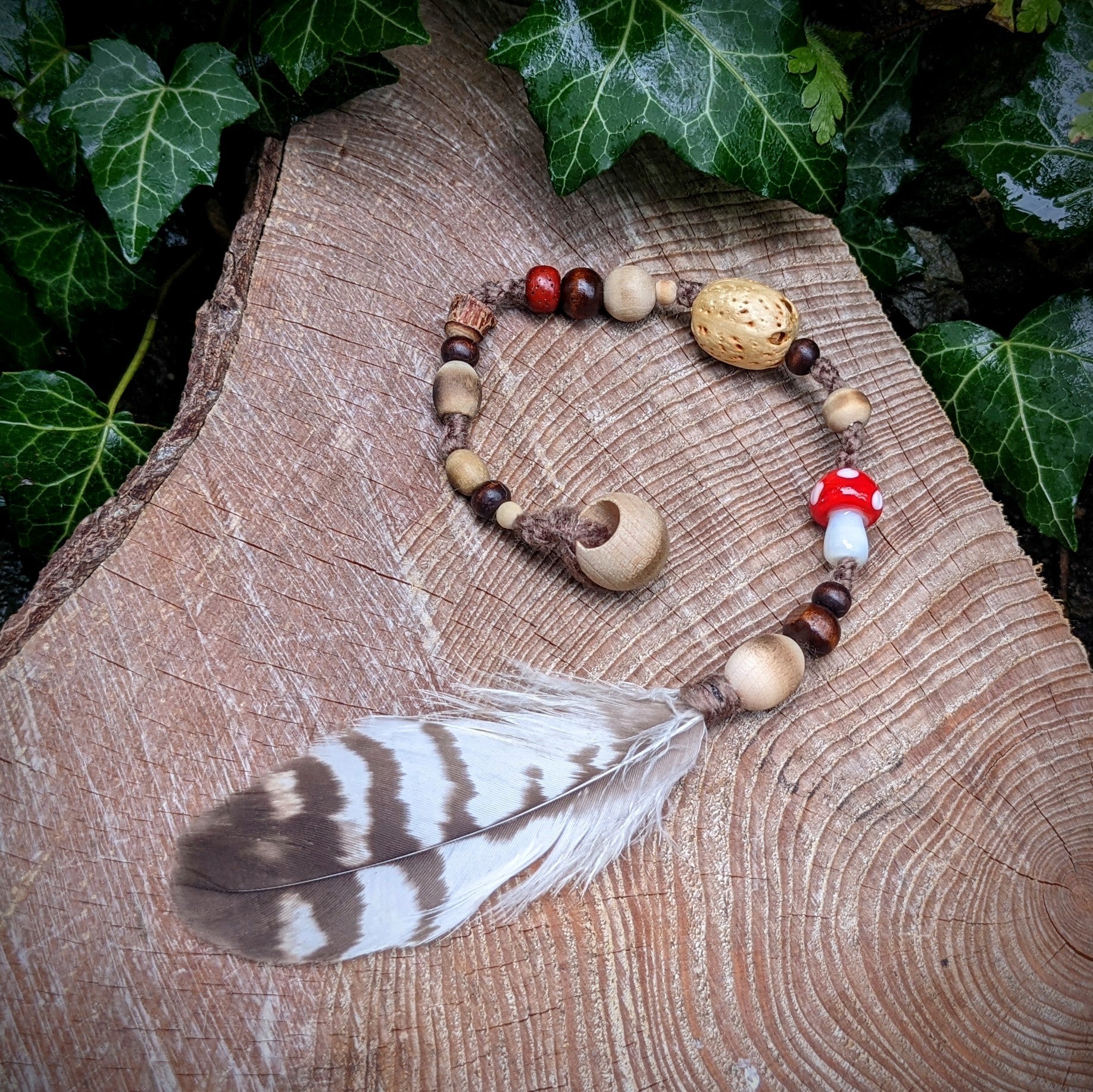 Závěs je vyrobený z příze, dřevěných korálků, semínek... Zdobeno skleněnou muchomůrkou a káněcím peříčkem. Délka visací části je 26 cm.