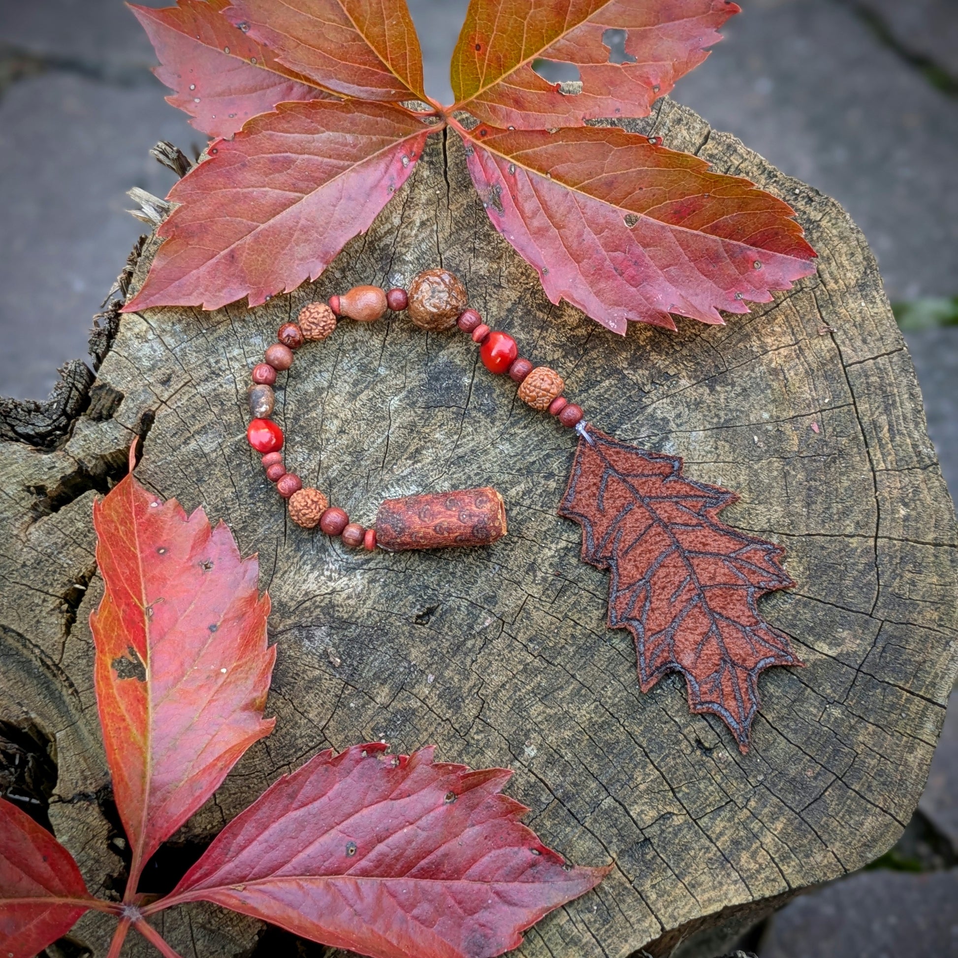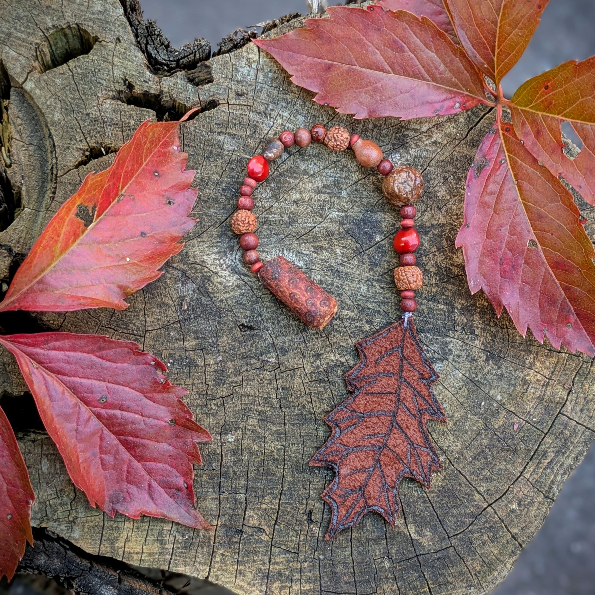 Závěs je vyrobený ze semínkových a dřevěných korálků a korálku z duběnky... Zdobeno lístkovým přívěskem ručně vypáleným do odřezku kůže. Délka visací části je 20 cm.