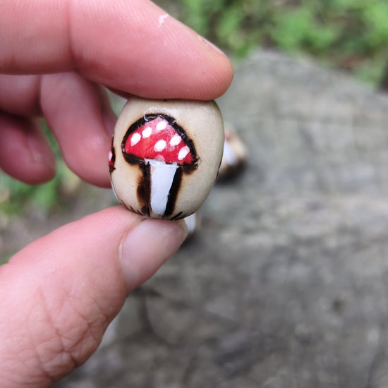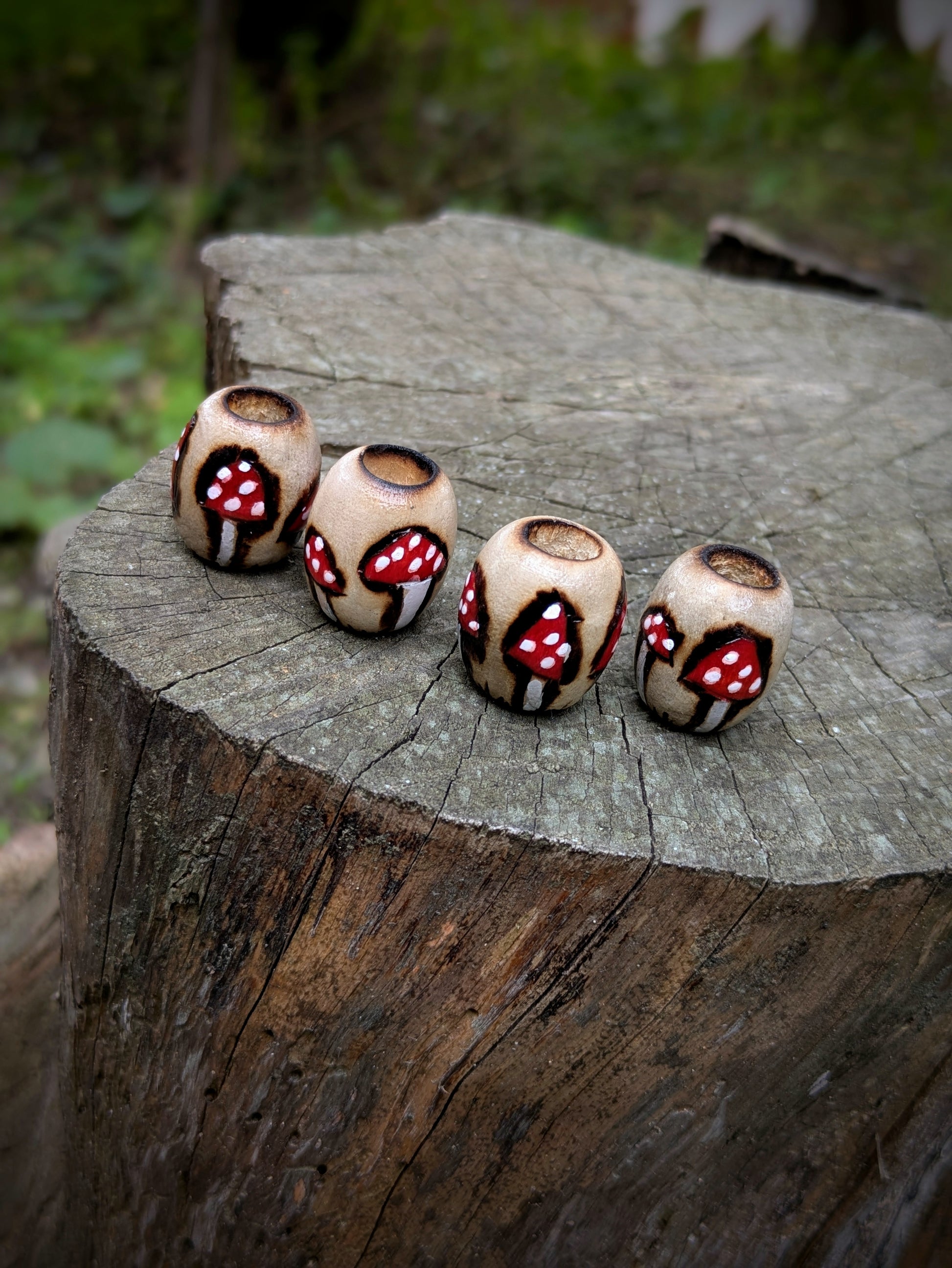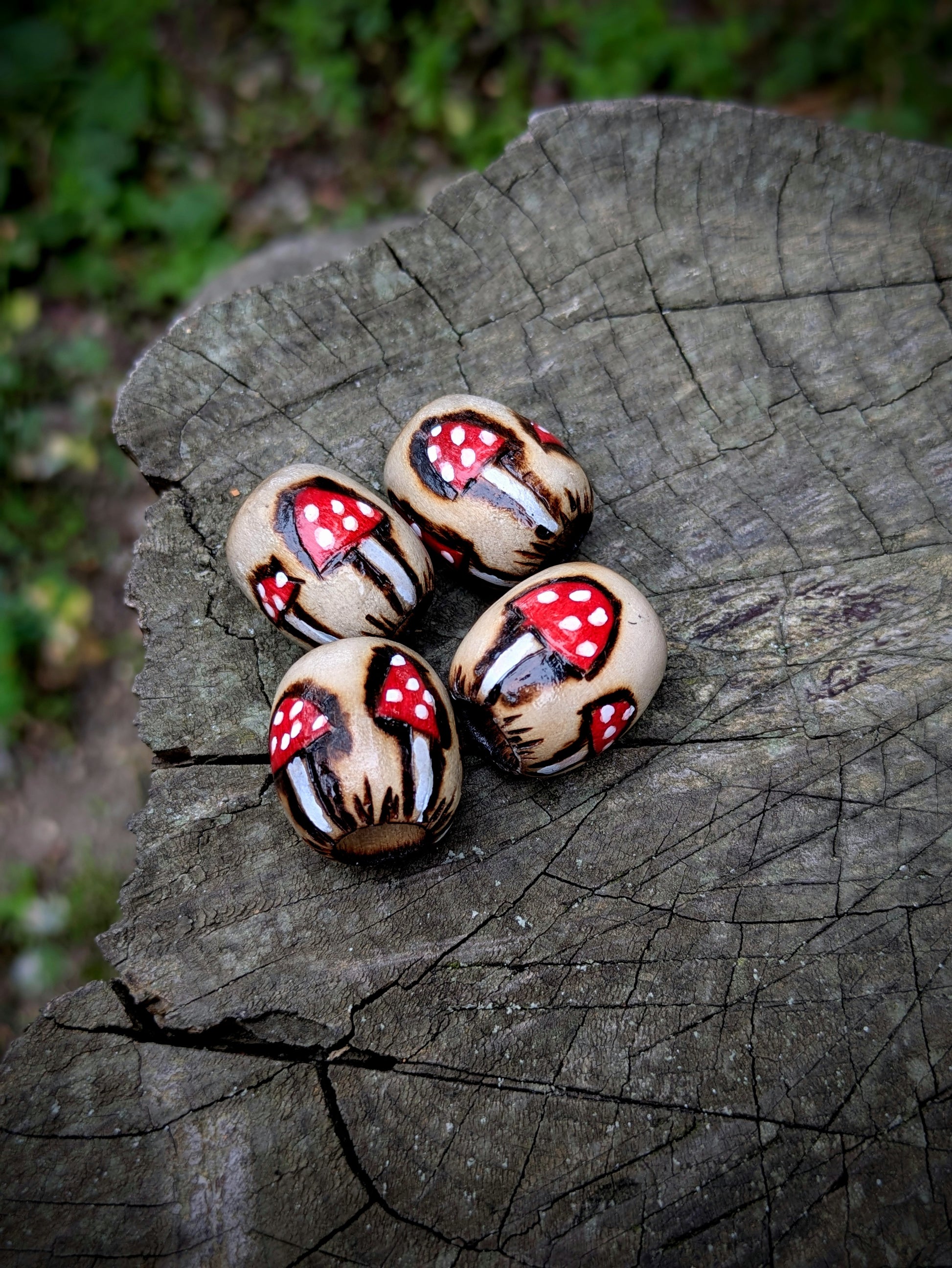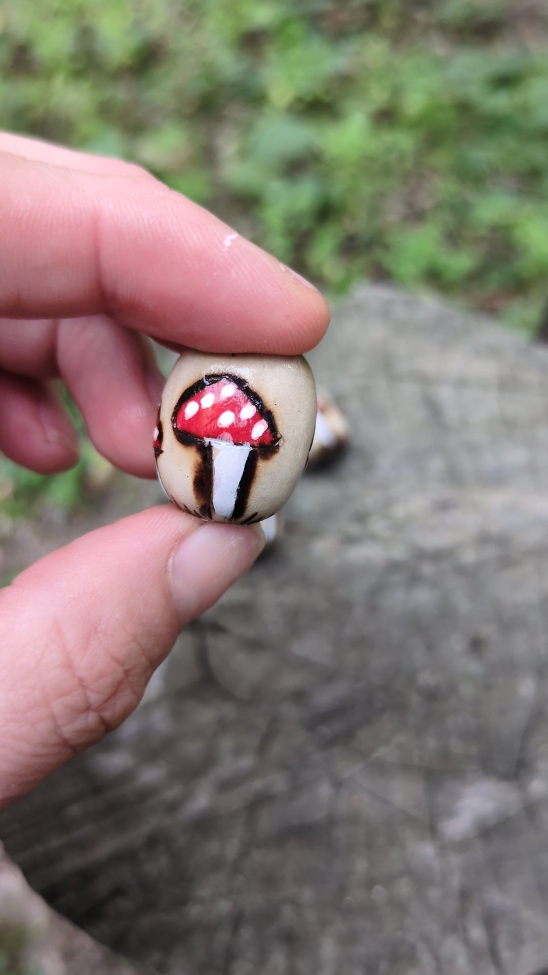 Ručně vypalovaný, barvený a lakovaný korálek z mé dílny s motivem muchomůrek.