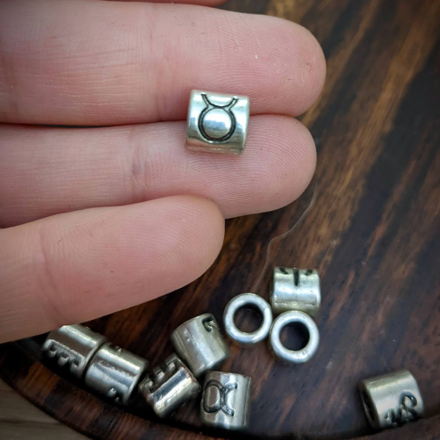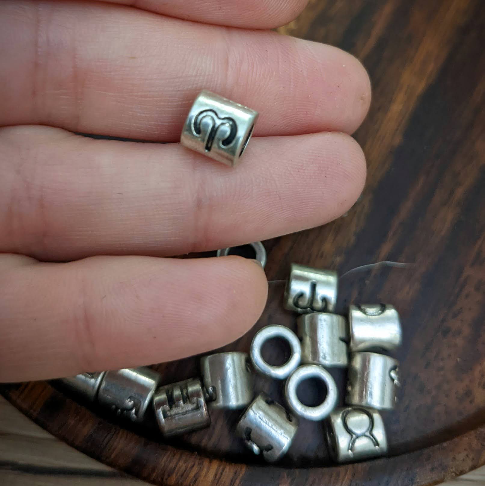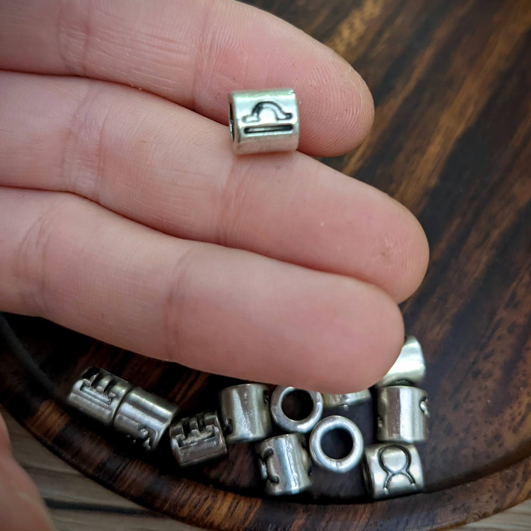 Kovové korálky s motivy znamení zvěrokruhu vhodné na tenké dready.