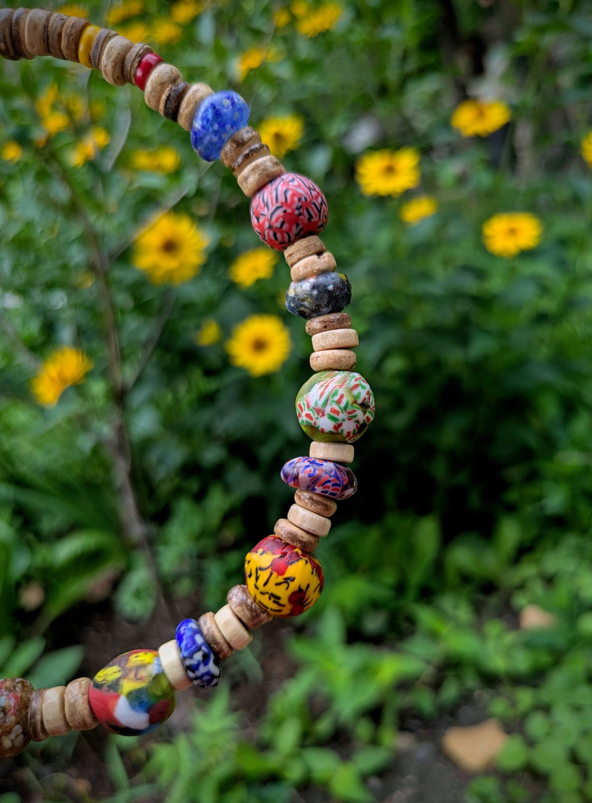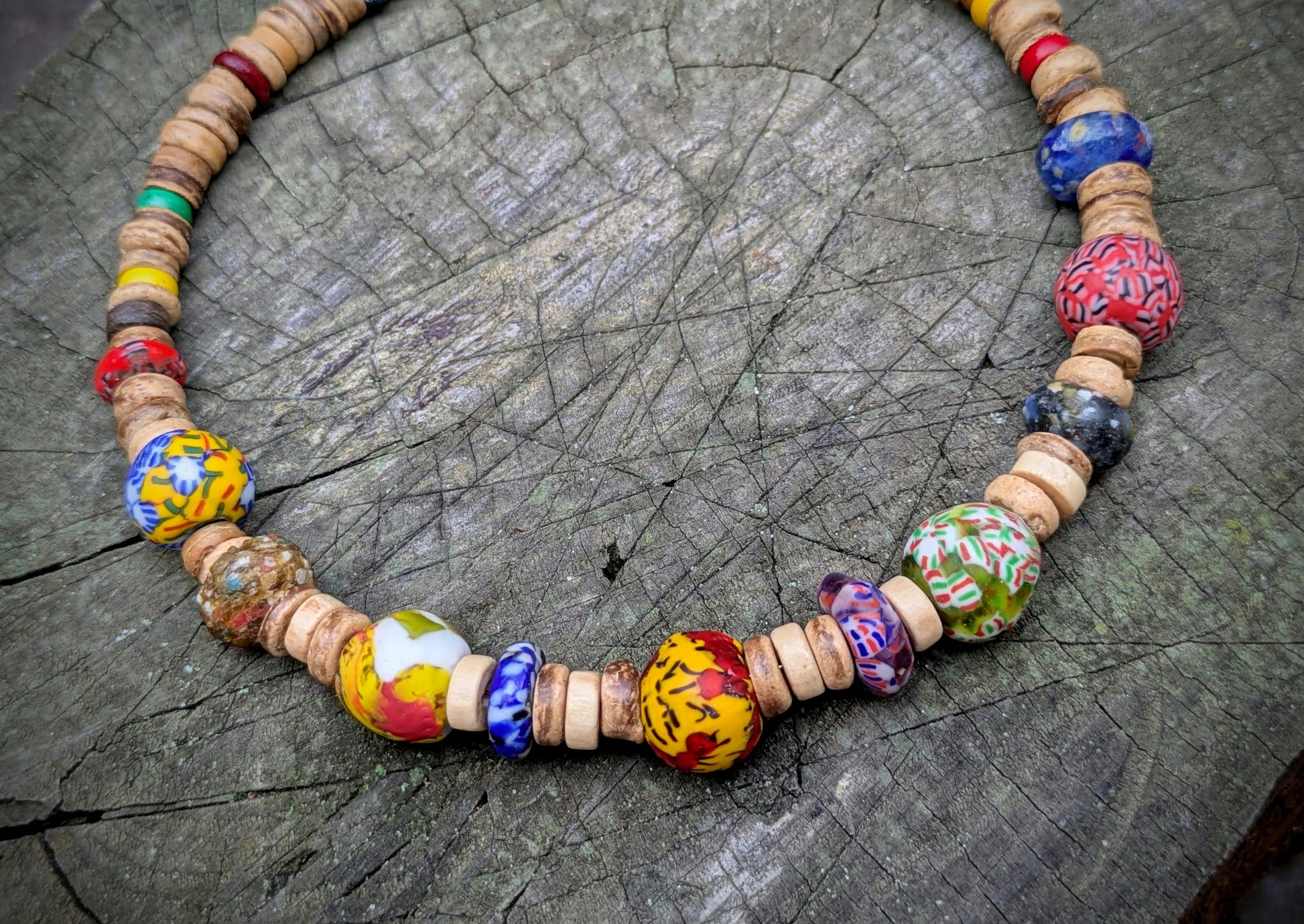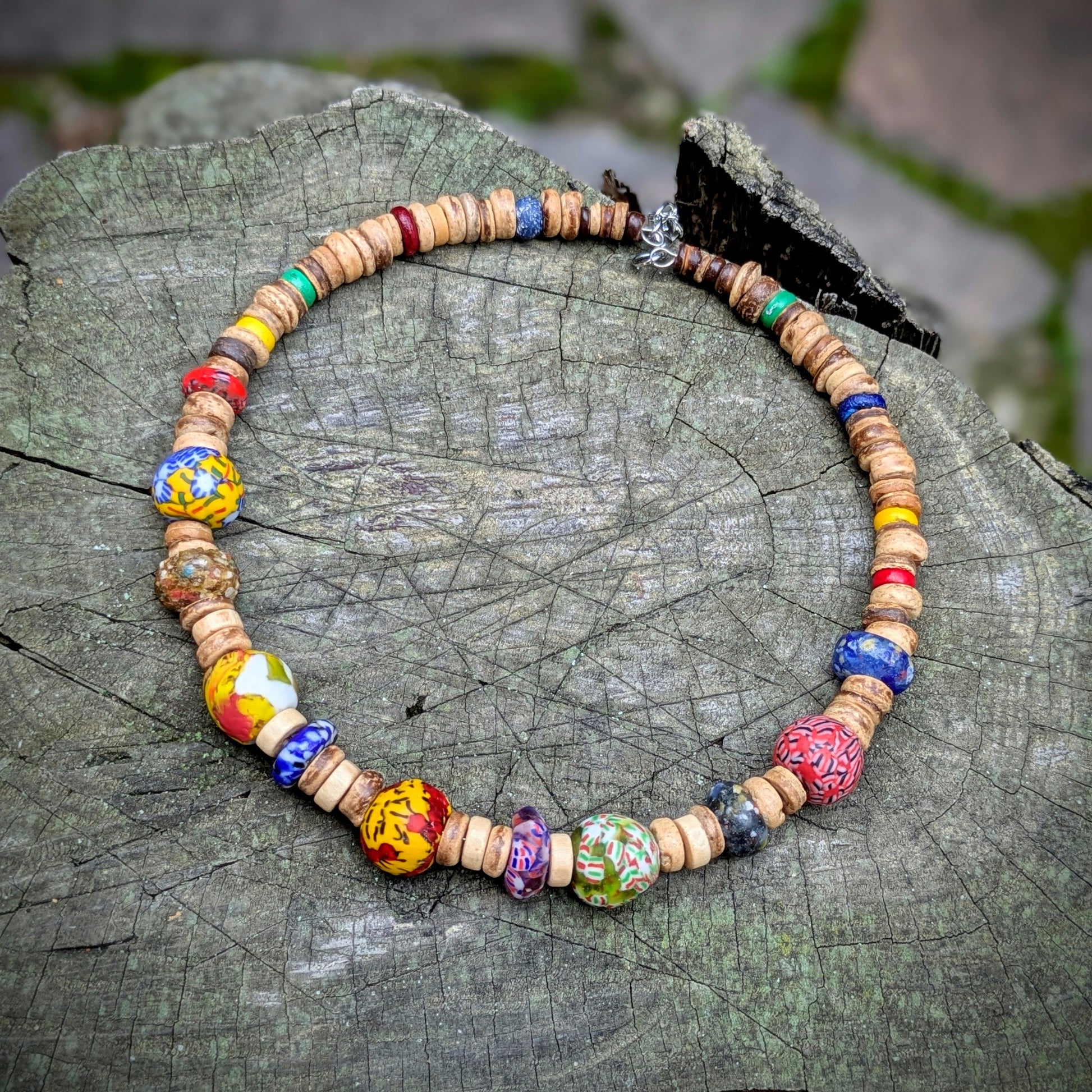 Náhrdelník je vytvořen z originálních afrických "krobo" korálků z recyklovaného skla, které se tradičně vyrábí v Ghaně, ty jsou doplněny korálky ze dřeva a z kokosu. Navlečeno na obruči, která je určena pro obvod krku 33-38 cm - lze regulovat karabinou a řetízkem. Řetízek a karabinka je z bižuterního kovu.