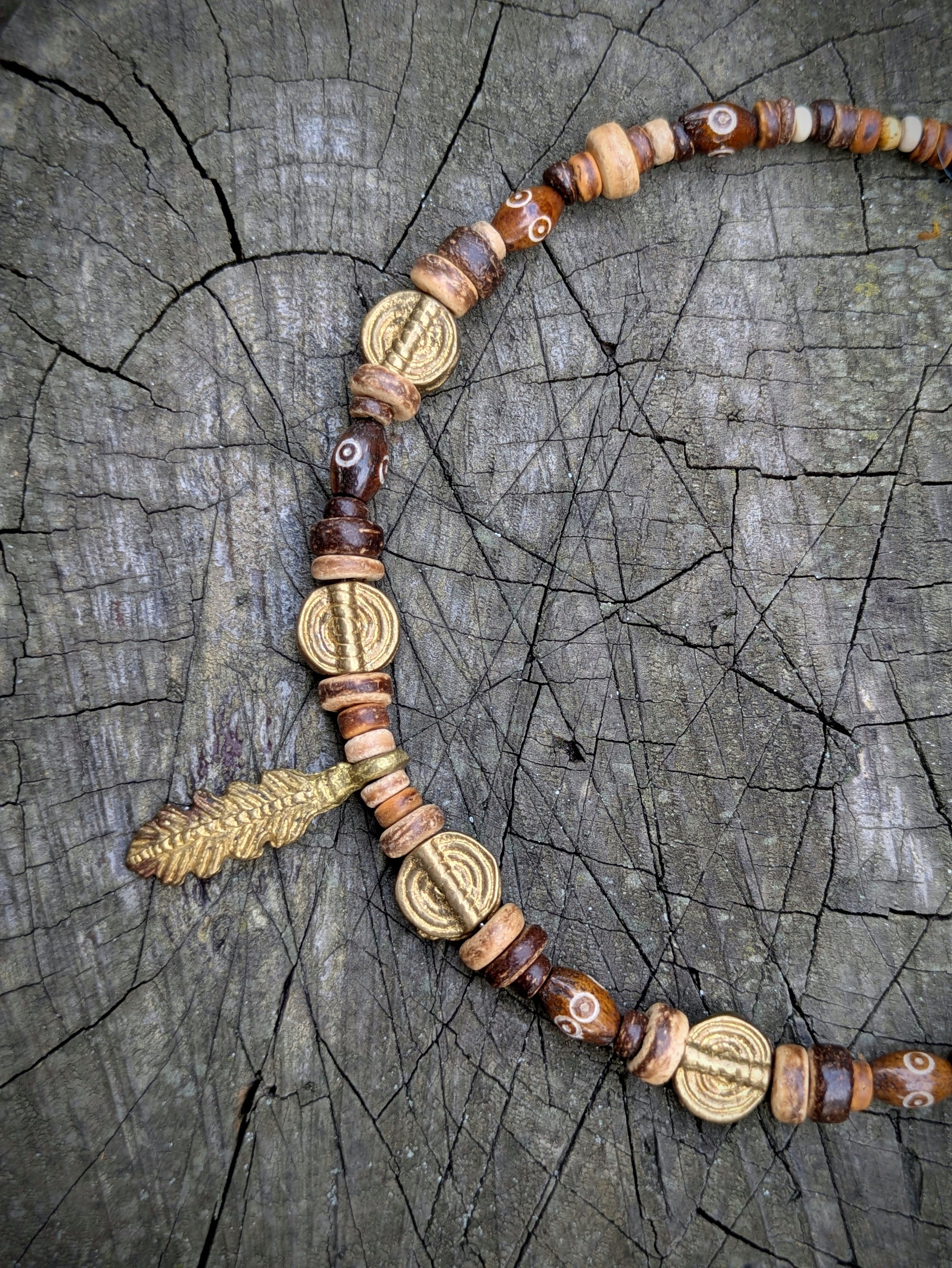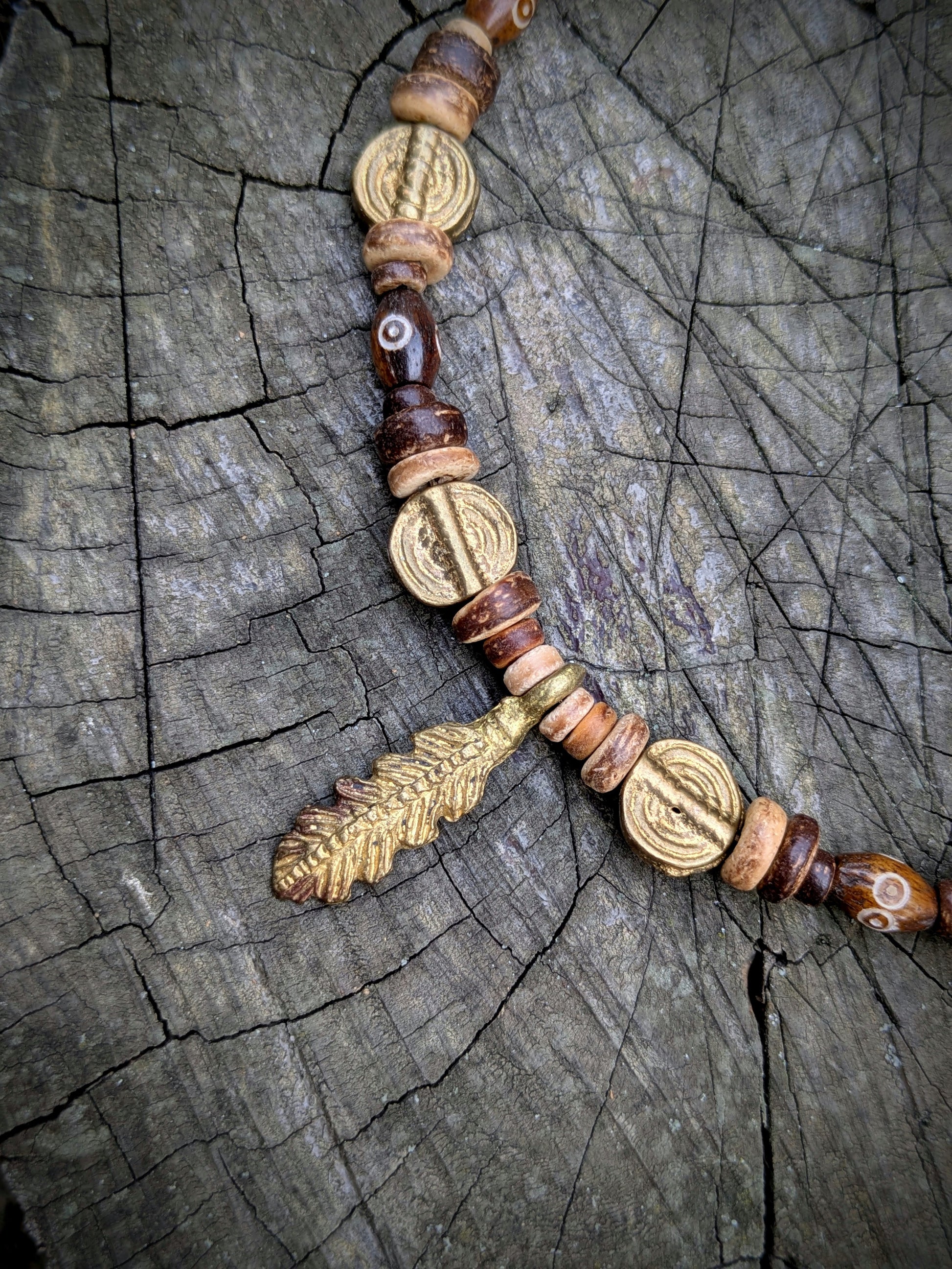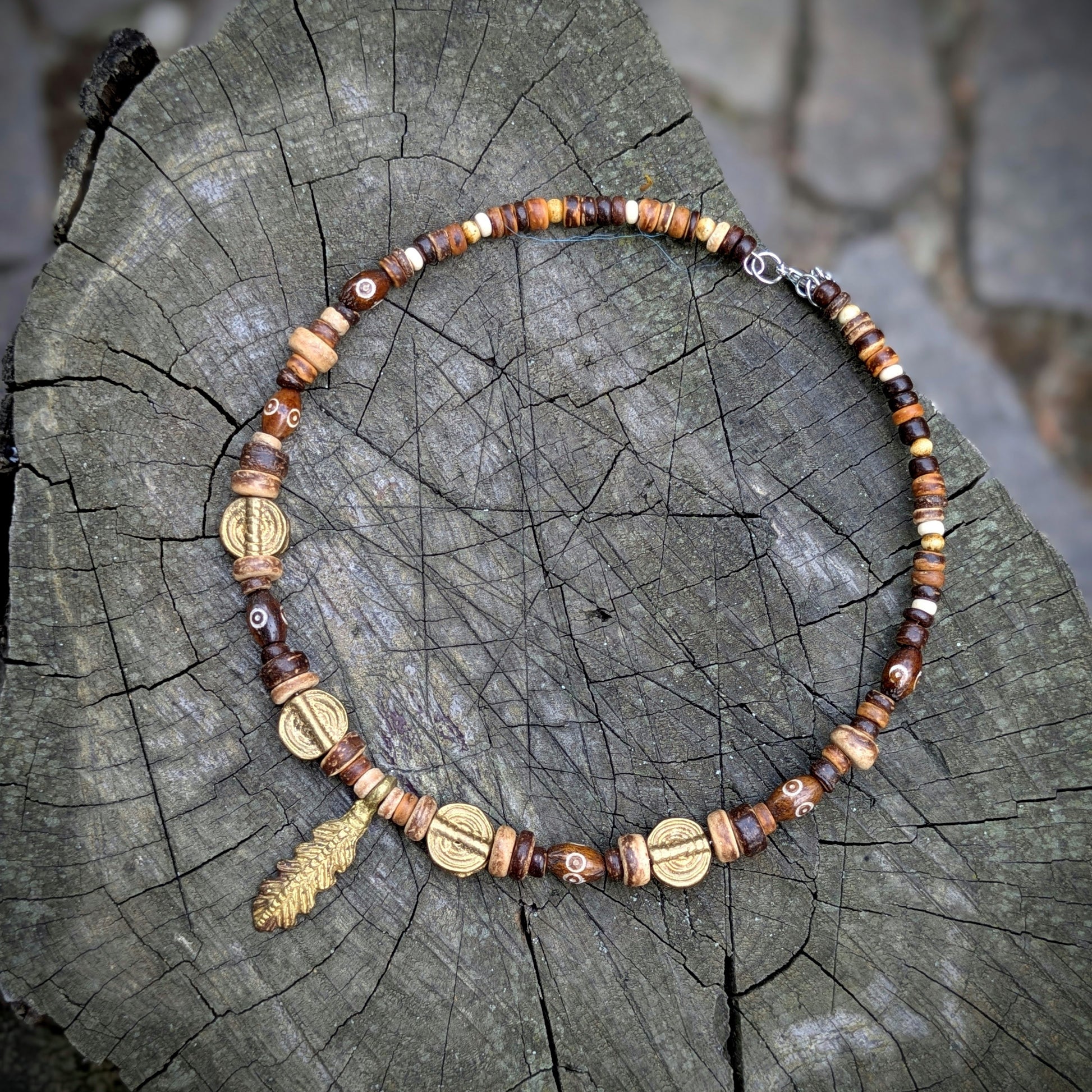 Náhrdelník je vytvořen z originálních mosazných korálků a přívěsku ve tvaru peříčka vyrobených v Ghaně, ty jsou doplněny korálky z kokosu a kosti. Navlečeno na obruči, která je určena pro obvod krku 33-38 cm - lze regulovat karabinou a řetízkem. Řetízek a karabinka je z bižuterního kovu.