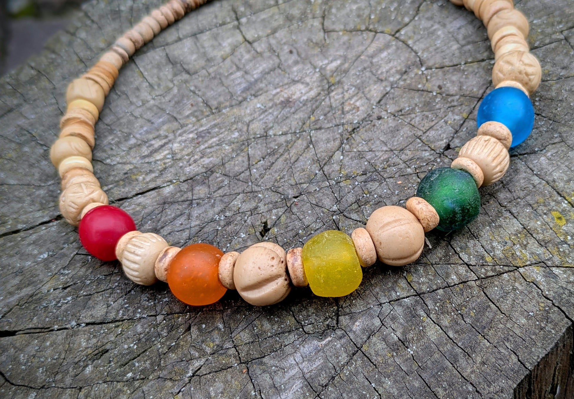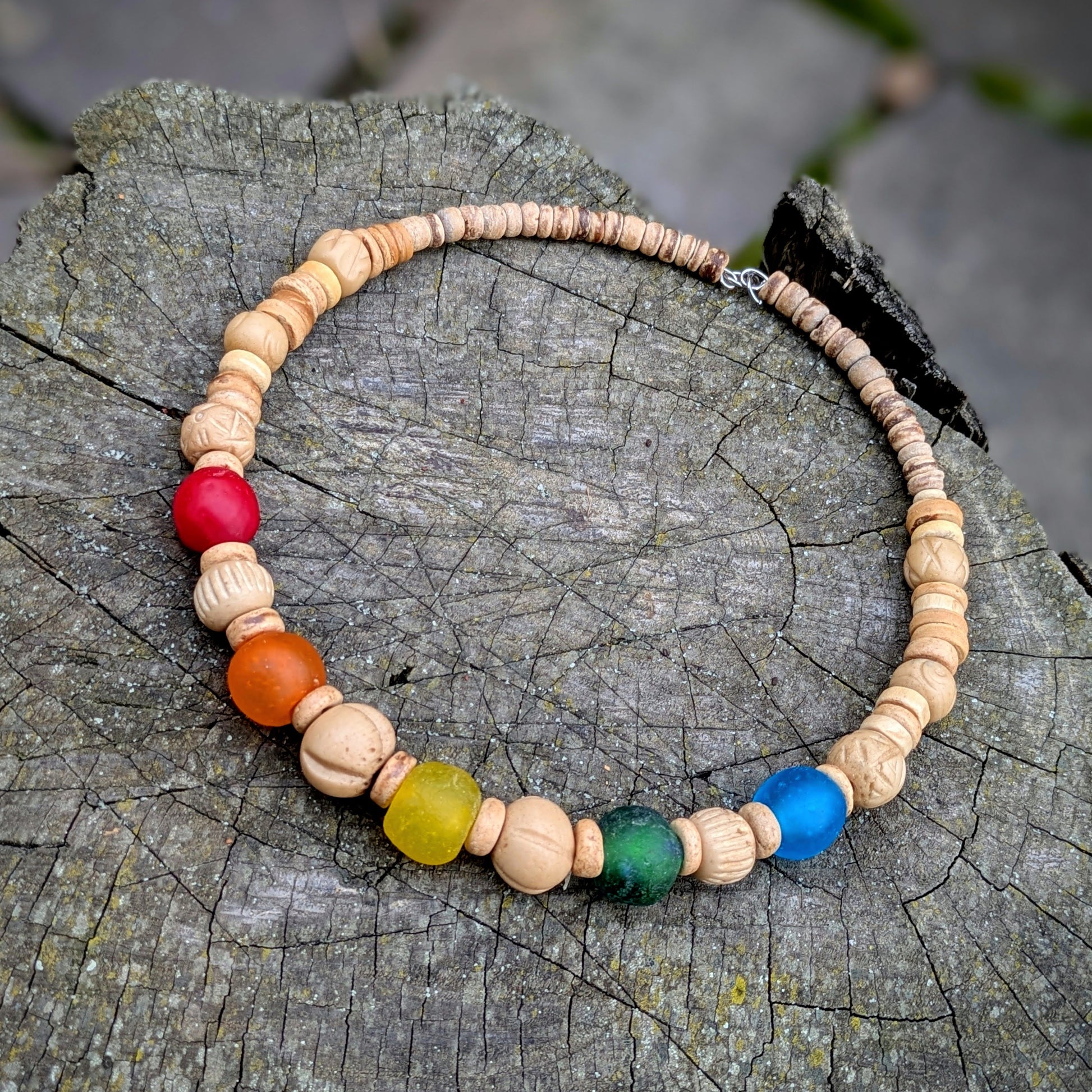 Náhrdelník je vytvořen z originálních afrických "krobo" korálků z recyklovaného skla, které se tradičně vyrábí v Ghaně, ty jsou doplněny korálky ze dřeva, kosti a z kokosu. Navlečeno na obruči, která je určena pro obvod krku 33-38 cm - lze regulovat karabinou a řetízkem. Řetízek a karabinka je z bižuterního kovu.