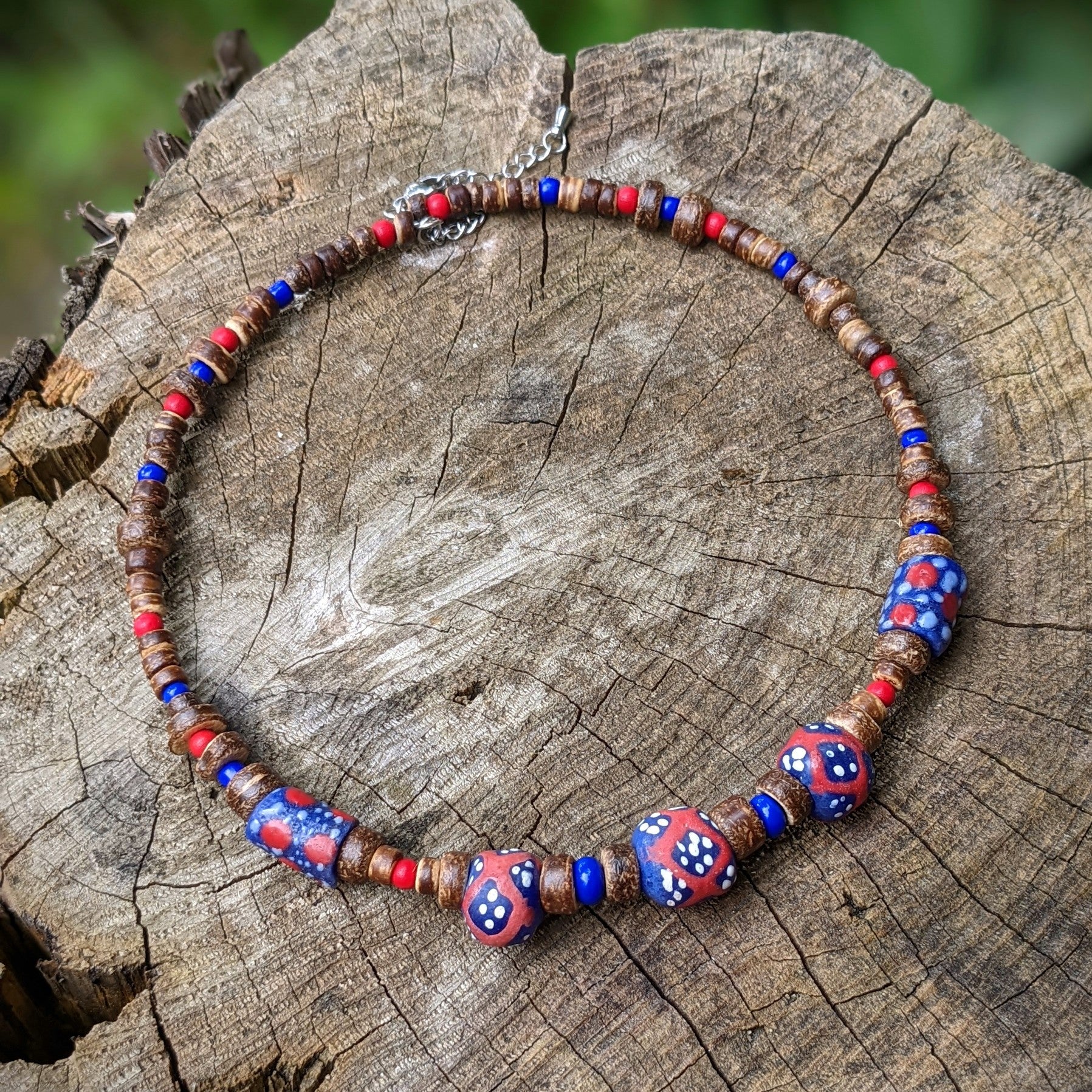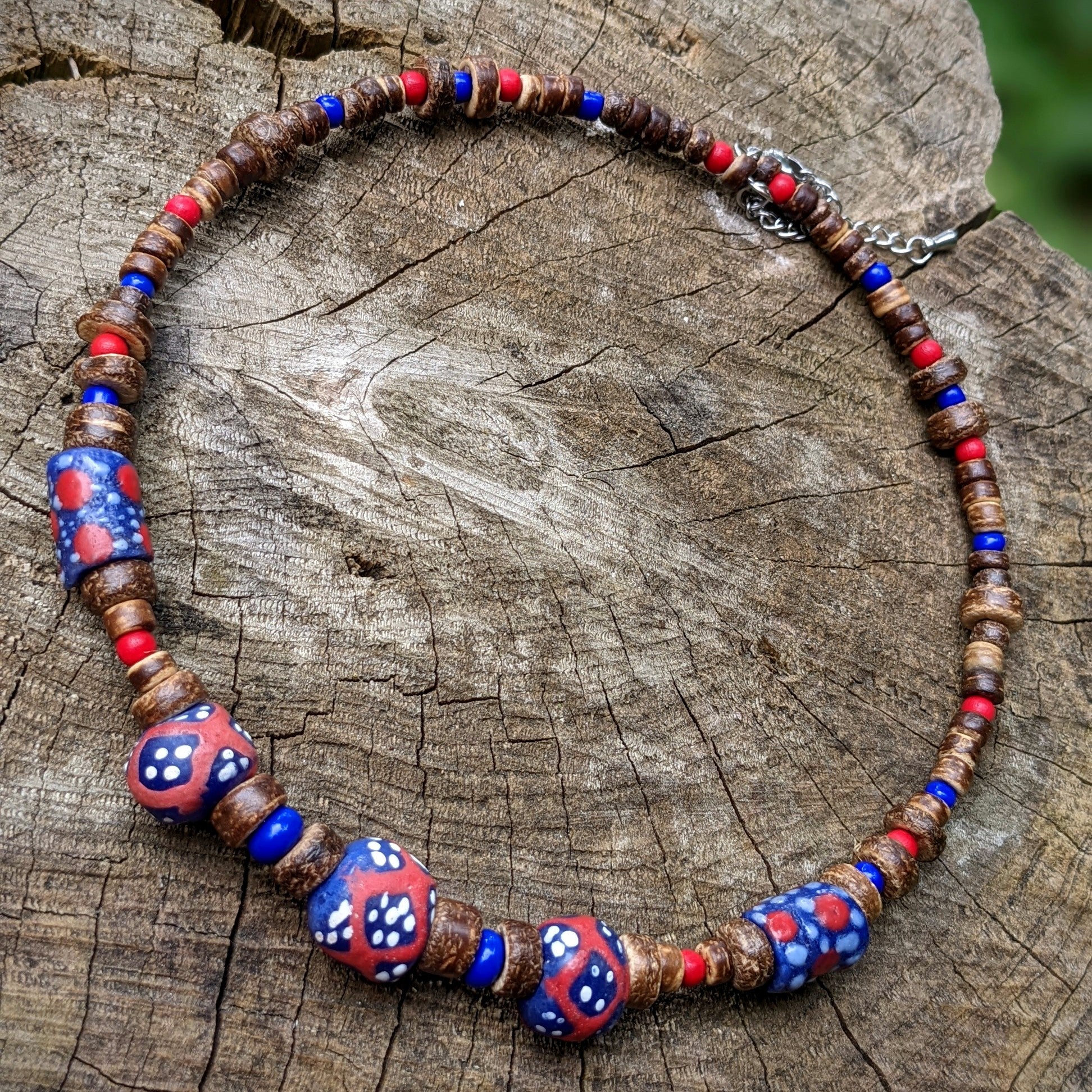Náhrdelník je vytvořen z originálních afrických "krobo" korálků z recyklovaného skla, které se tradičně vyrábí v Ghaně. Ty jsou doplněny dřevěnými, skleněnými a kokosovými korálkami. Navlečeno na paměťovém drátku pro obvod krku 33-38 cm - lze regulovat karabinou a řetízkem. Řetízek a karabinka jsou z chirurgické oceli kovu.
