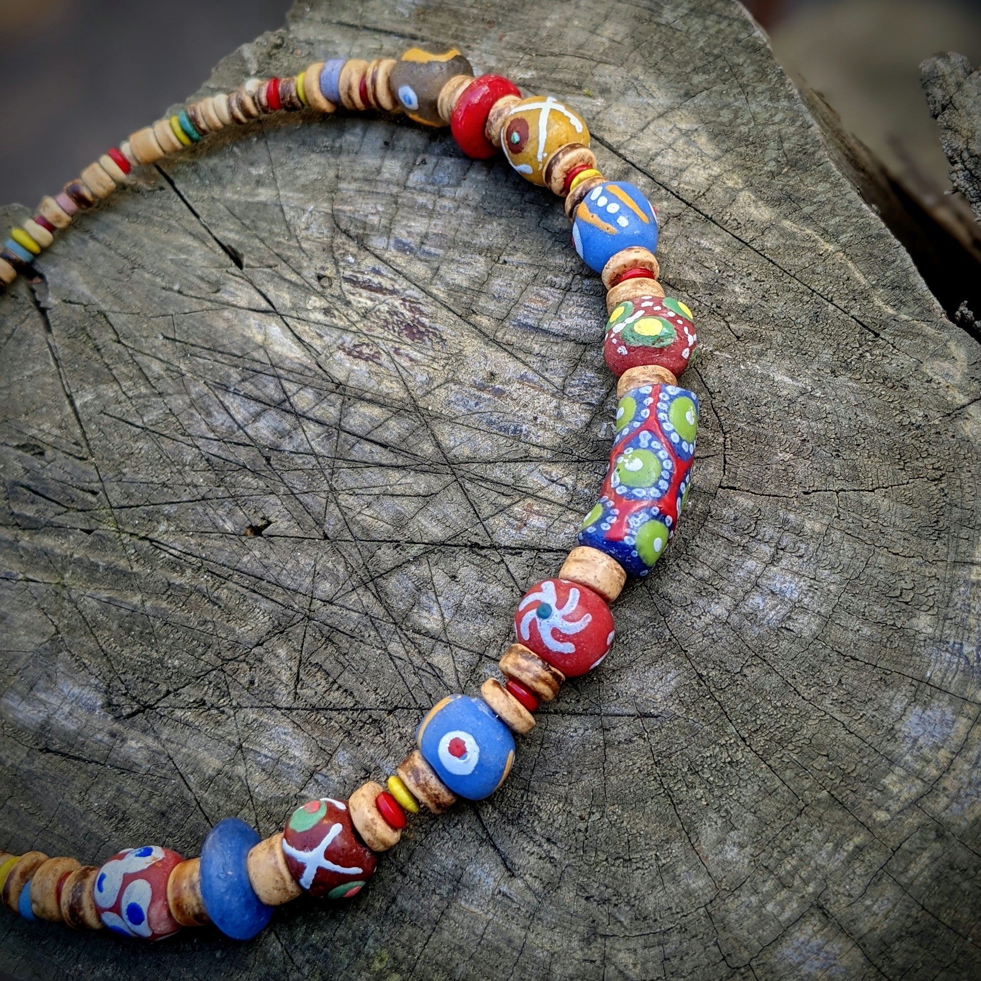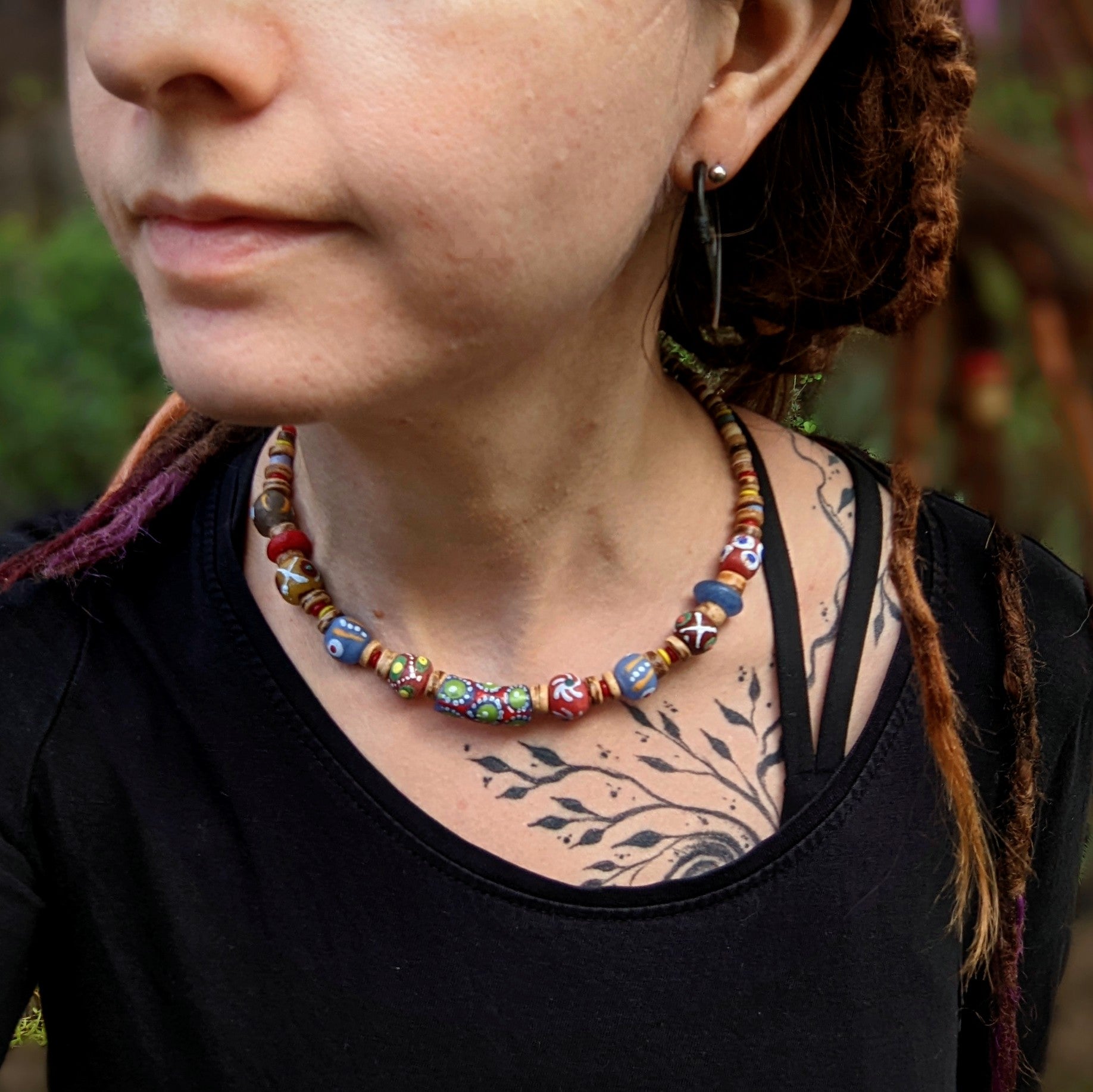 Náhrdelník je vytvořen z originálních afrických "krobo" korálků z recyklovaného skla, které se tradičně vyrábí v Ghaně, které jsou doplněny dřevěnými a kokosovými koralkami. Navlečeno na obruči, která je určena pro obvod krku 33-38 cm - lze regulovat karabinou a řetízkem. Řetízek a karabinka je z bižuterního kovu.
