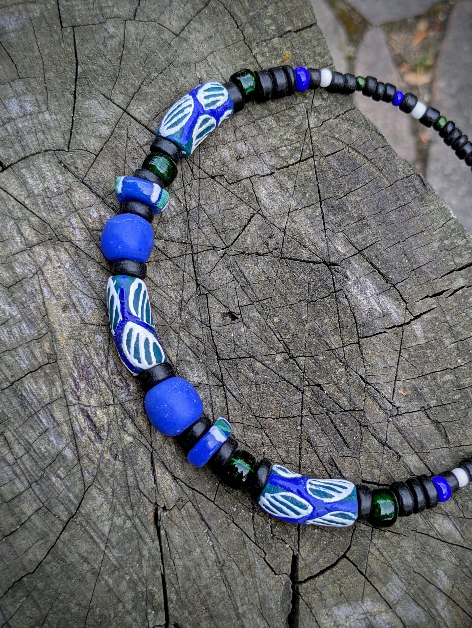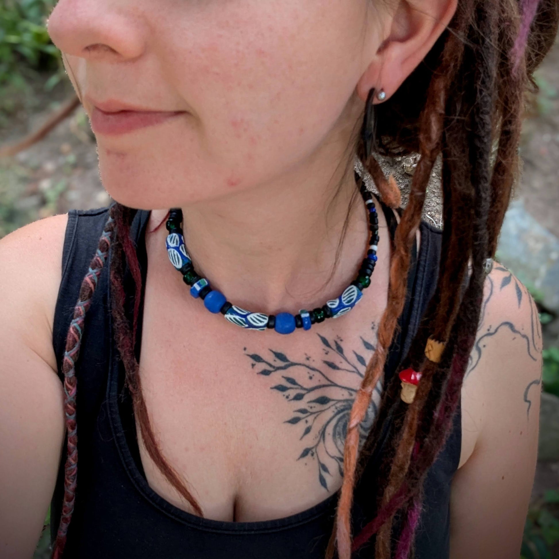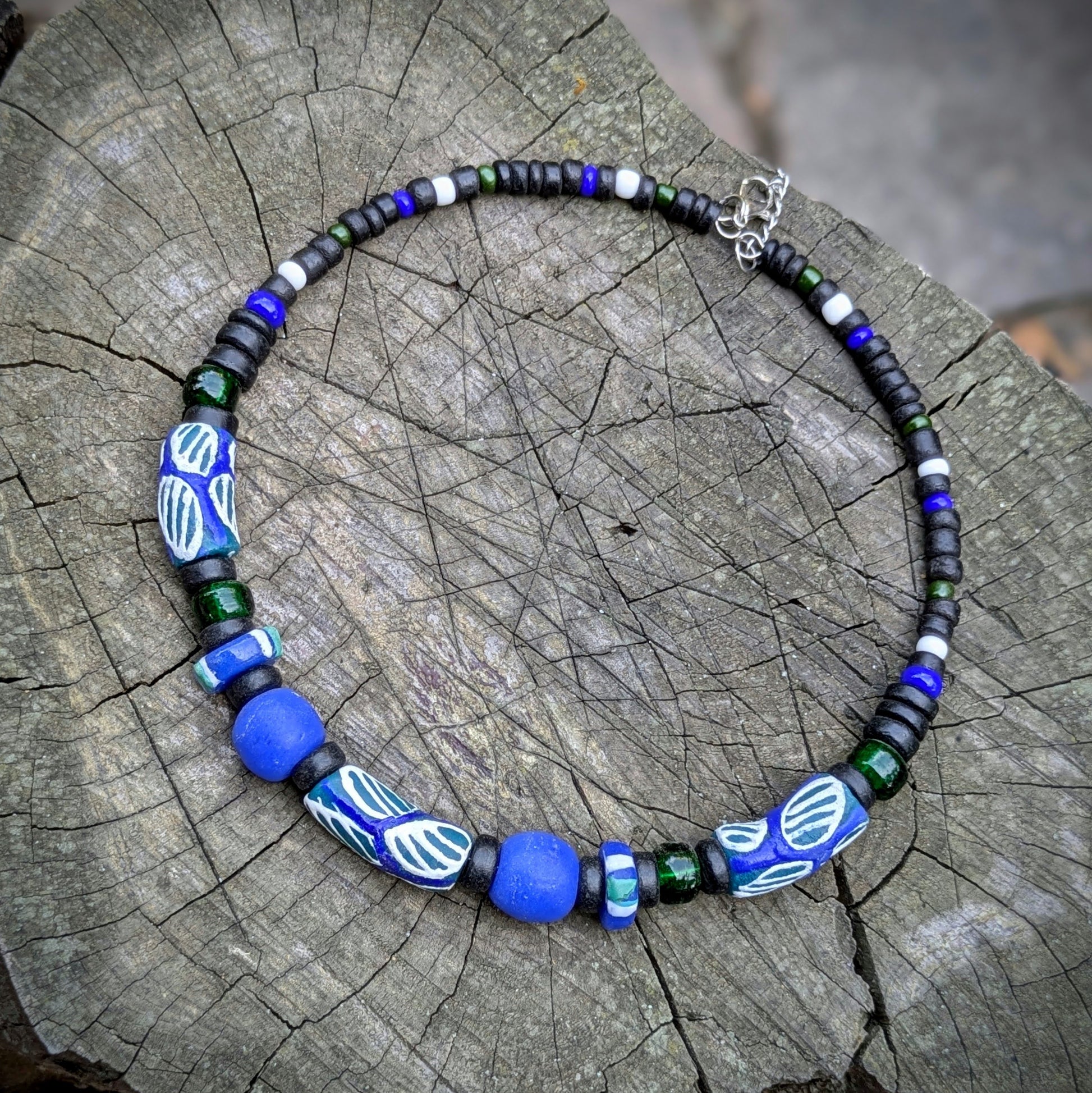 Náhrdelník je vytvořen z originálních afrických "krobo" korálků z recyklovaného skla, které se tradičně vyrábí v Ghaně, ty jsou doplněny korálky z kokosu. Navlečeno na obruči, která je určena pro obvod krku 33-38 cm - lze regulovat karabinou a řetízkem. Řetízek a karabinka je z bižuterního kovu.