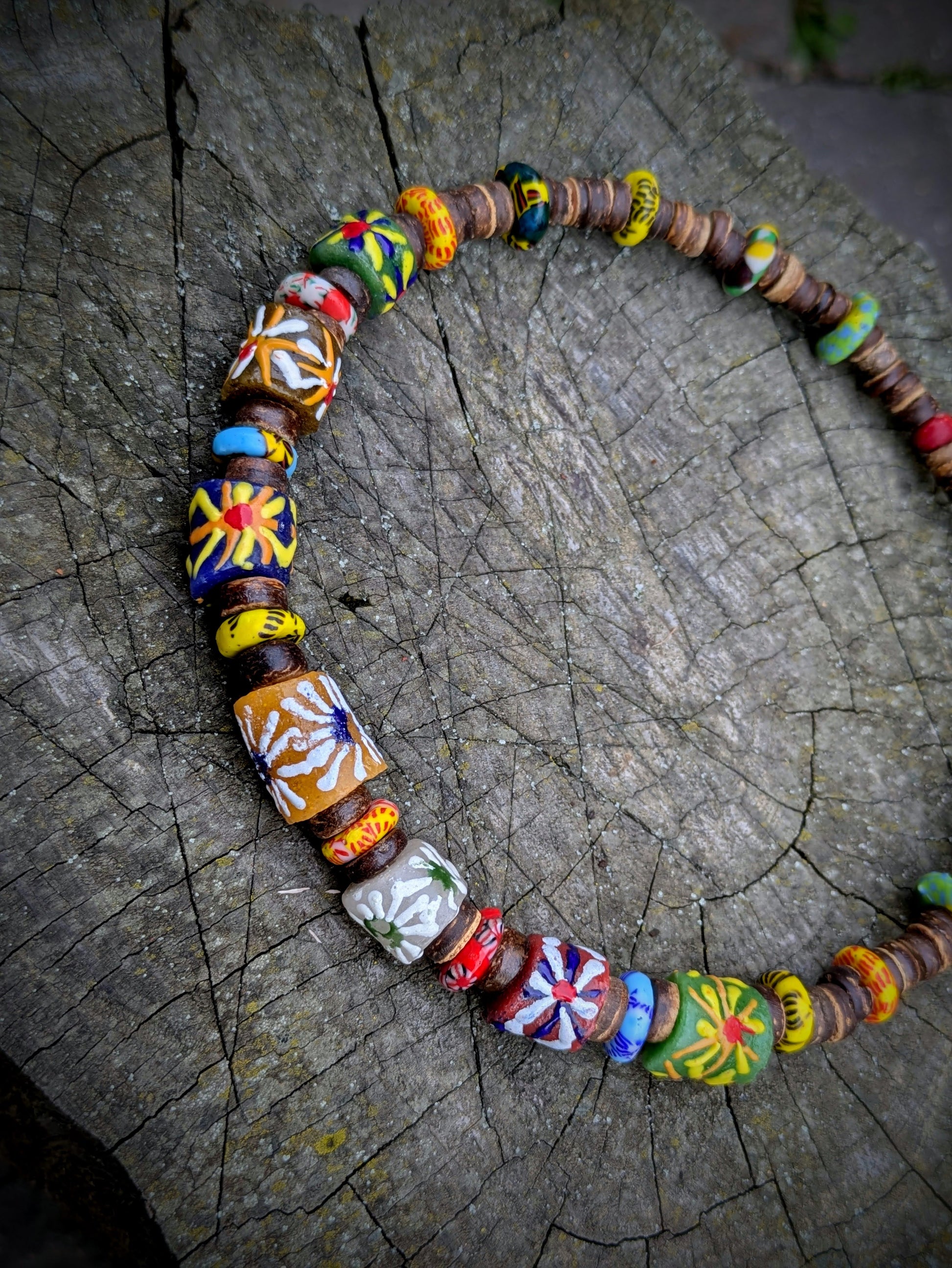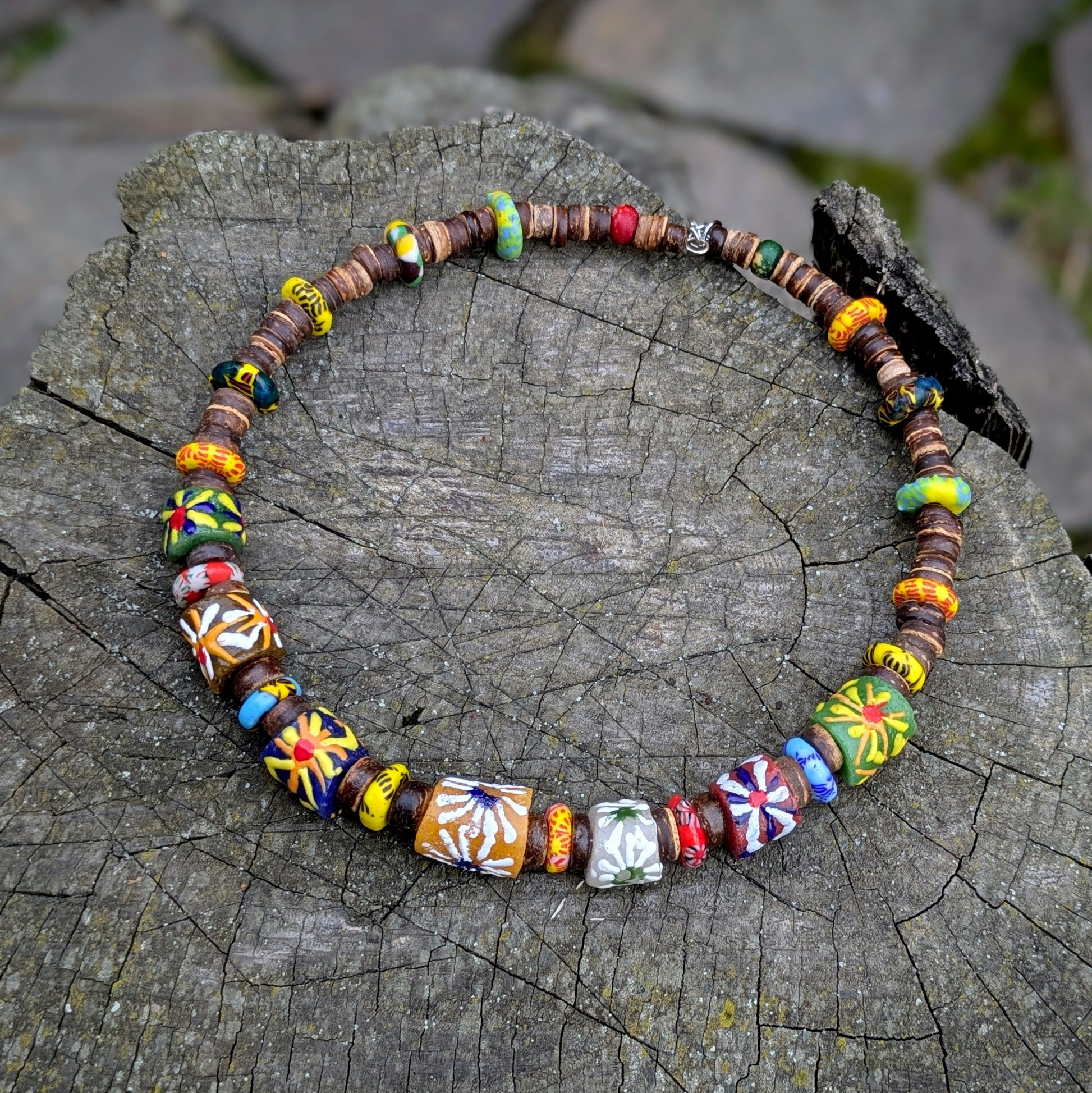 Náhrdelník je vytvořen z originálních afrických "krobo" korálků z recyklovaného skla, které se tradičně vyrábí v Ghaně, ty jsou doplněny korálky ze dřeva a z kokosu. Navlečeno na obruči, která je určena pro obvod krku 33-38 cm - lze regulovat karabinou a řetízkem. Řetízek a karabinka je z bižuterního kovu.