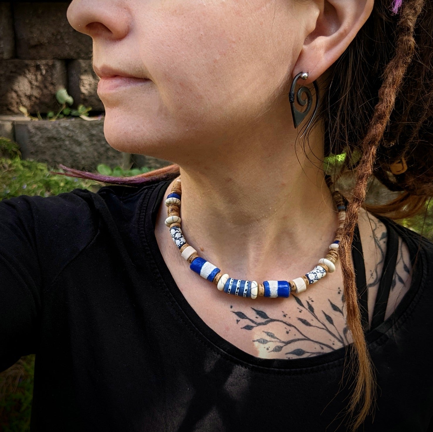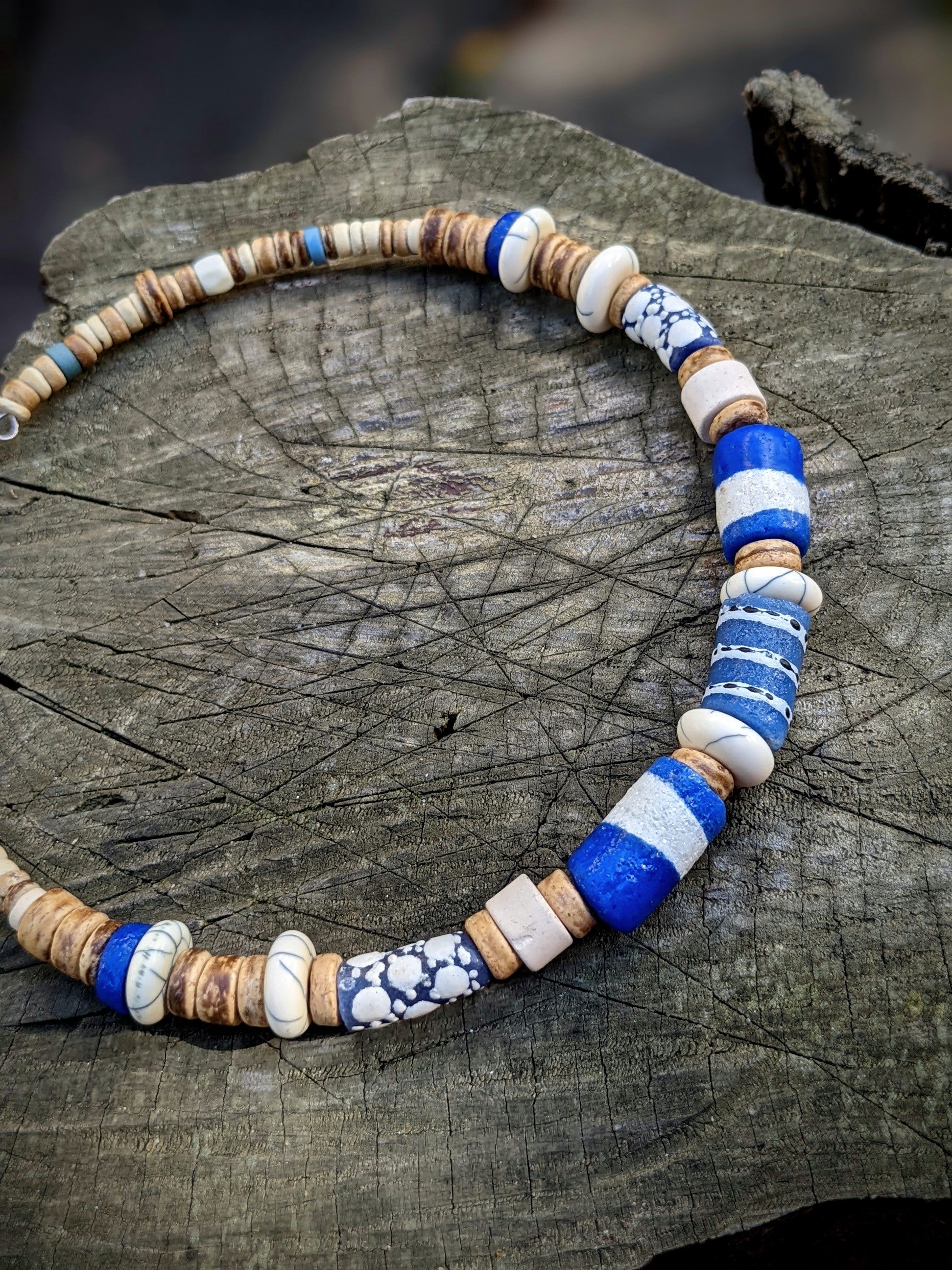 Náhrdelník je vytvořen z originálních afrických "krobo" korálků z recyklovaného skla, které se tradičně vyrábí v Ghaně. Ty jsou doplněny kokosovými a keramickými korálkami. Navlečeno na obruči, která je určena pro obvod krku 33-38 cm - lze regulovat karabinou a řetízkem. Řetízek a karabinka je z bižuterního kovu.